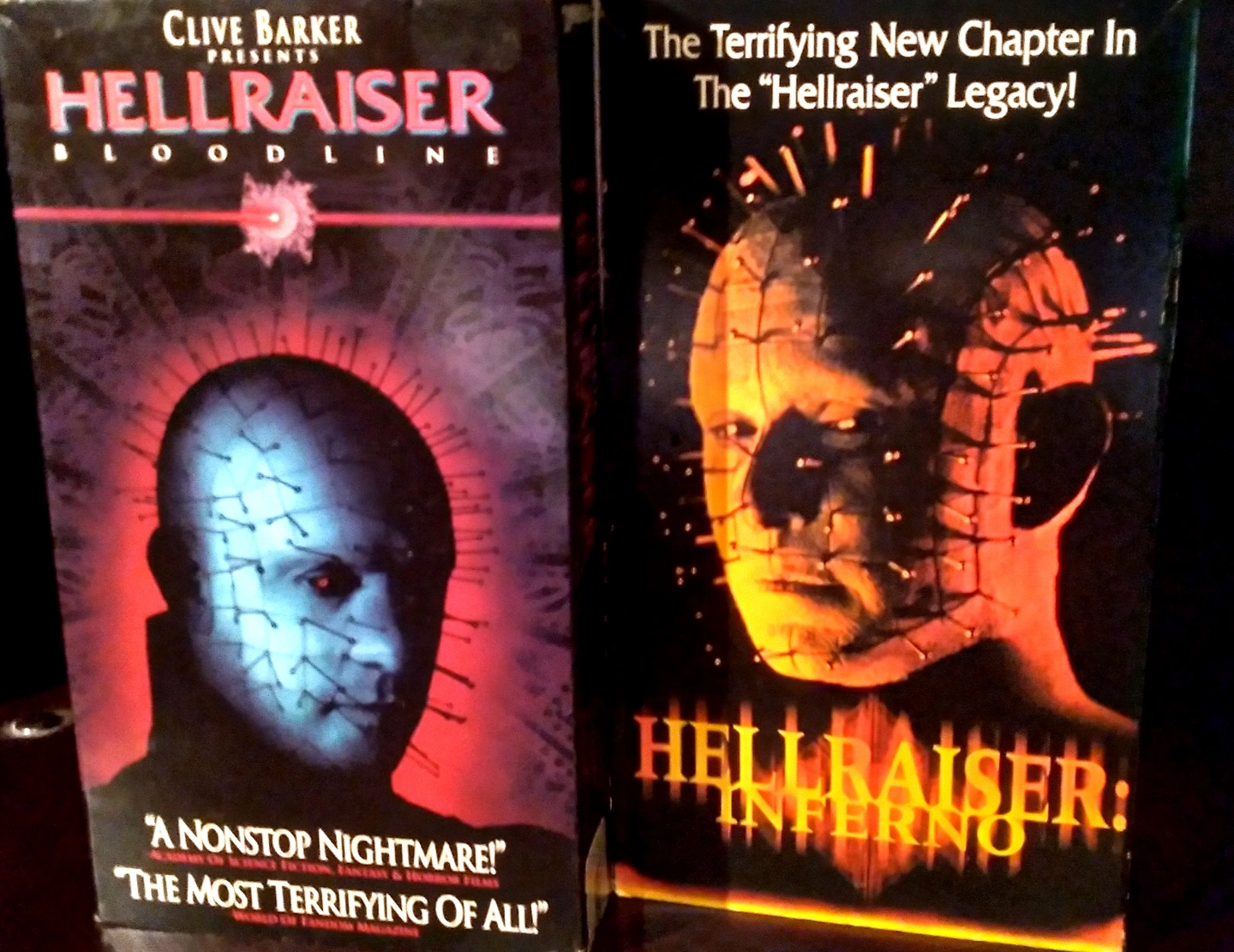 2 VINTAGE COLLECTIBLE HORROR MOVIE CASSETTES - HELLRAISER: BLOODLINE & HELLRAISER: INFERNO. PART'S 4 AND 5 IN THE HELLRAISER SERIES. WELL PRESERVED CONDITION. SEE PHOTOS. ONE IS A FORMER BLOCKBUSTER RENTAL. BOTH ARE REWOUND. TESTED AND VIEWED WITHOUT ISSUE ON A LATE-MODEL, FUNCTIONING HITACHI VCR. $20 each -or- both for $30 CASH AND PICK-UP ONLY. QUEEN ST EAST AND BROADVIEW. RIVERSIDE