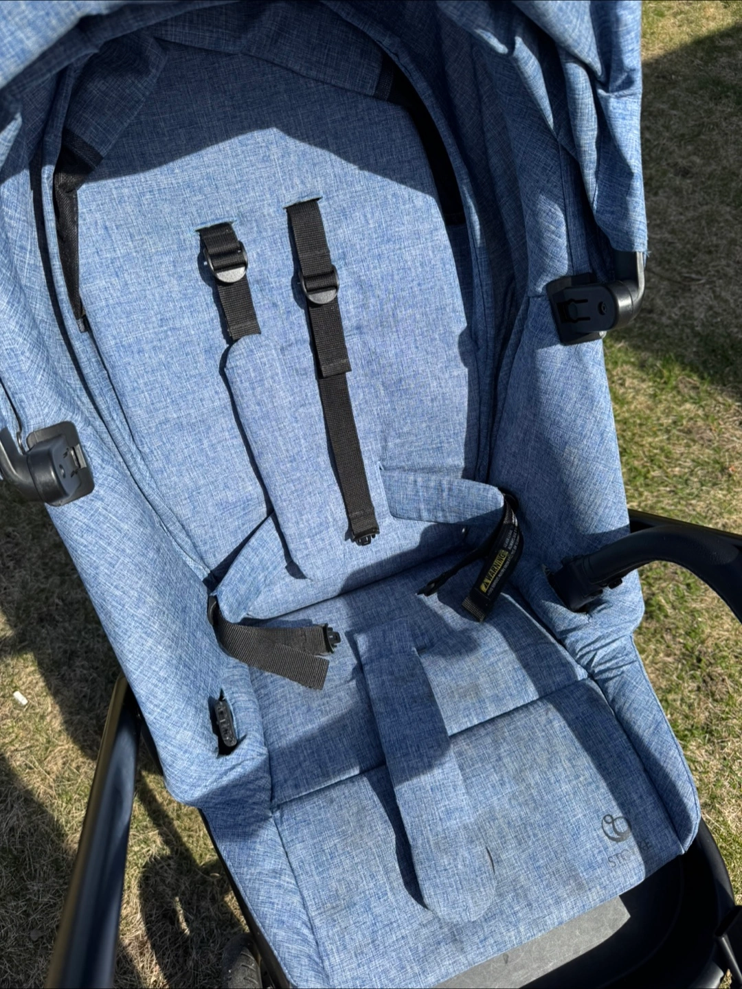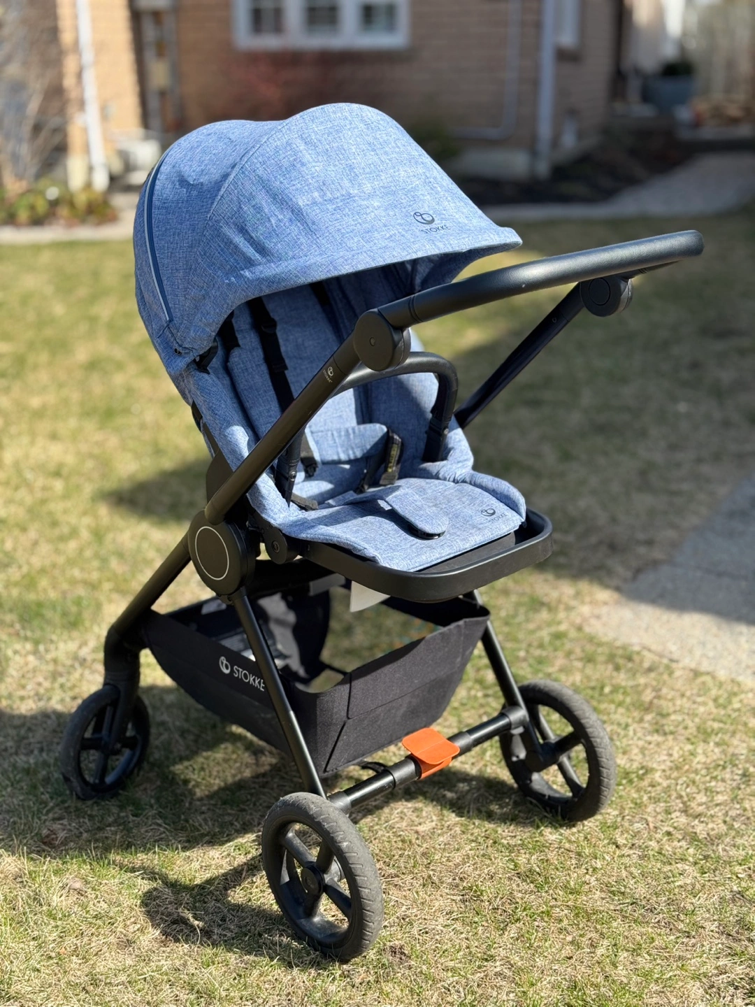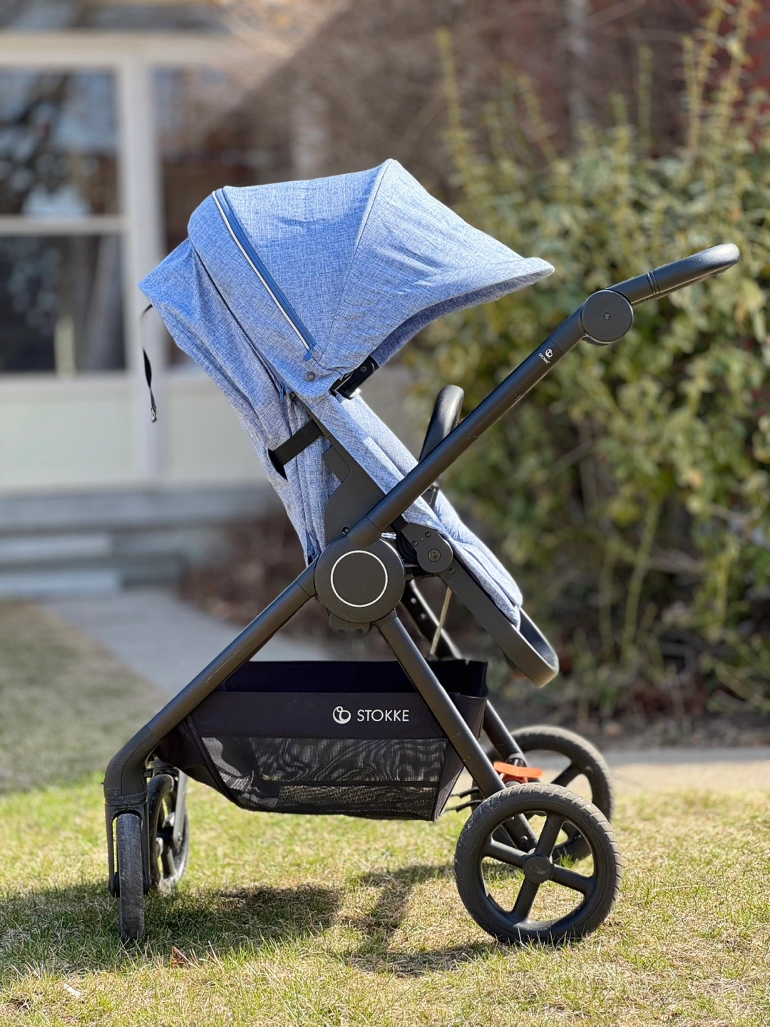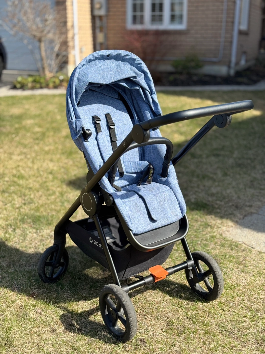Lightly used Stokke Xplory X stroller. Denim blue fabric. Includes undercarriage storage basket. Small signs of wear.