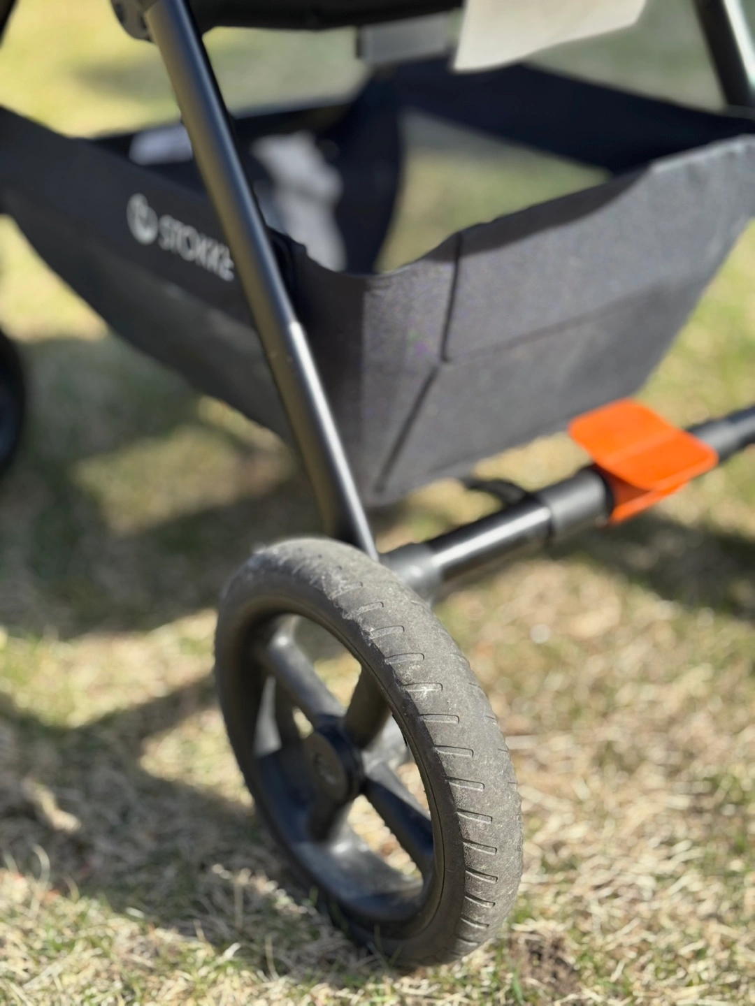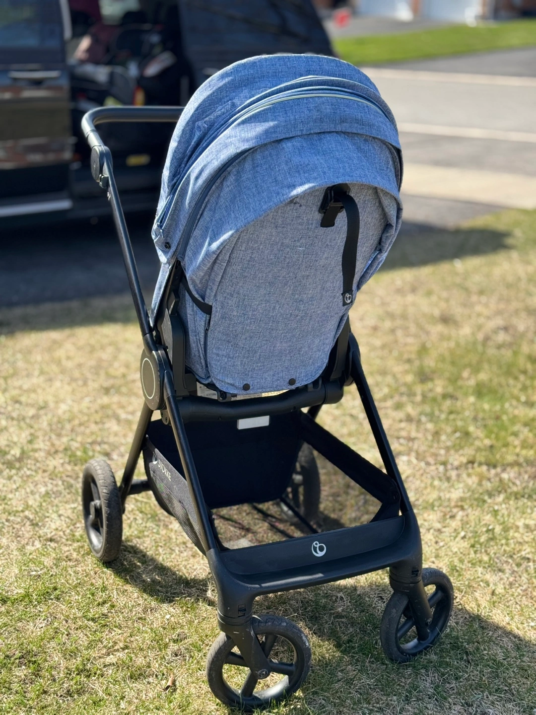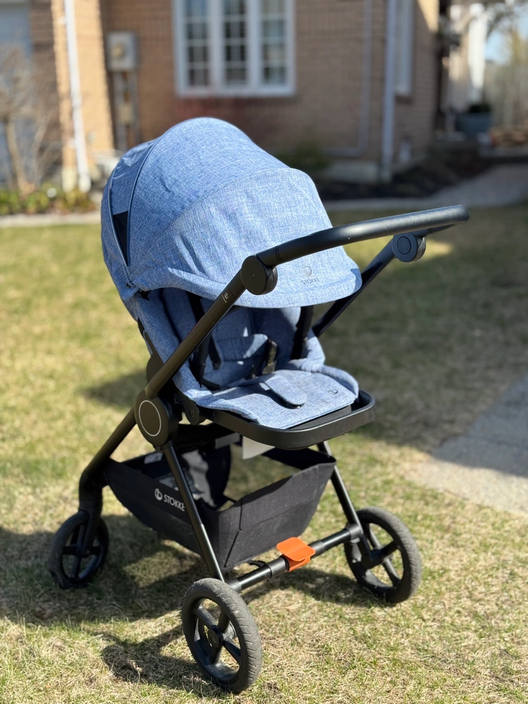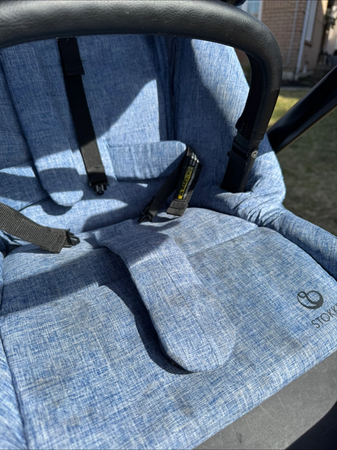Lightly used Stokke Xplory X stroller. Denim blue fabric. Includes undercarriage storage basket. Small signs of wear.