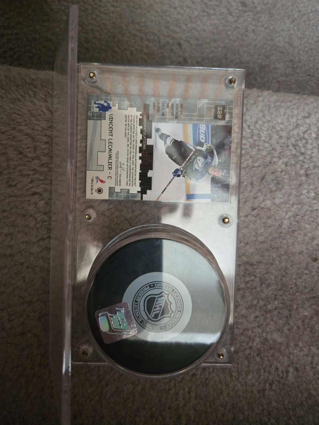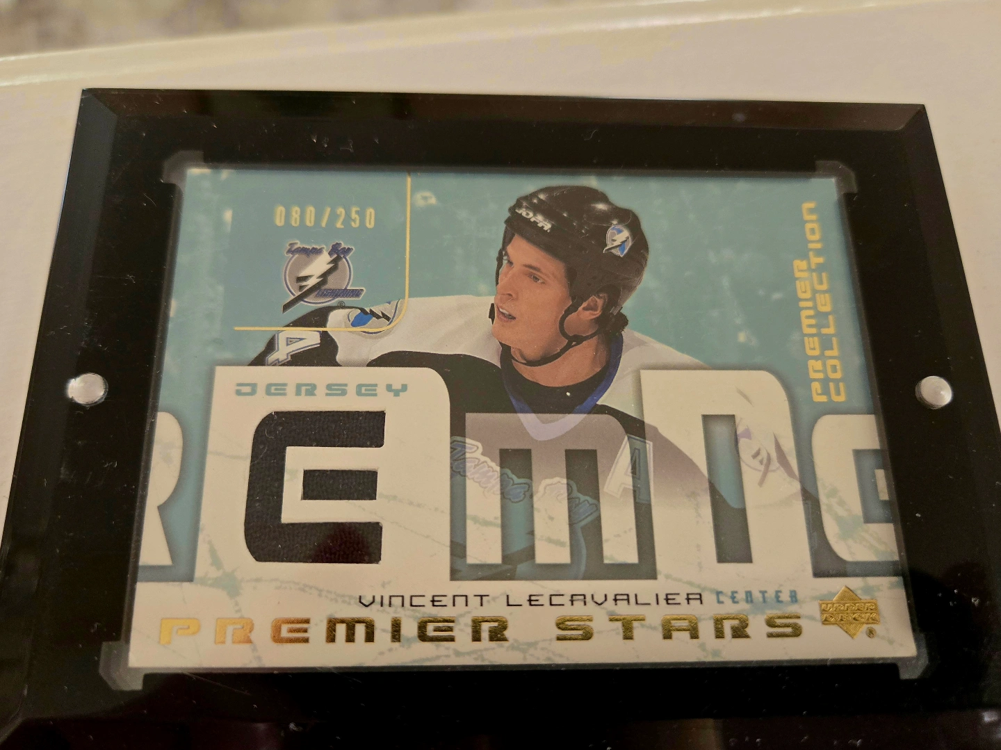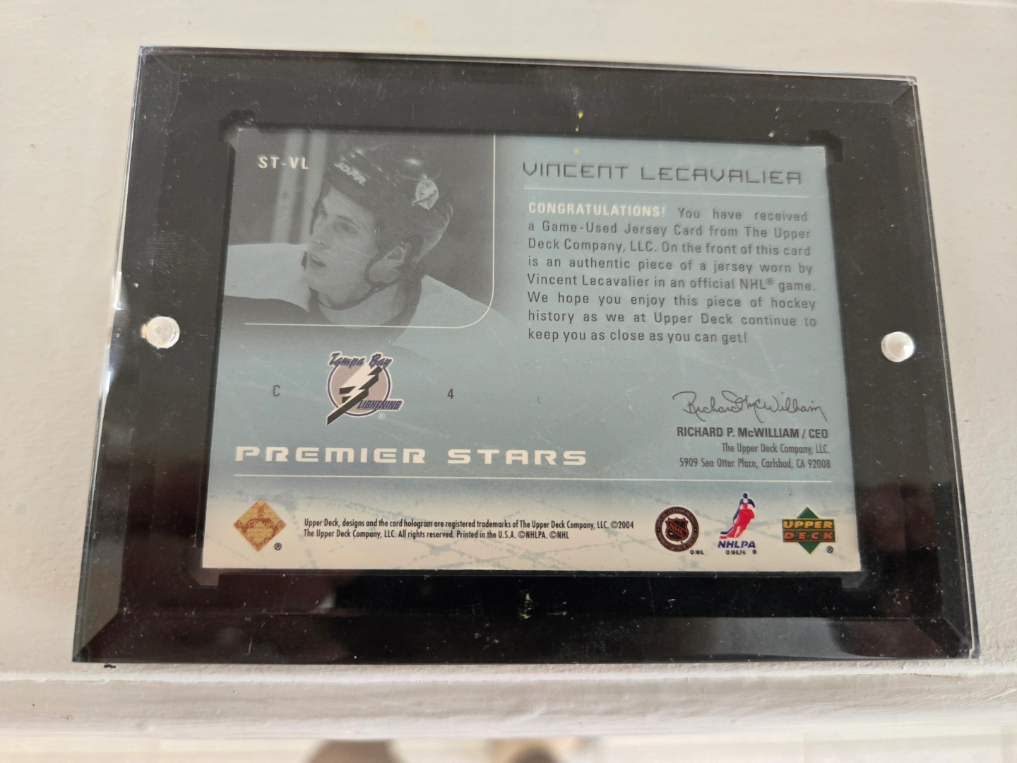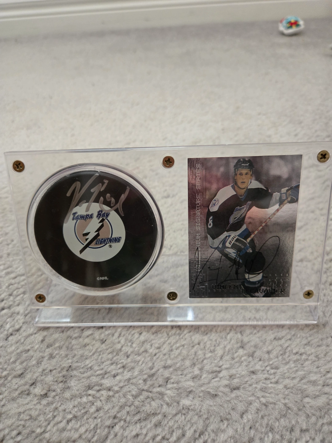 Vincent Lecavalier signed hockey puck and card in a plastic stand and Vincent Lecavalier Premier Collection Card