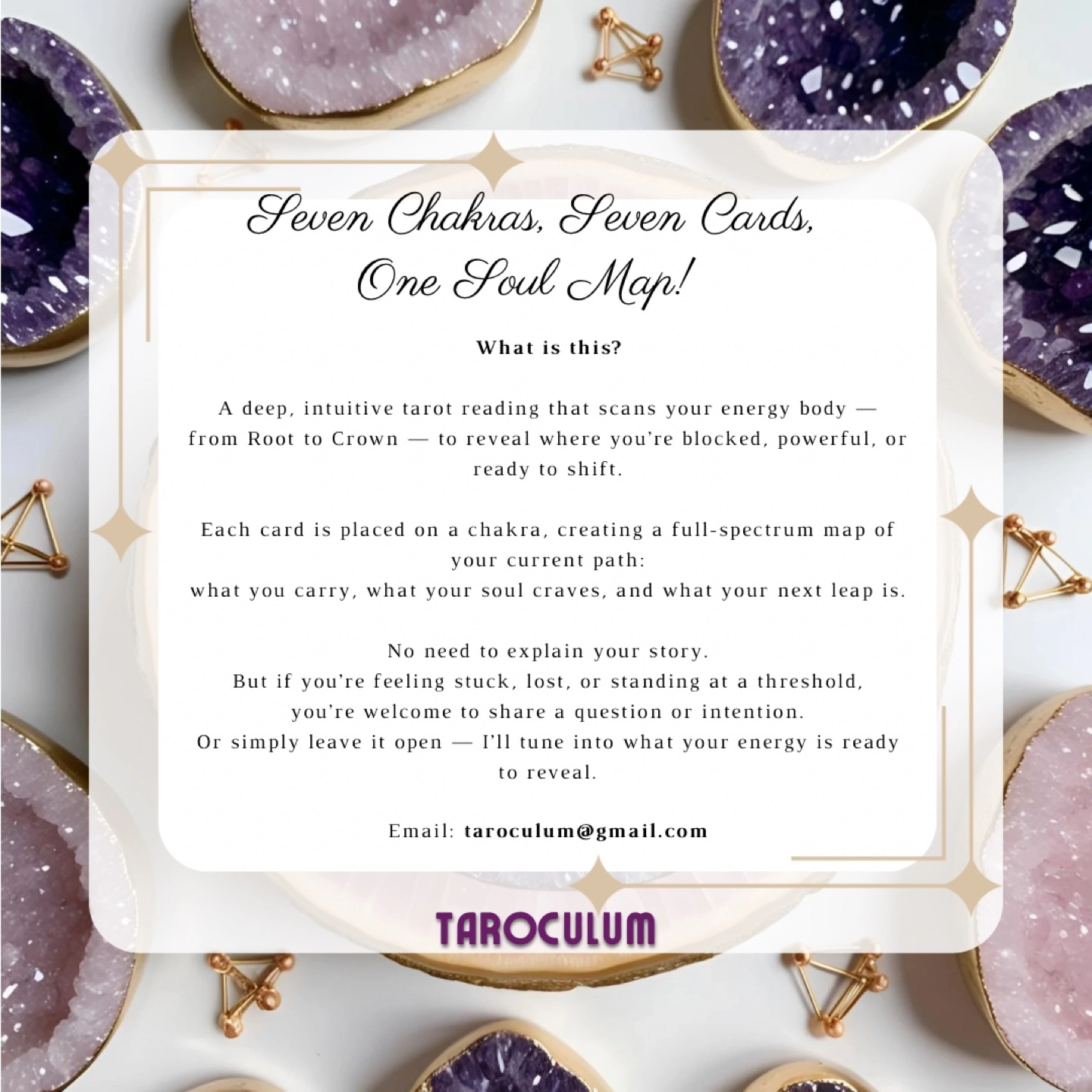 7-Chakra Tarot Reading for Energetic Realignment & Soul Clarity 🧿 This unique 7-card Chakra Reading is designed for moments of transition, emotional turbulence, or when you feel disconnected from your purpose. It’s a full-spectrum energy scan — mapping your physical, emotional, and spiritual state through the chakra system. Each card corresponds to a major energy center in your body, unlocking insight at every level of your being: Your 7 chakras tell a story — from your roots to your dreams. This reading maps: • Where you’re carrying too much • What you truly desire • The power you’re hiding • What your heart has been trying to say • The truth you’re meant to speak • The gift awakening in your intuition • And the next leap your soul is ready for You’ll receive all of this in one flowing, channeled message — clear, deep, and real. Price: $35 CAD Delivery: Within 24–48h Via Karrot chat or email: taroculum@gmail.com 📬 Feel free to message me here with any questions. 🤍 Safe, honest, and always confidential. Thank you for trusting me with your energy✨