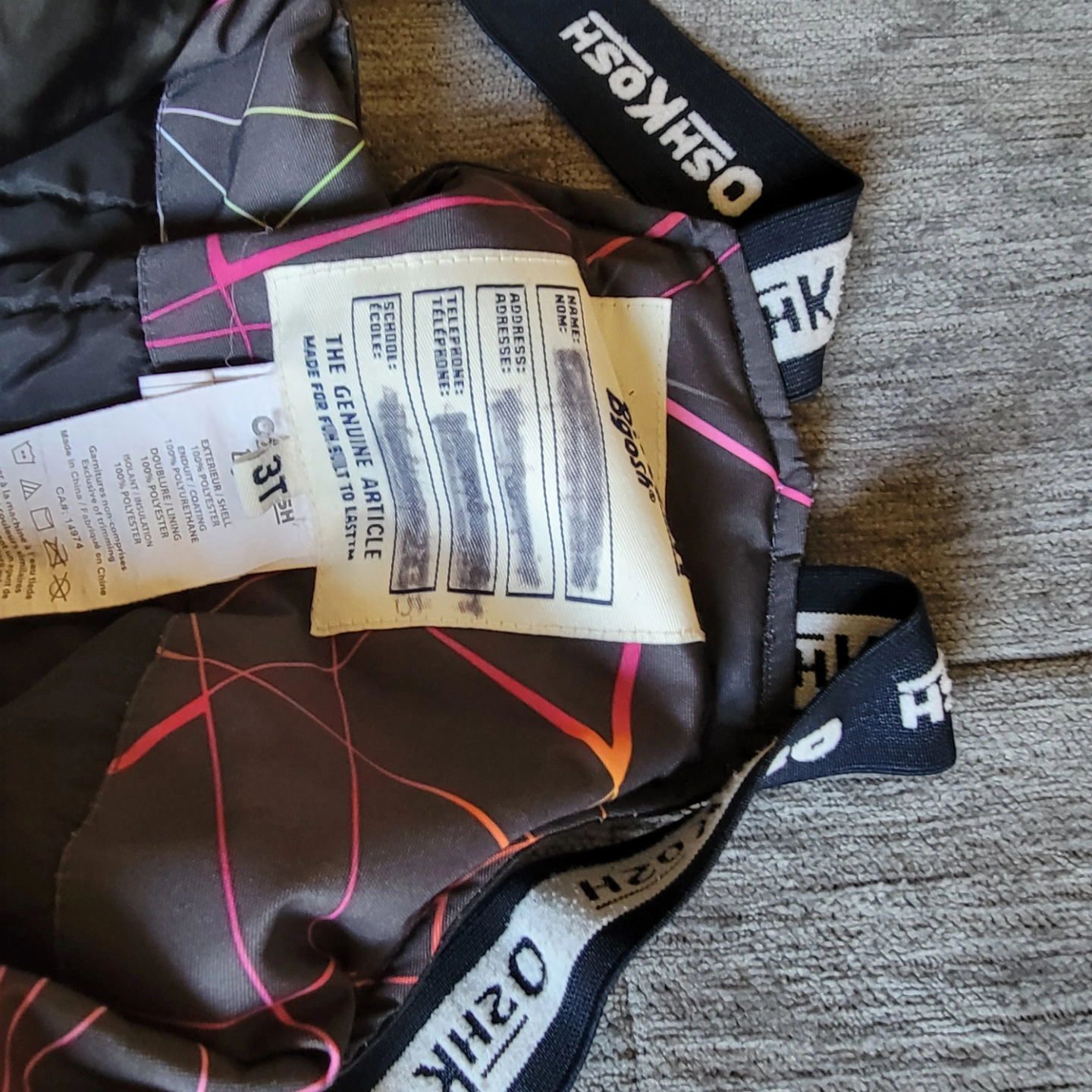 OshKosh Kids' Snow Pants. Size 3T. Adjustable suspenders. Zipper closure. Water resistant. Excellent for winter activities.