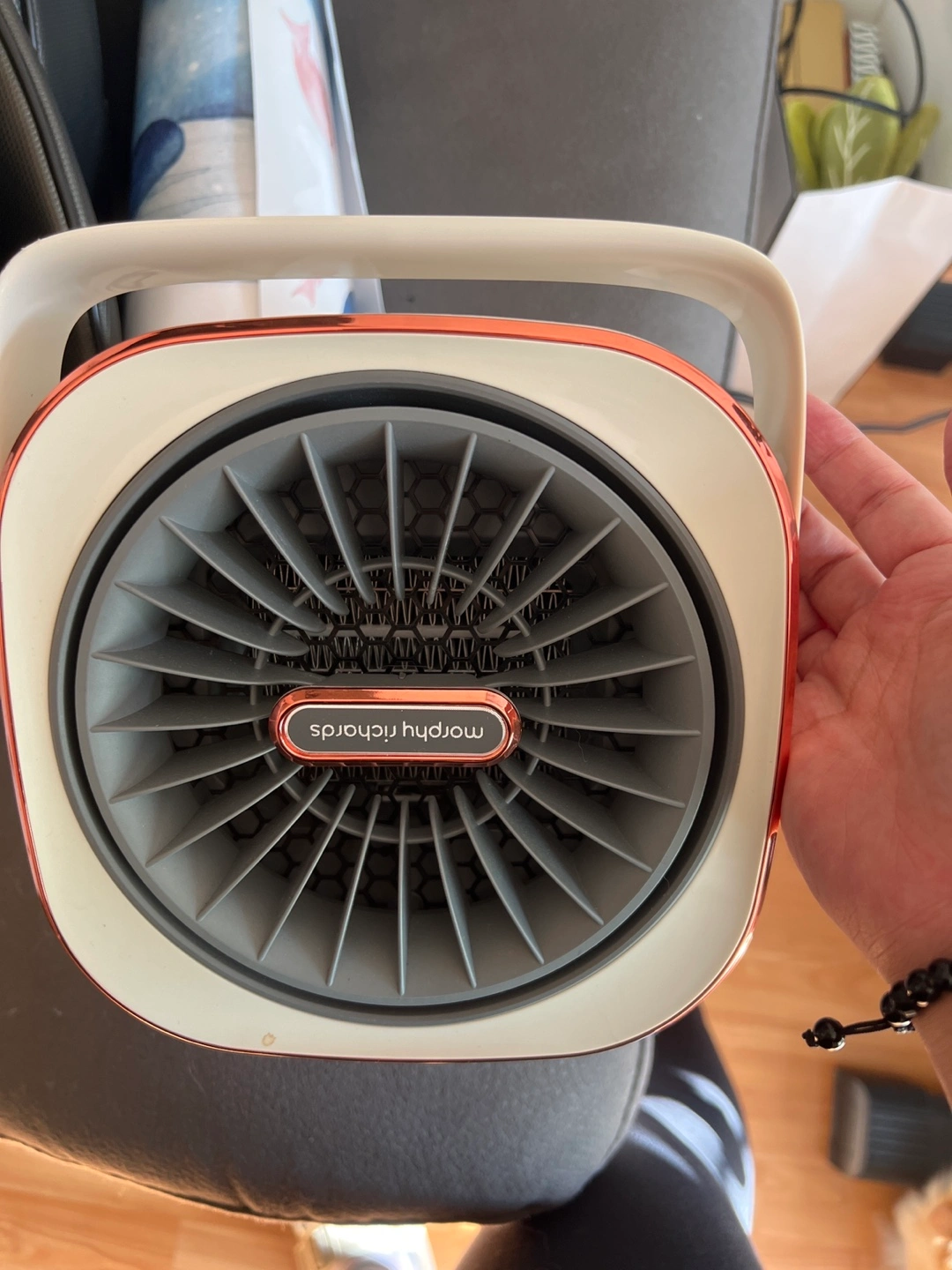Portable electric heater. Great for small spaces. Rose gold accents. Features a carry handle. Needs 220v