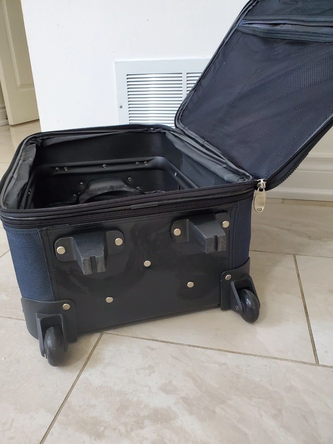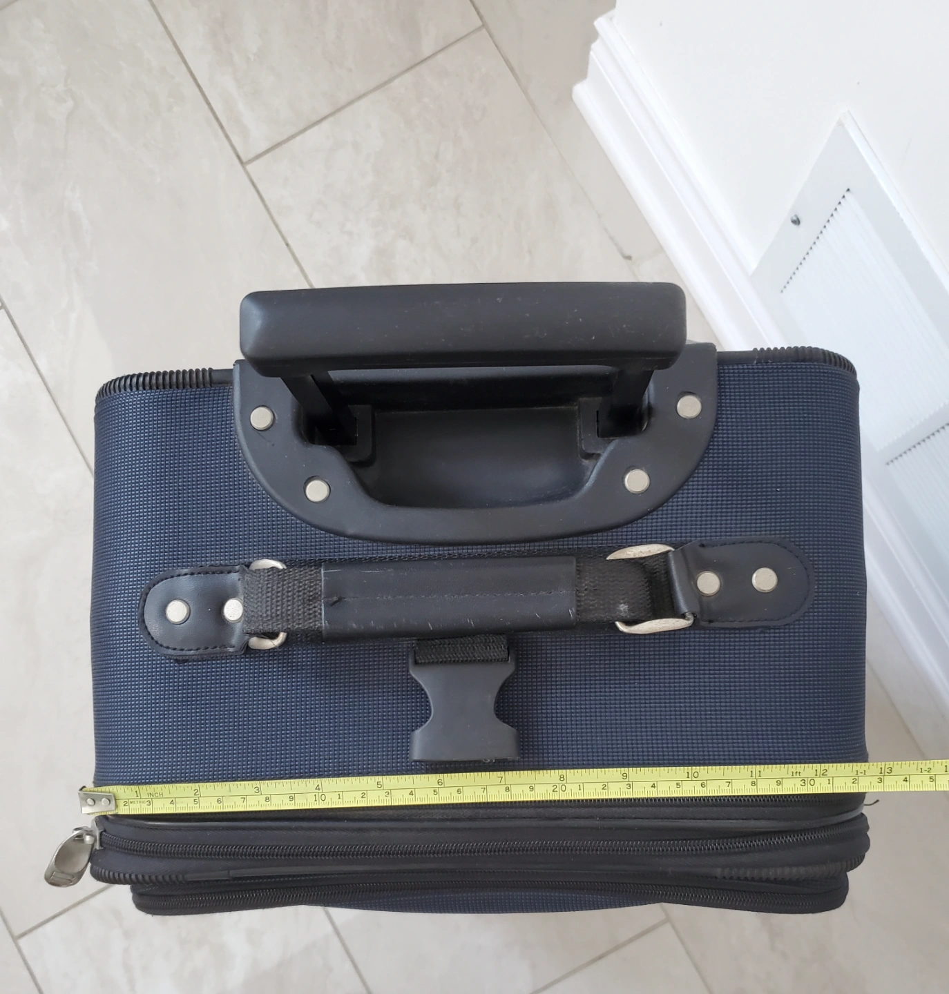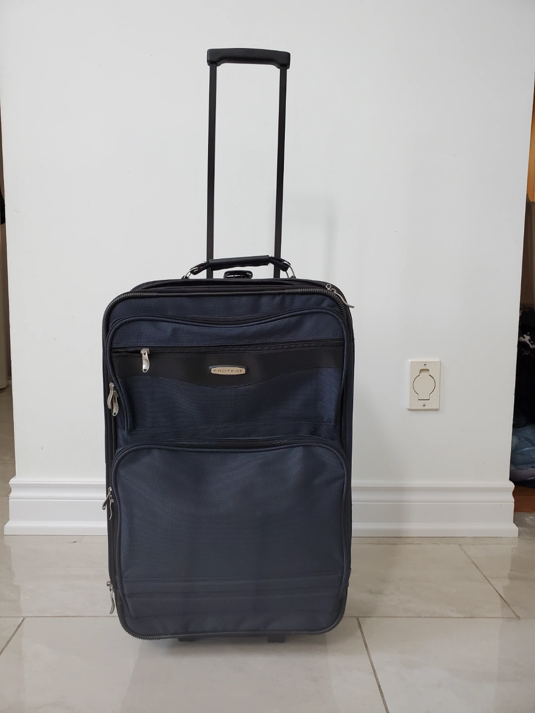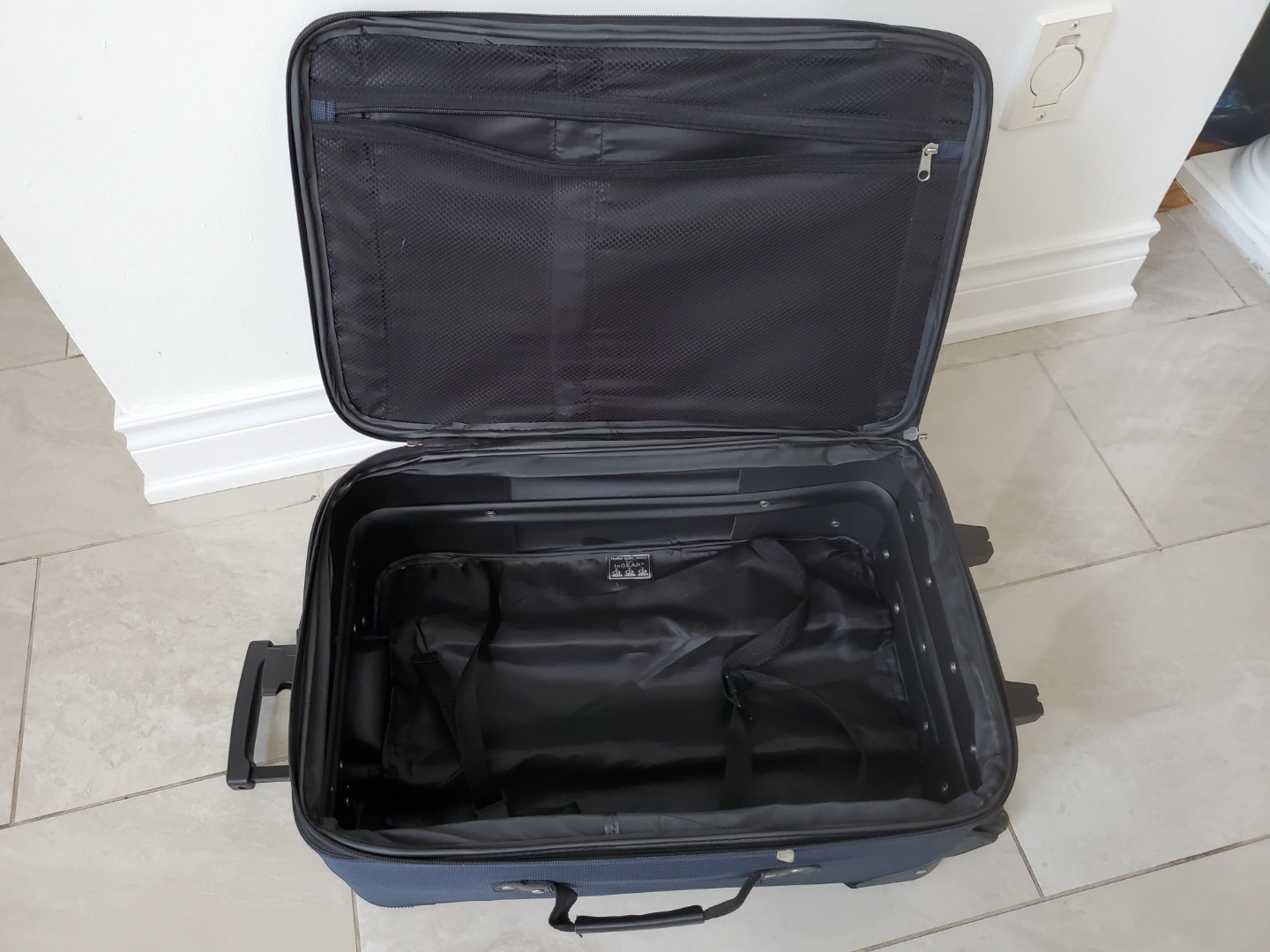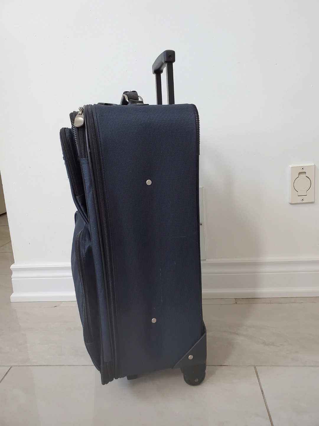 Navy blue epandable rolling check-in suitcase. Features multiple compartments and pockets. Durable fabric construction. Two wheels. Retractable handle.