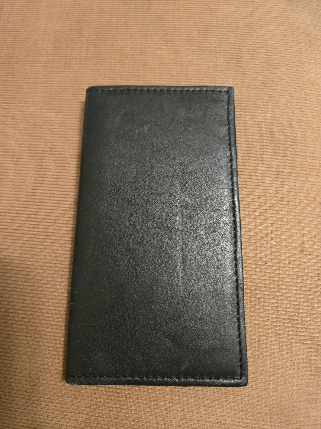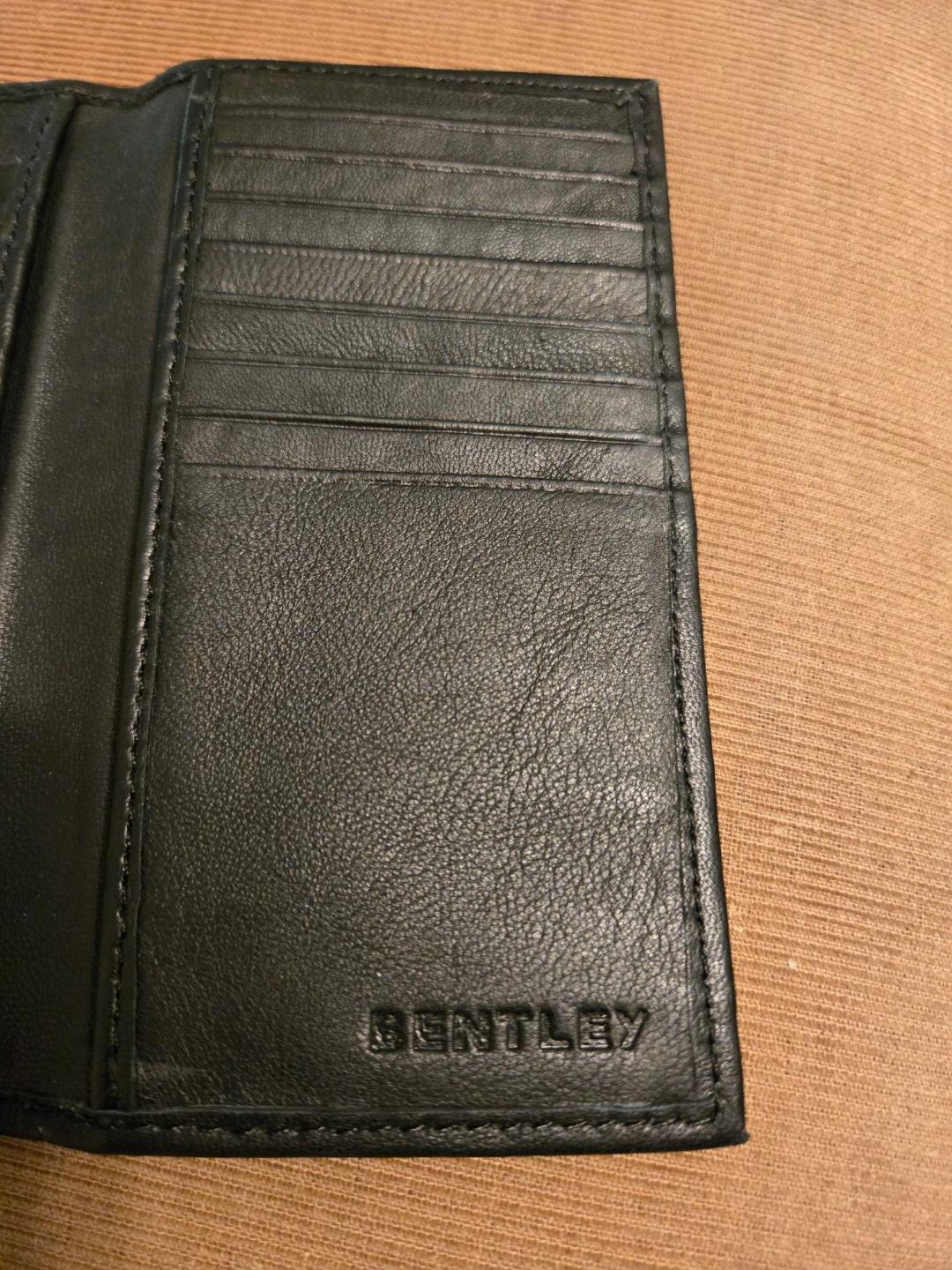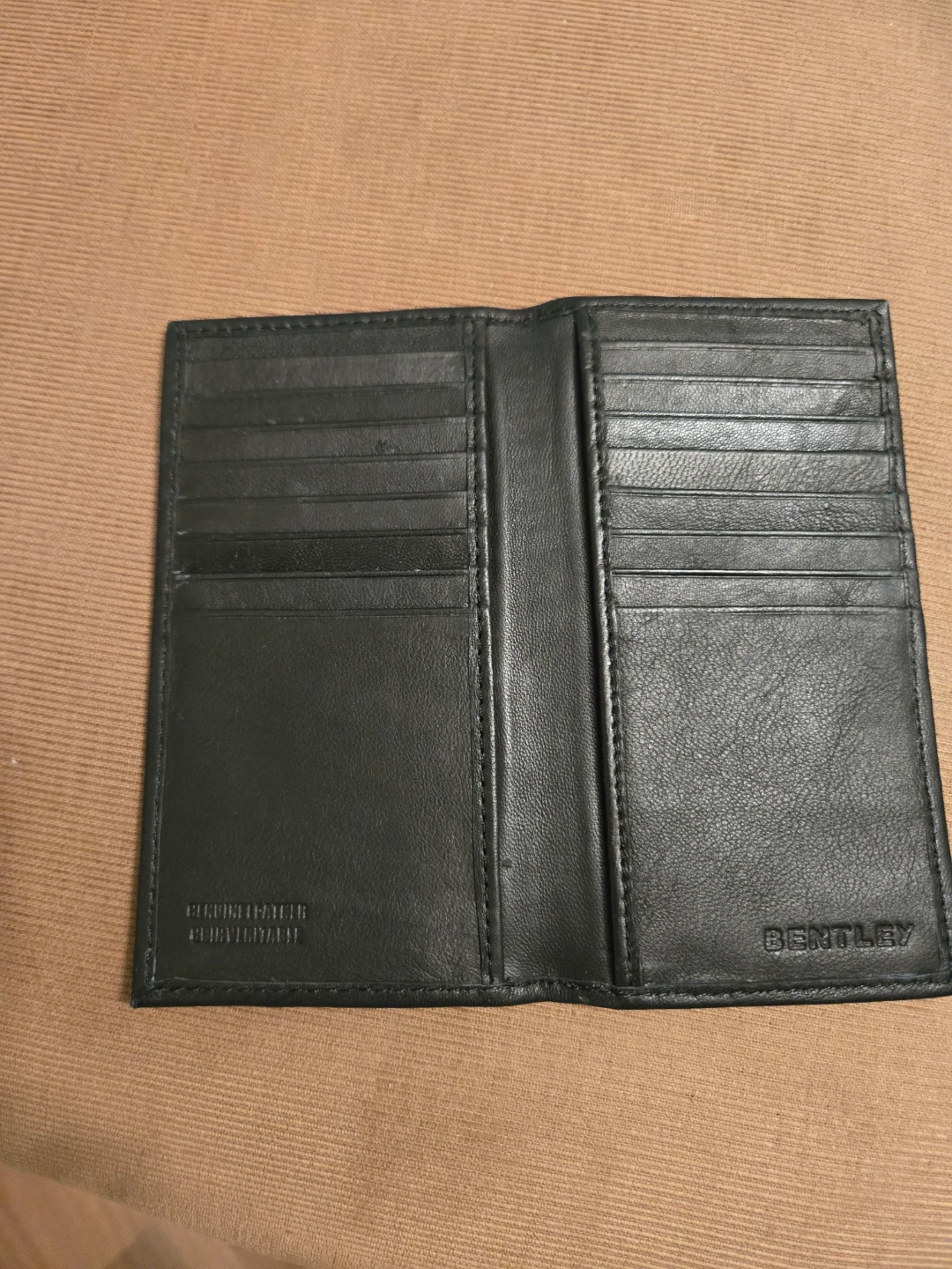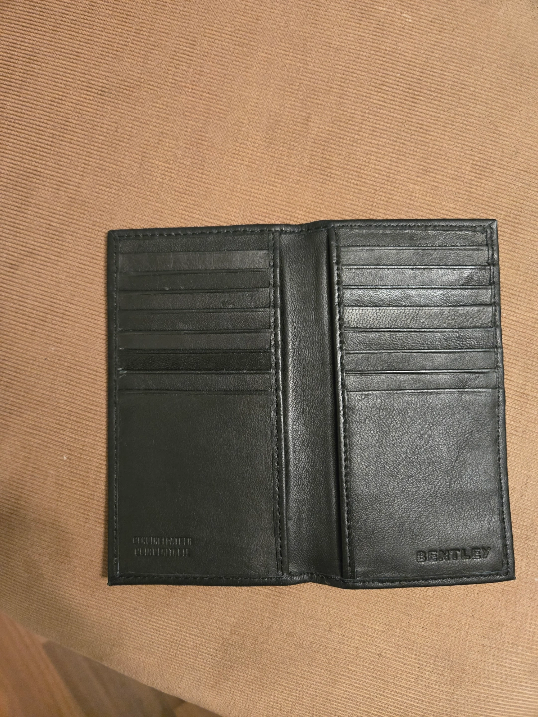 Black leather cardholder wallet. Multiple card slots. Genuine leather. Slim design.