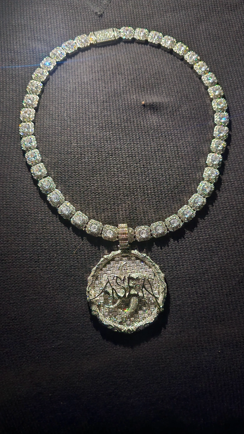 Men's iced-out tennis chain necklace. Features a large, custom pendant. 13mm 24 inches very outstanding