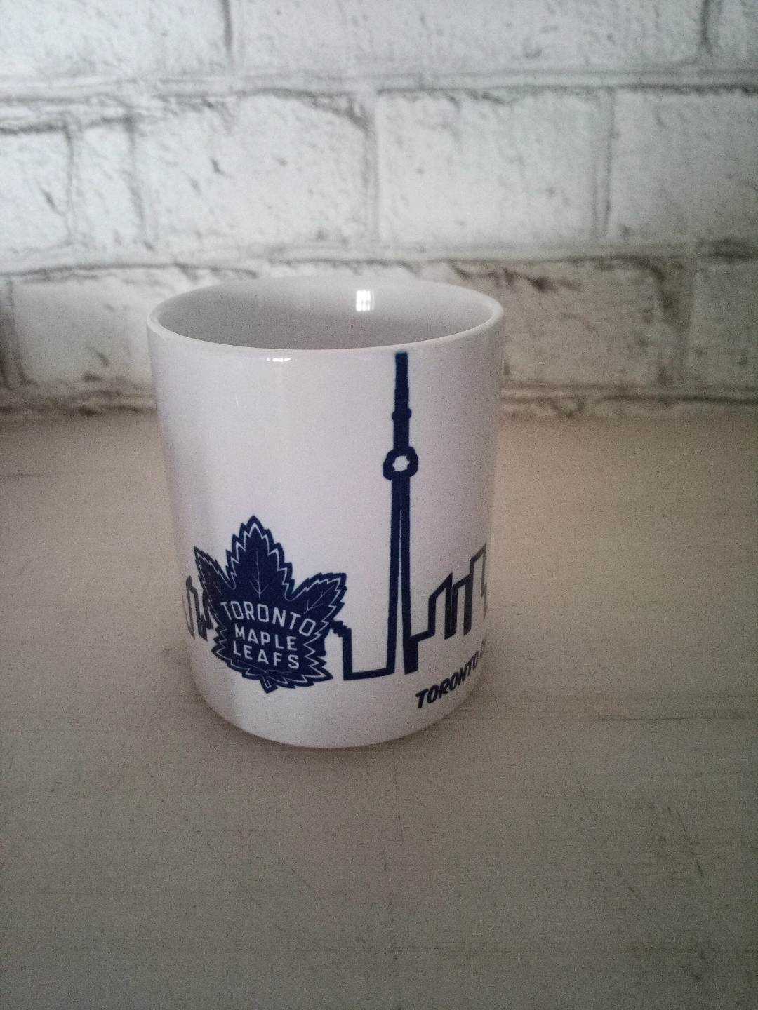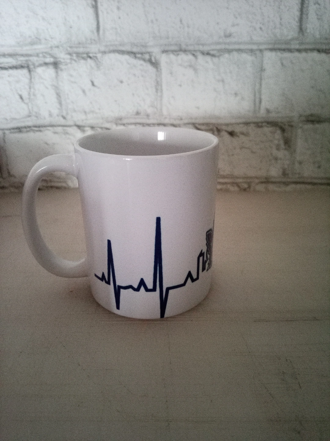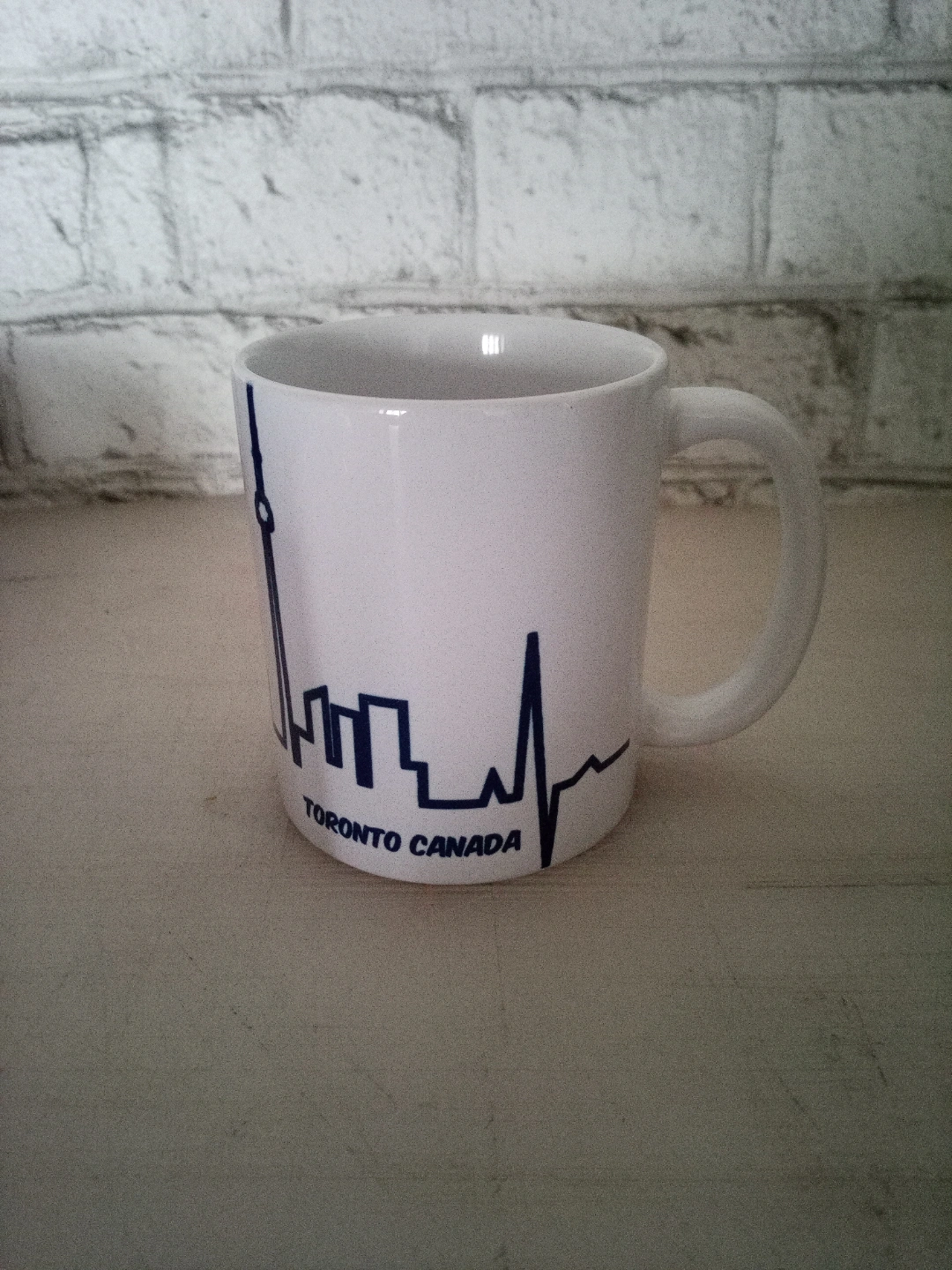 White ceramic mug. Features Toronto skyline design with CN Tower and heartbeat graphic. Blue print. Perfect for coffee or tea.