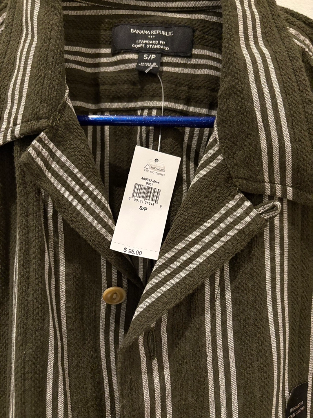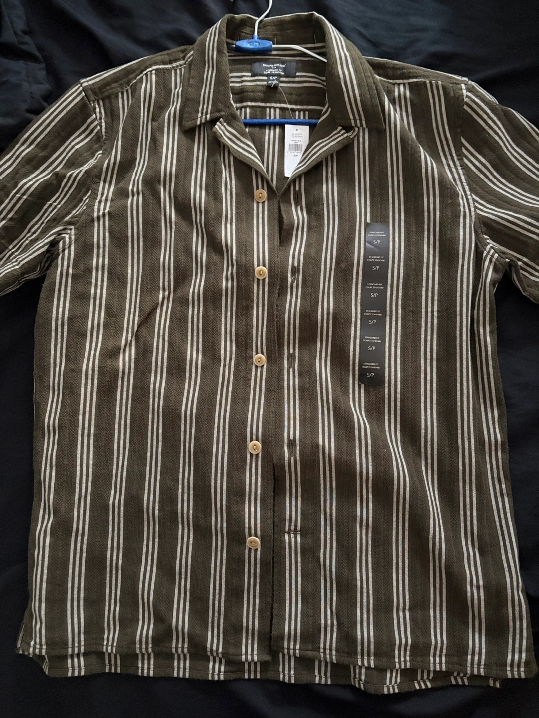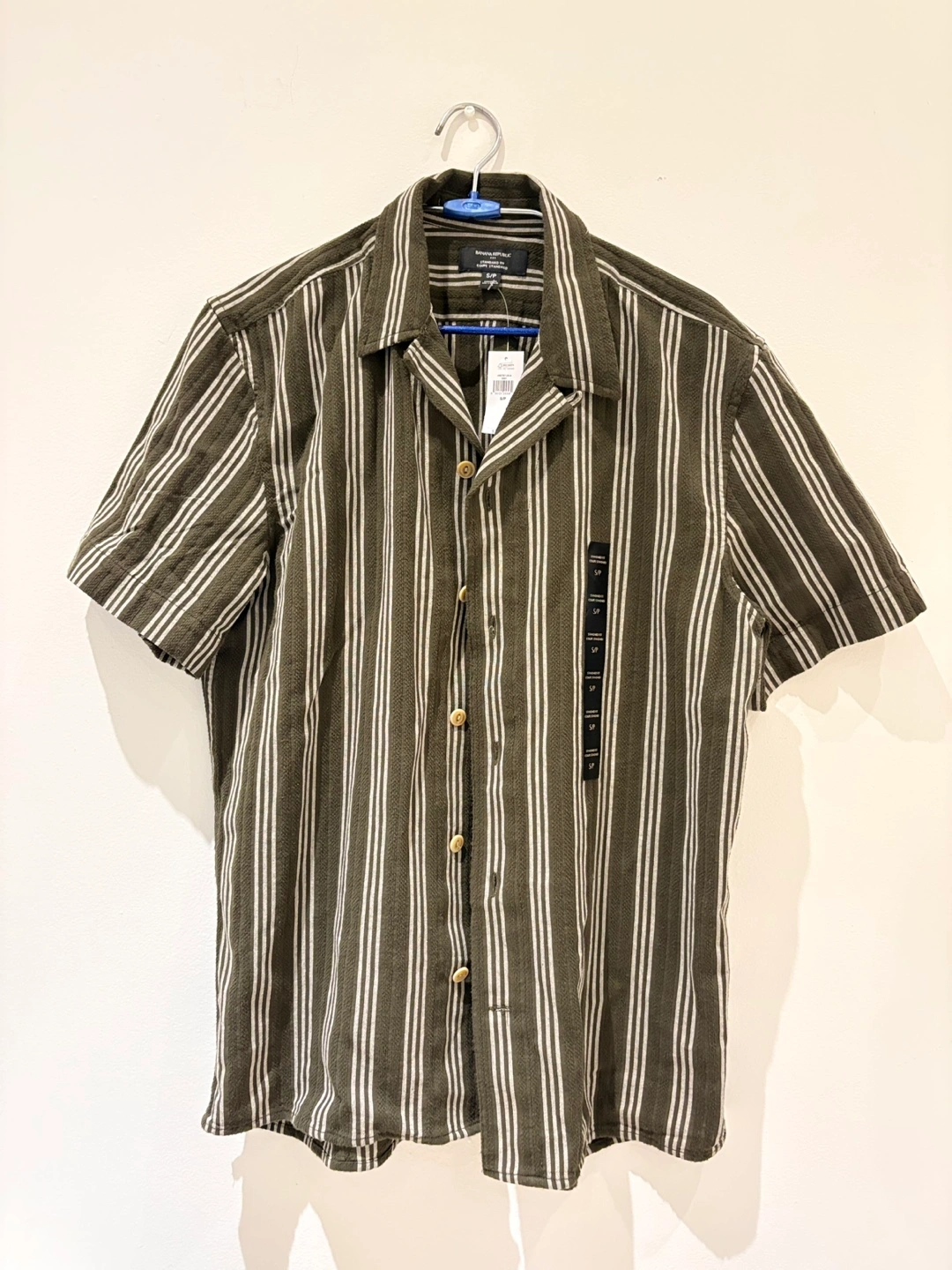Men's short sleeve button-up shirt. Olive green and white vertical stripes. Standard fit. Size small. New with tags. Missed the return window but its not my style.