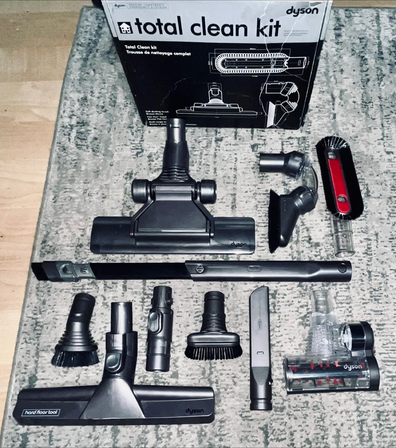 Complete set of 10 Dyson full size vacuum cleaner attachments. Includes various tools for different cleaning tasks. Lightly used, includes box.