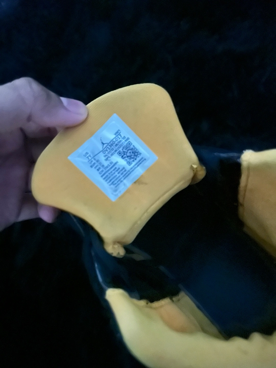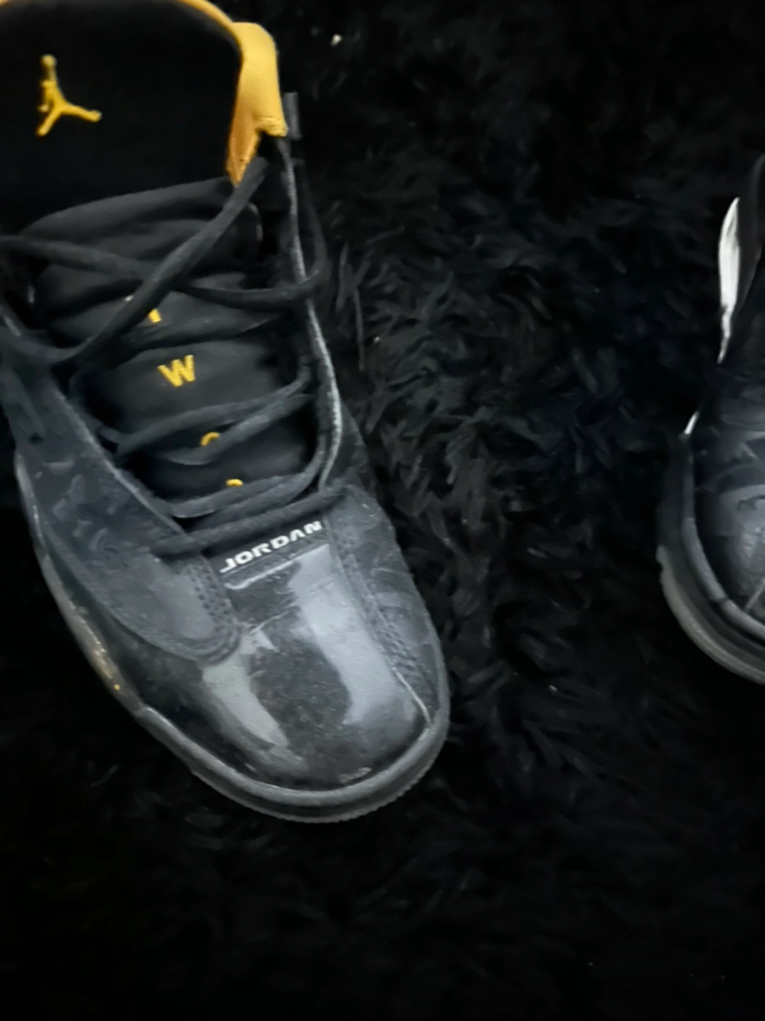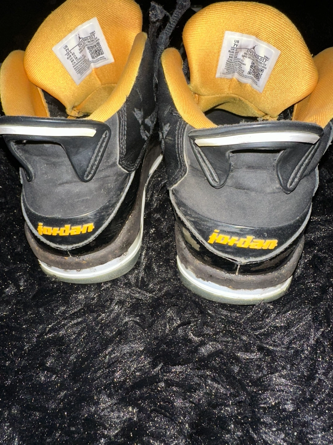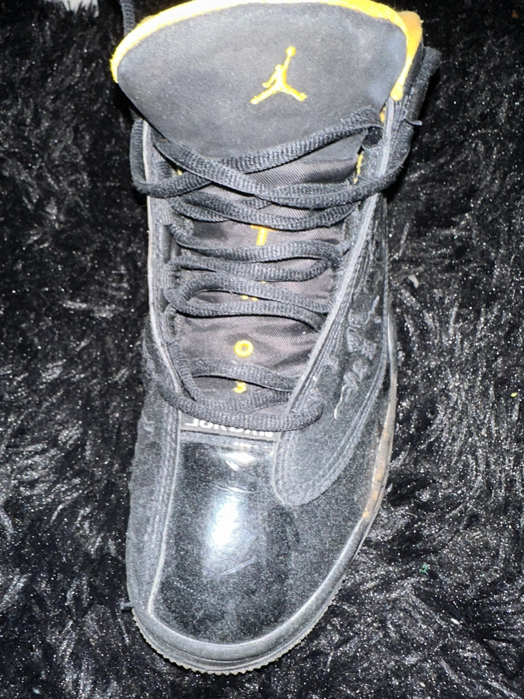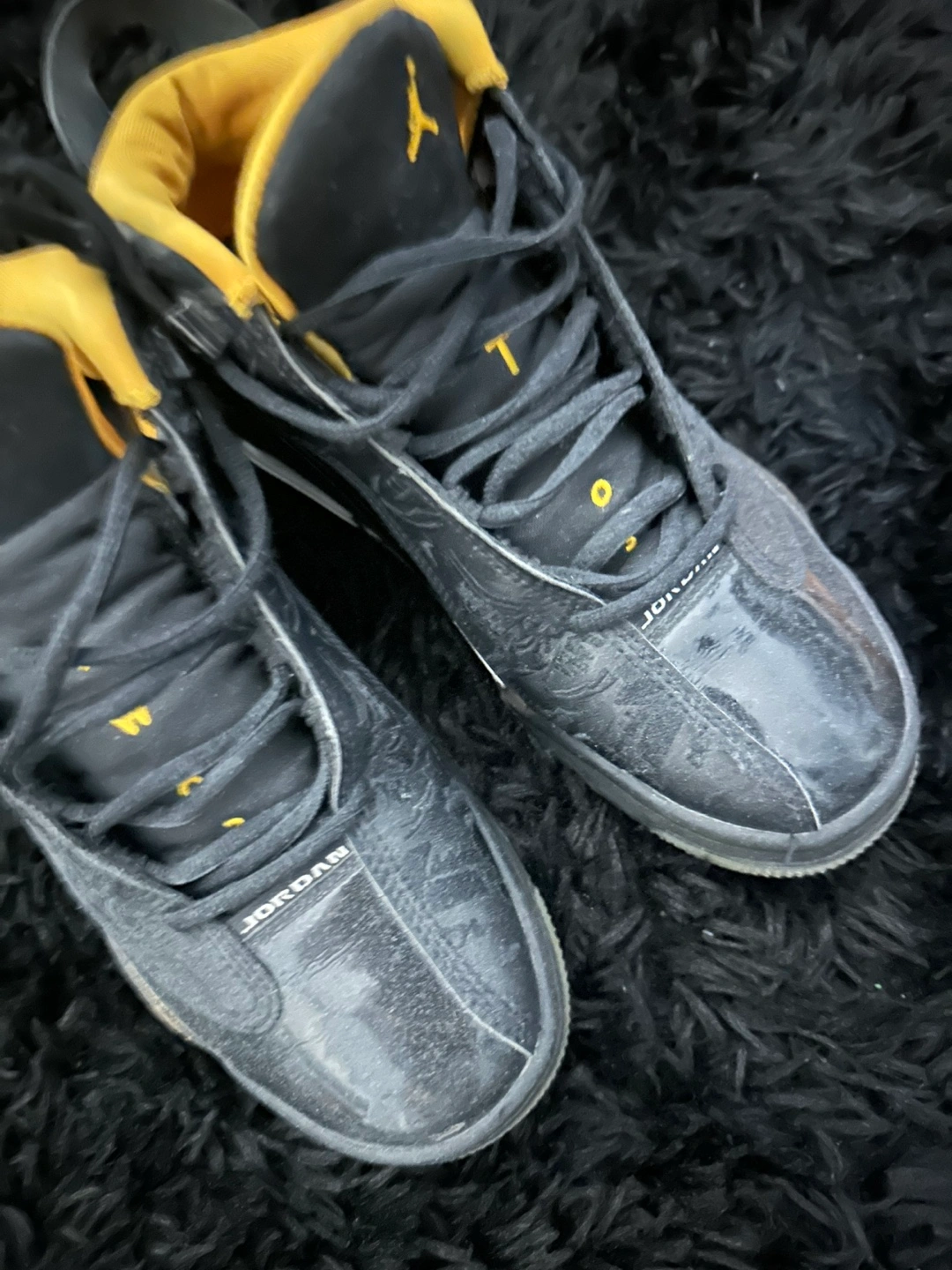 Black and gold Jordan basketball shoes. High-top style. Some wear and tear visible.