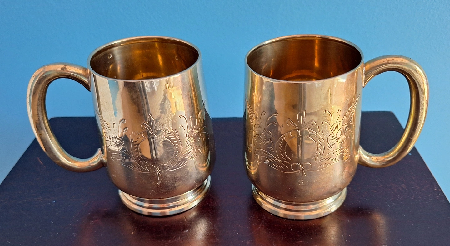 Two antique brass mugs. Floral engraving. Solid base. Unique design. Perfect for collectors. About 5 inch tall