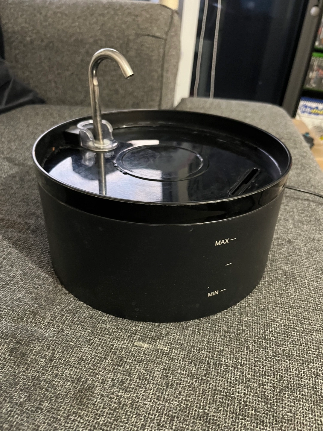 Automatic pet water fountain. Features a small faucet and a replaceable filter. Black plastic construction. Good for cats and small dogs. Cat still refused to drink from it so never used
