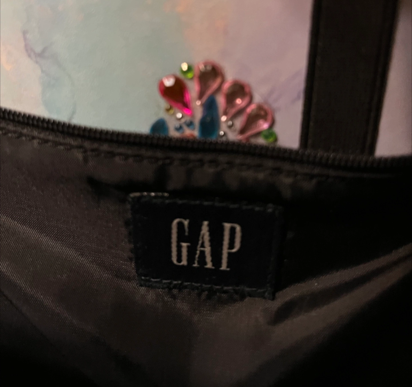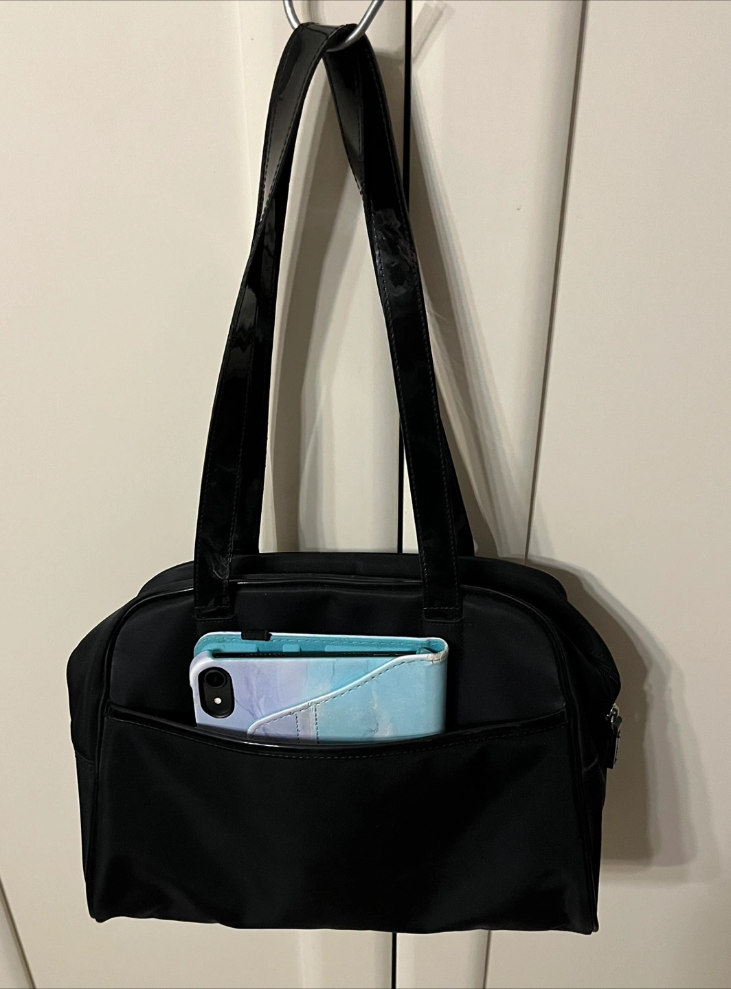Small black handbag. Features shiny black handles and a zipper closure. Interior pocket. Good for everyday use.