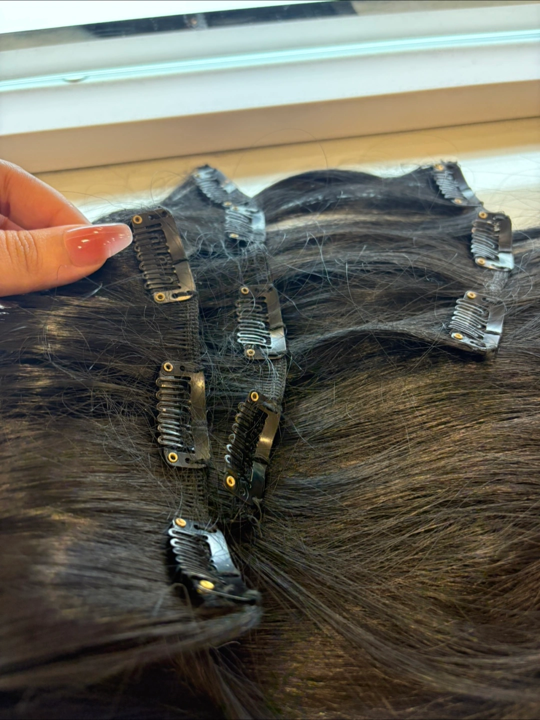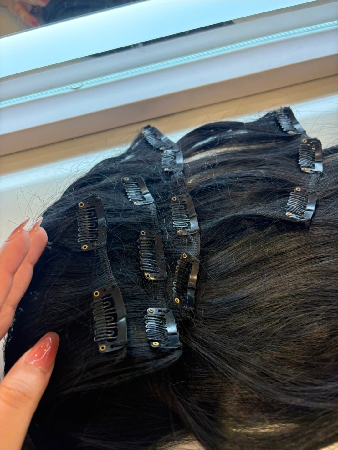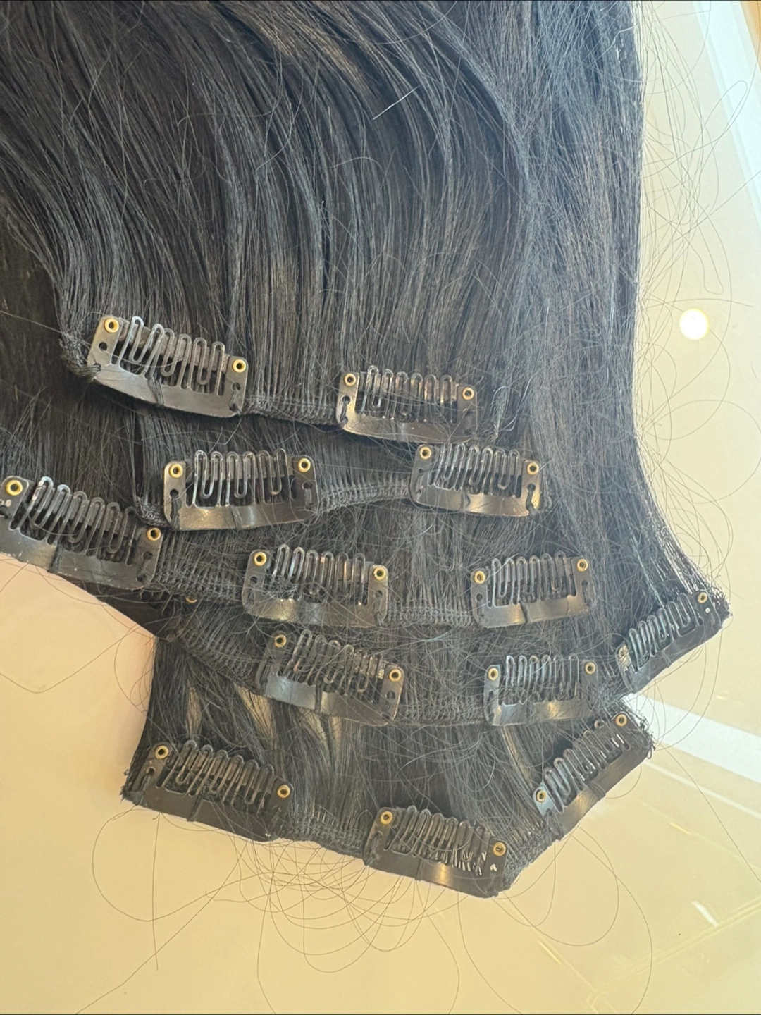 Long black clip-in hair extensions. Multiple clips for secure attachment. Straight, silky hair. Great for adding length and volume. 20 inches