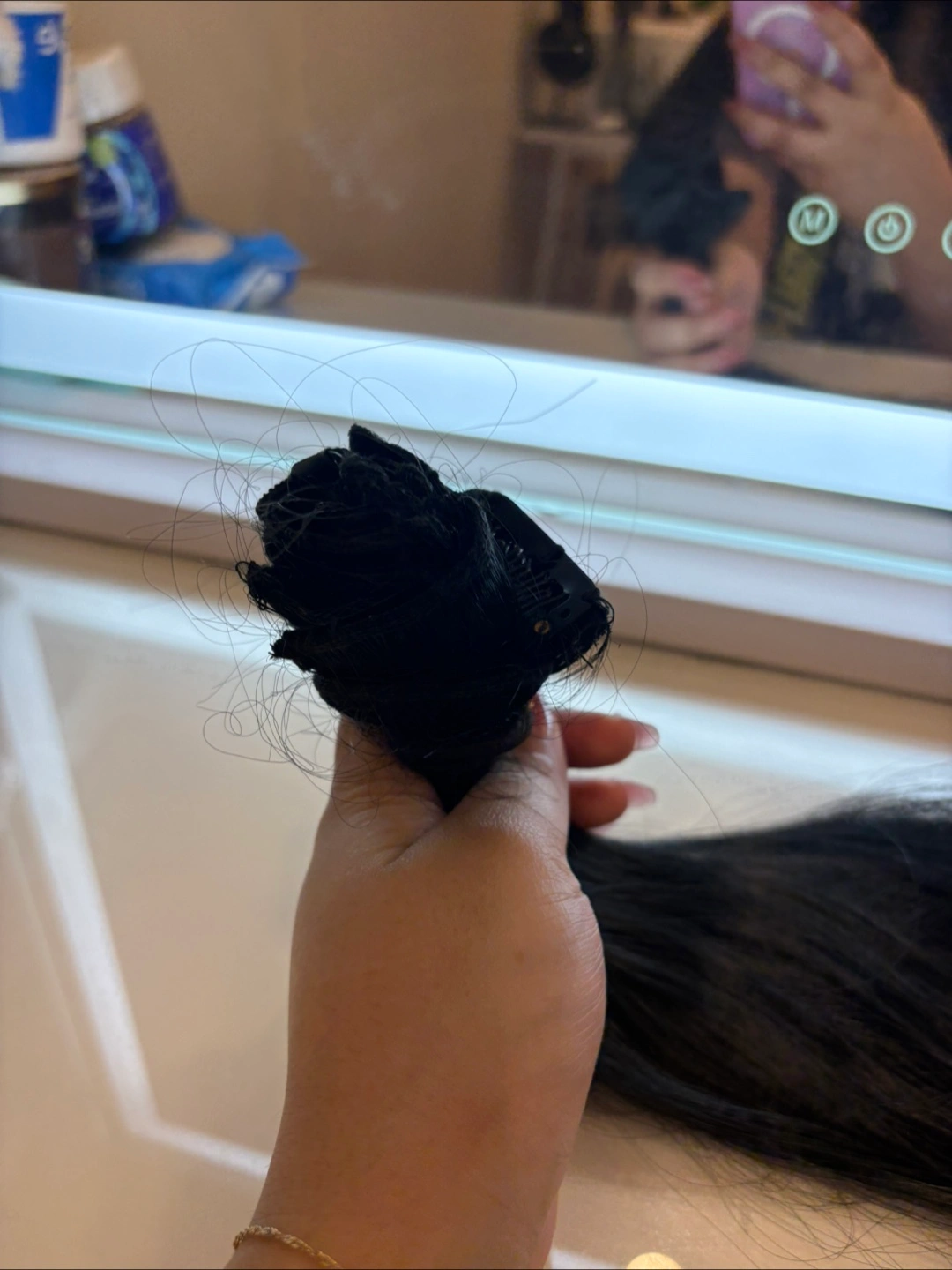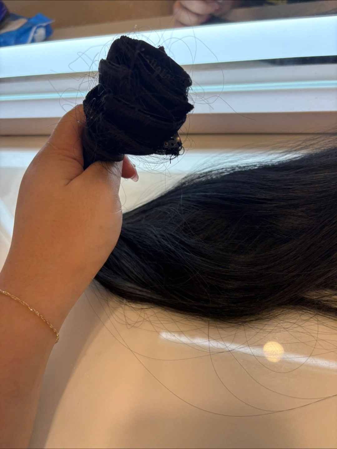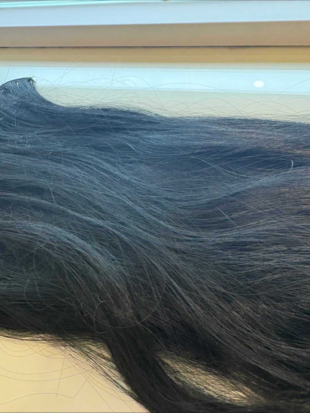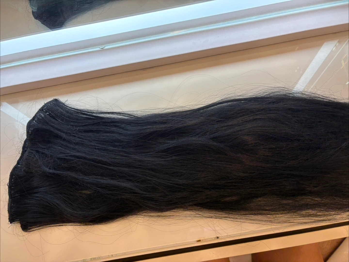 Long black clip-in hair extensions. Multiple clips for secure attachment. Straight, silky hair. Great for adding length and volume. 20 inches
