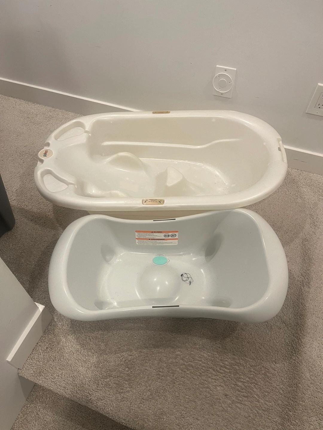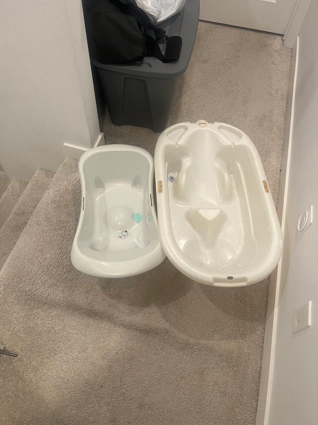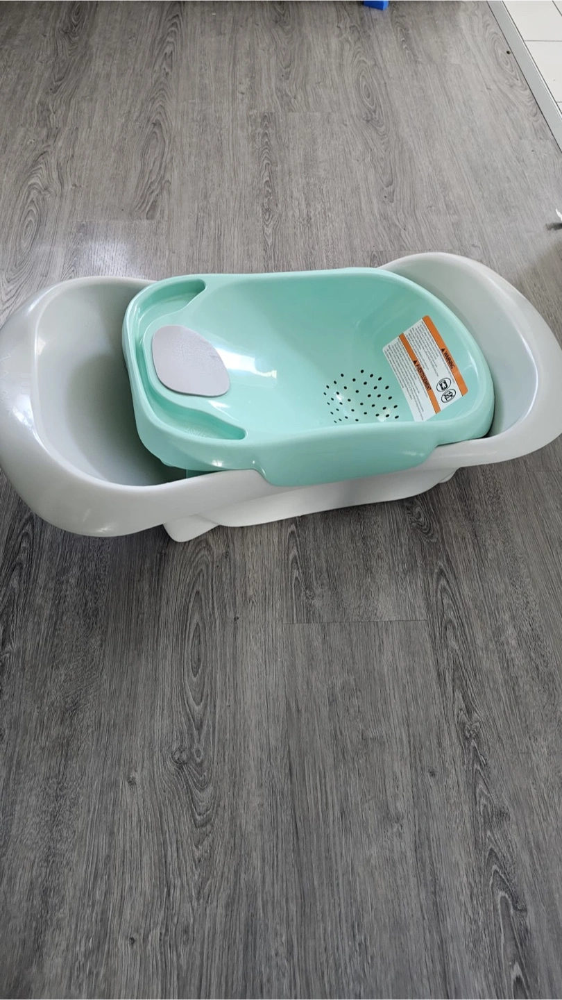 Two baby bathtubs available. One is a larger, off-white tub. The other is a smaller, two-piece teal and white tub with a built-in draining feature.