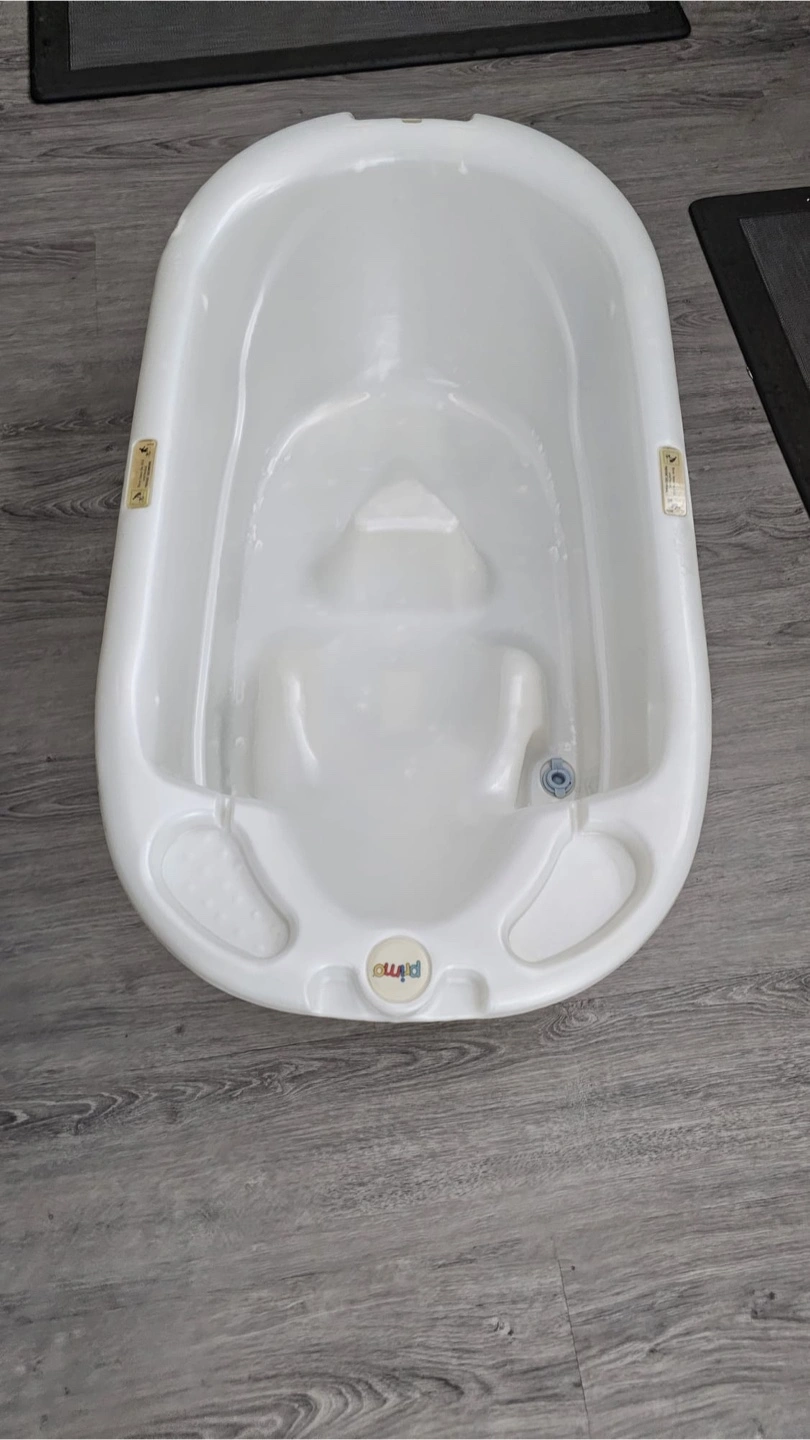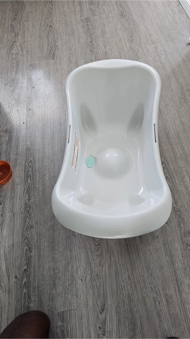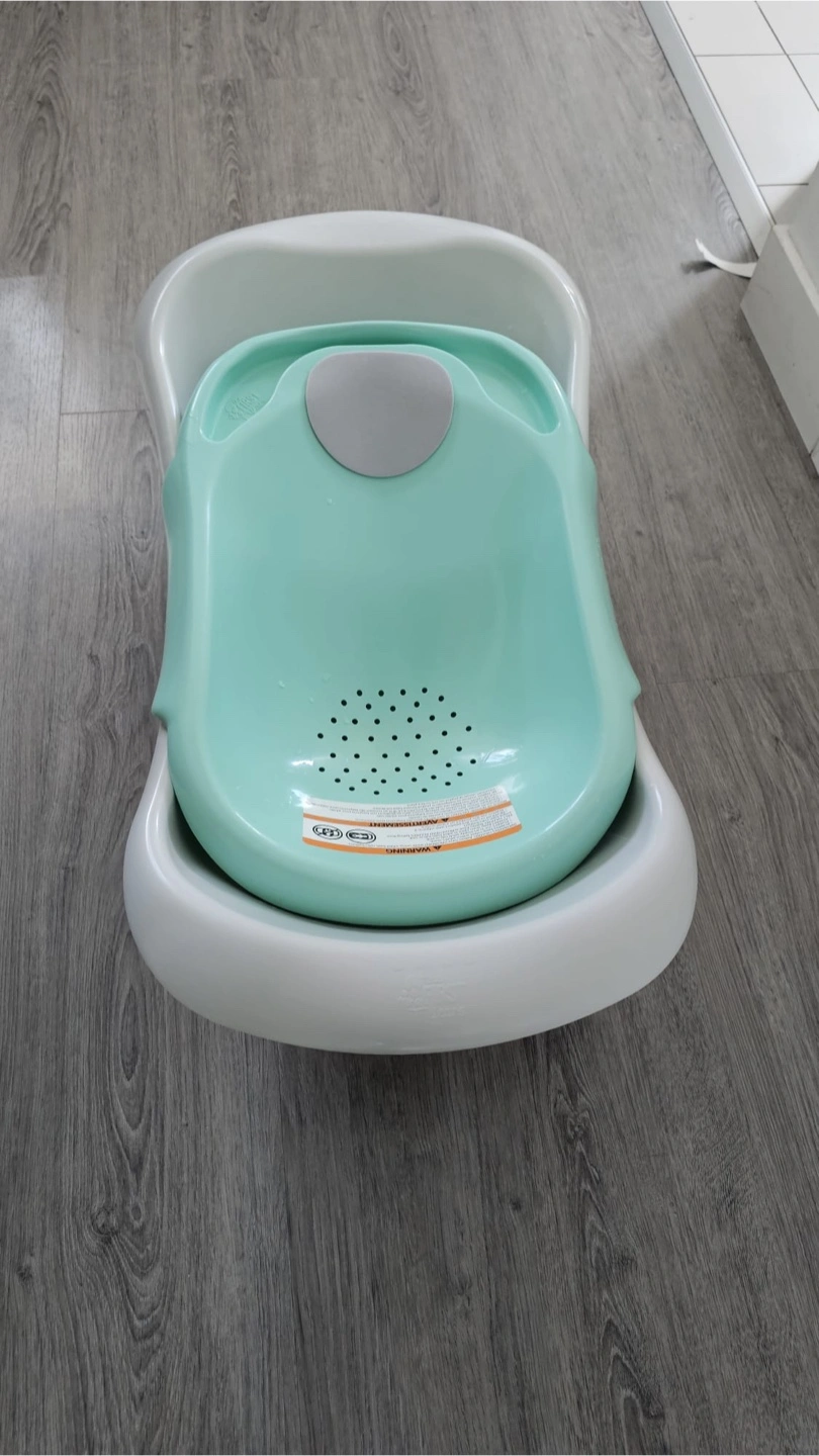 Two baby bathtubs available. One is a larger, off-white tub. The other is a smaller, two-piece teal and white tub with a built-in draining feature.