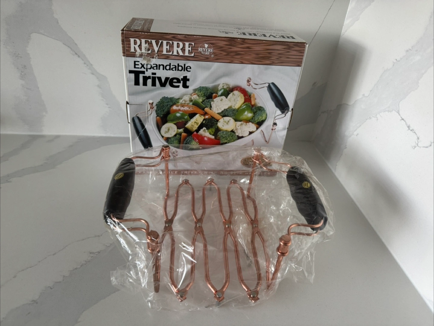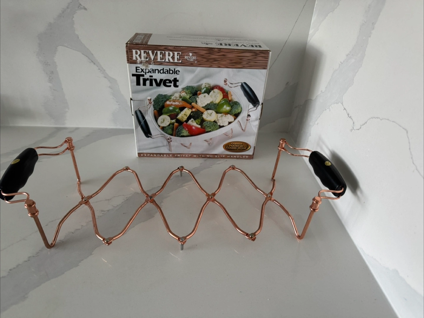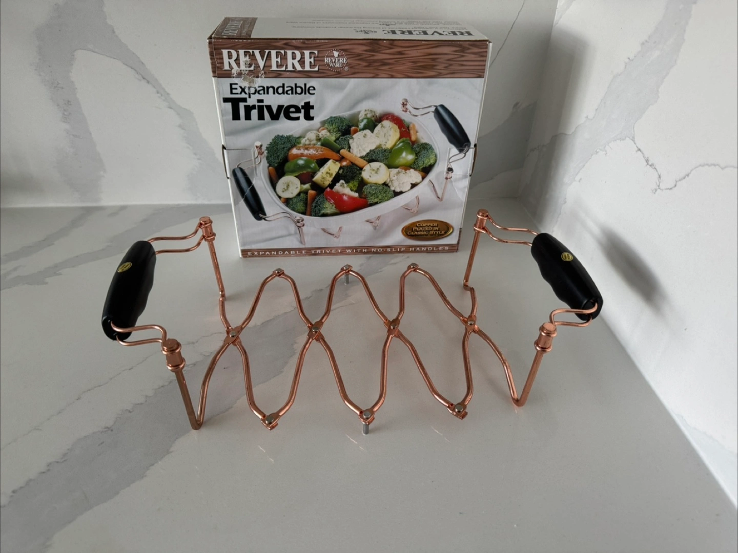 Rose gold coloured expandable trivet. Features black handles. Perfect for serving dishes. Pick up at Bathurst & Steeles area.