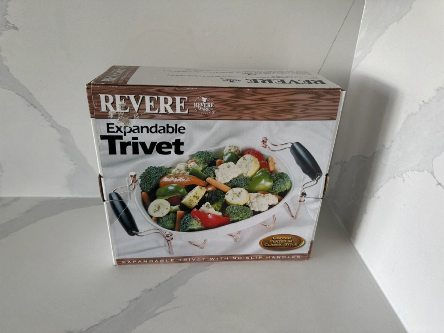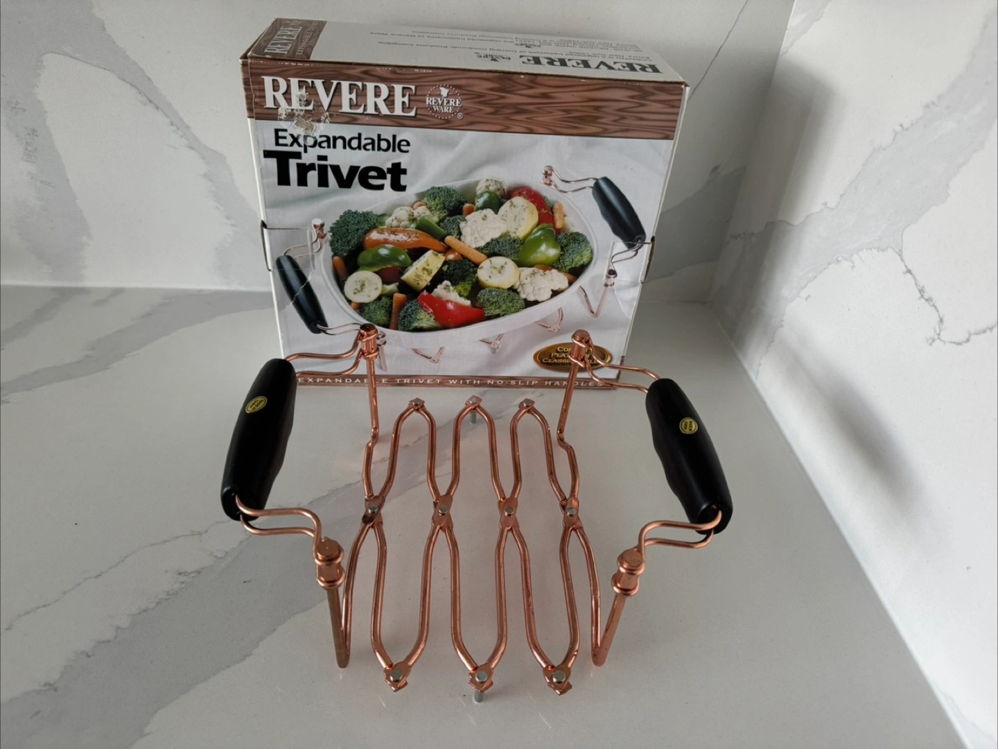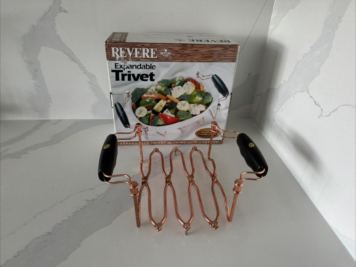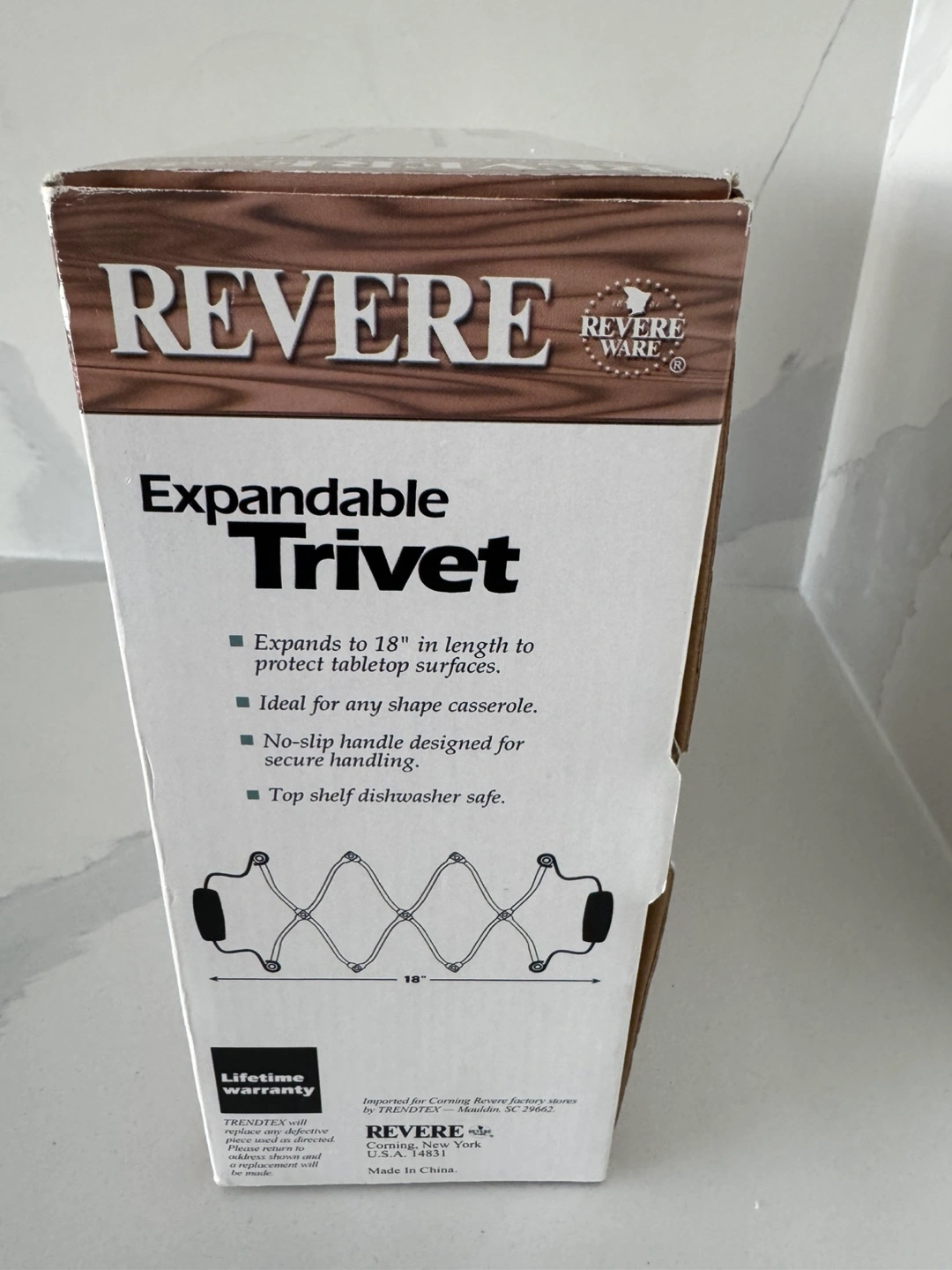 Rose gold coloured expandable trivet. Features black handles. Perfect for serving dishes. Pick up at Bathurst & Steeles area.