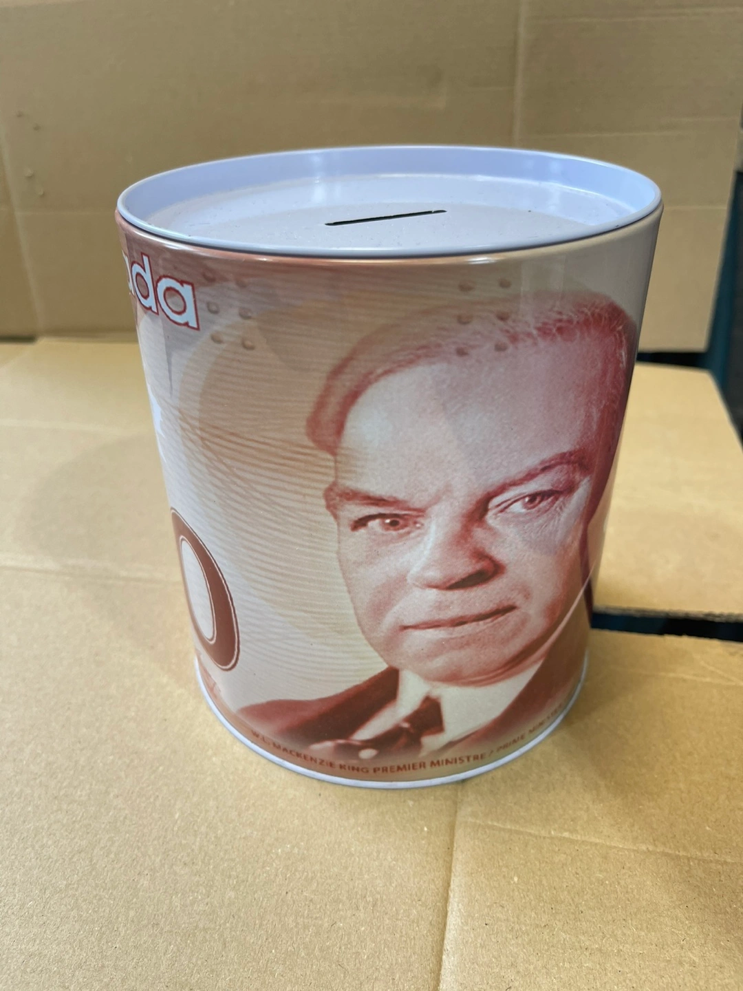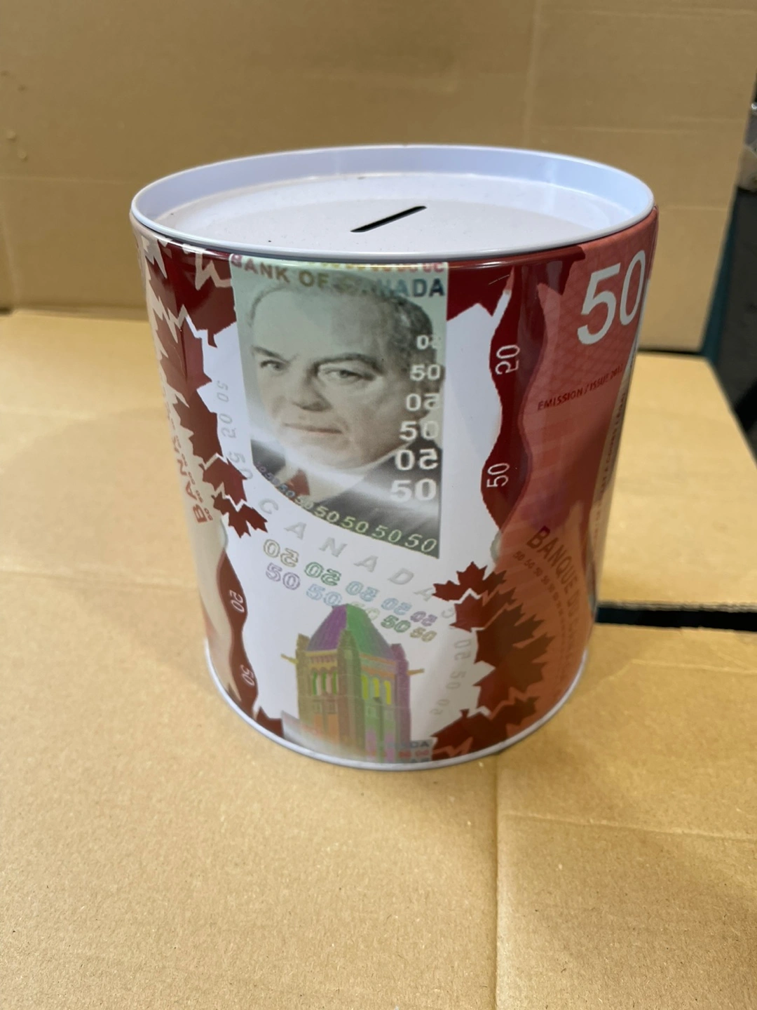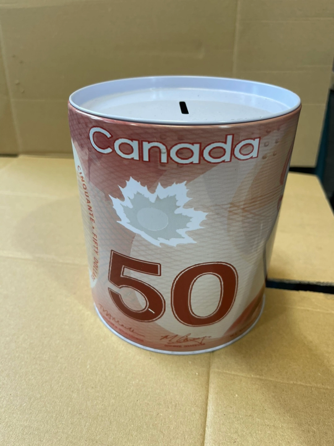 Metal coin bank. Features a design replicating the Canadian $50 bill. Round shape with a slot at the top. Perfect for saving money.