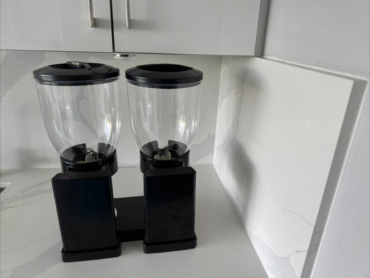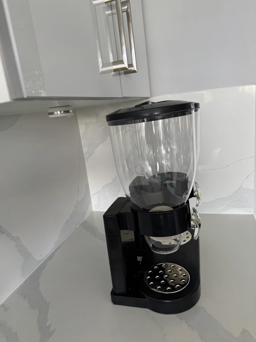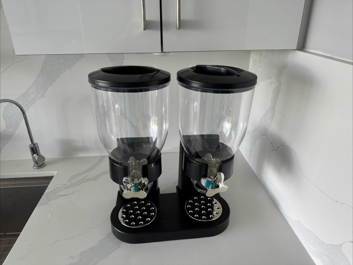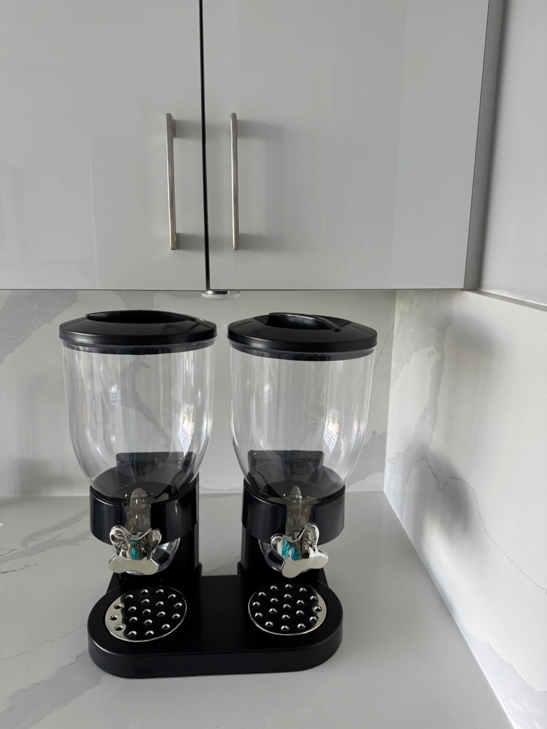 Double cereal dispenser. Black plastic with clear canisters. Each canister holds 17.5 ounces of dry food. Dispenses approximately 1 ounce per twist of the knob. Convenient storage and portion control. Comes with Box Pick up at Steeles & Bathurst area.