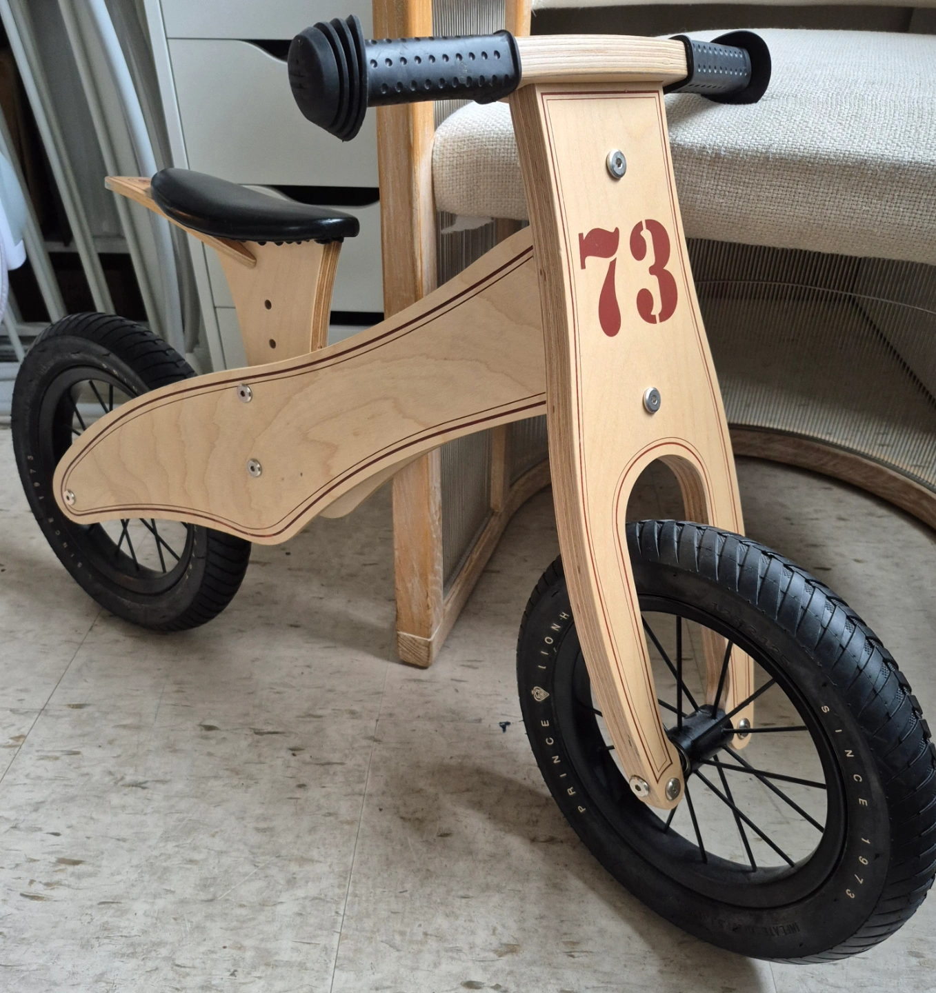 Adorable wooden balance bike. Features black rubber tires and a simple design. Adjustable seat, Number 73 is painted on the frame. Great for young children learning to balance.