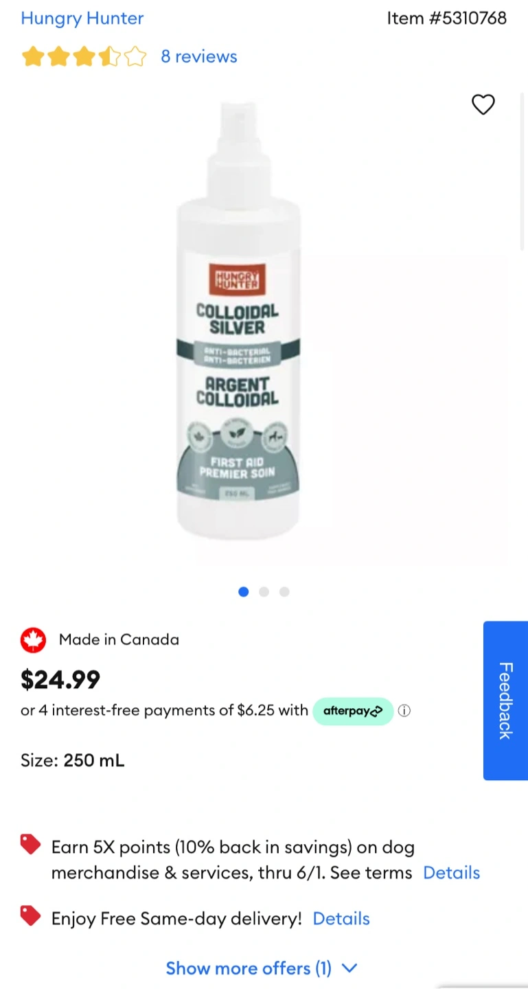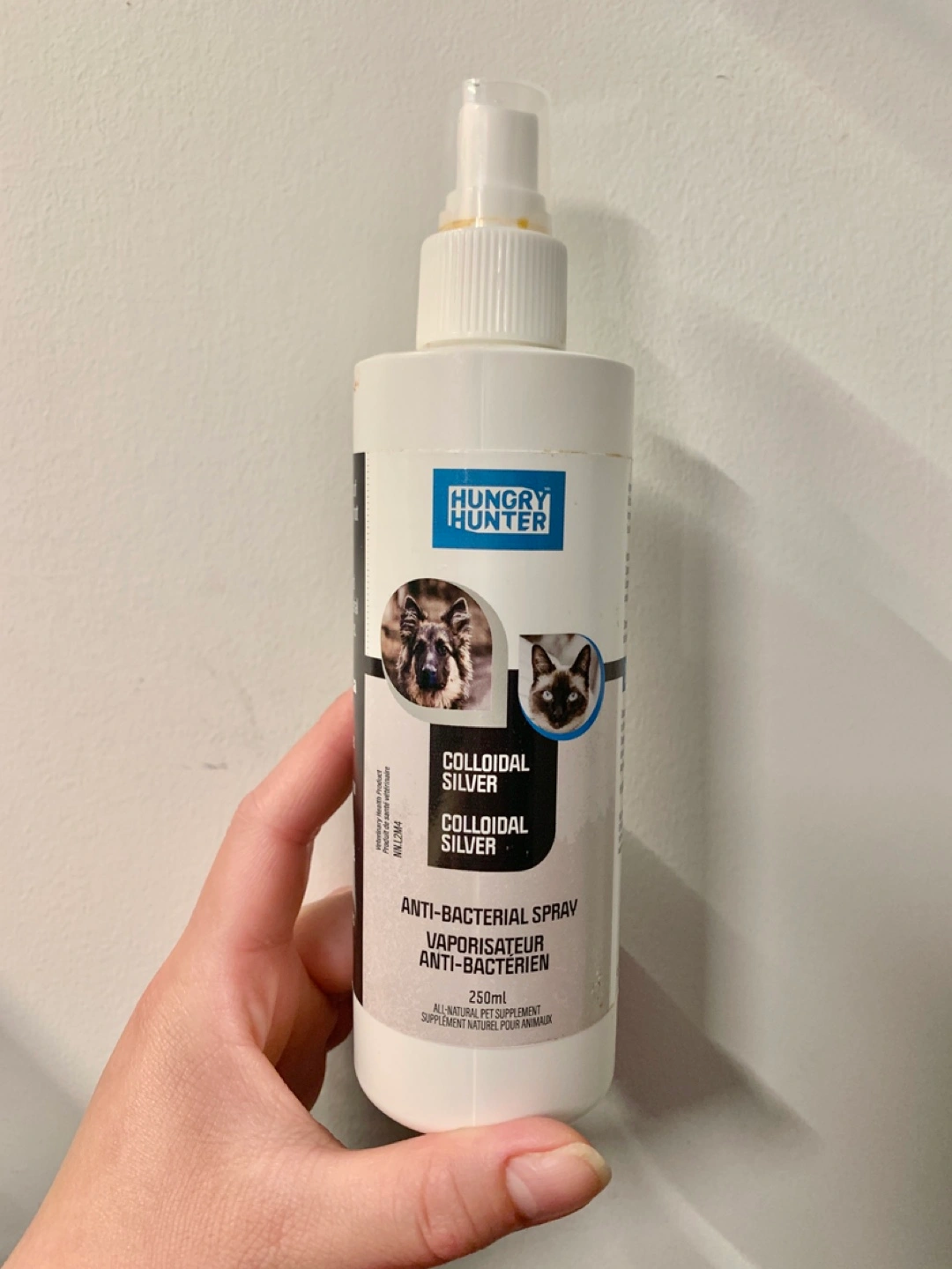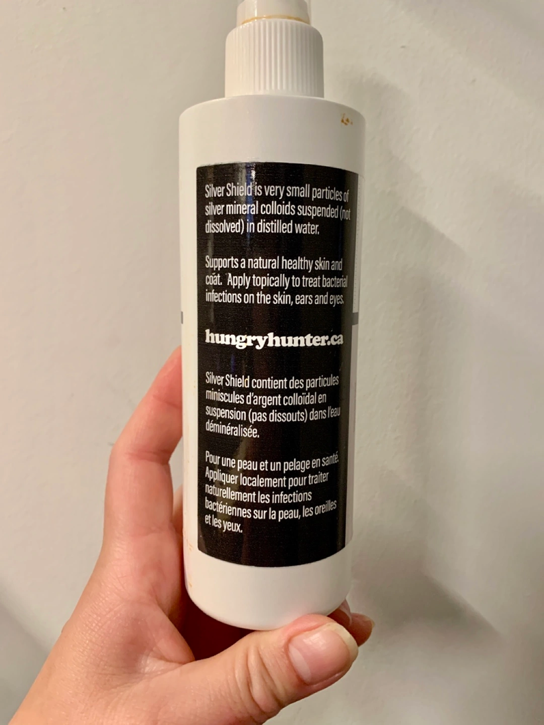 Colloidal silver spray. Anti-bacterial. Supports healthy skin and coat. Apply topically to treat bacterial infections. For skin, ears and eyes. Made in Canada. Can be used for both cats and dogs. I’m selling these as I have too many. It is still really effective, I’ve used it twice but my cats don’t have anymore health issues as before bexause they are on raw diet. Petsmart sells it really expensive, check it out here: https://www.petsmart.ca/dog/health-and-wellness/first-aid-and-recovery/hungry-hunter-silver-shield-pet-supplement-63921.html ——— ‼️NO TRADE‼️✨firm pricing✨ ✨pick up at my condo building✨will be confirmed in detail