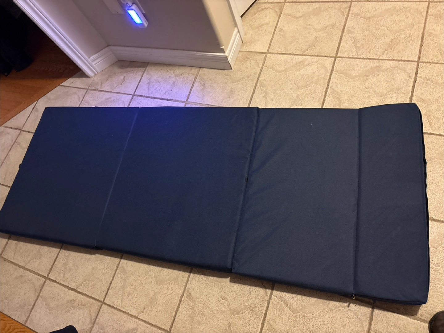 Navy blue folding memory foam mattress. Twin size. Great for guests, camping and road trips. Highly elastic and comfortable….* Pick up on Chandos Drive in Chicopee area of South Kitchener.