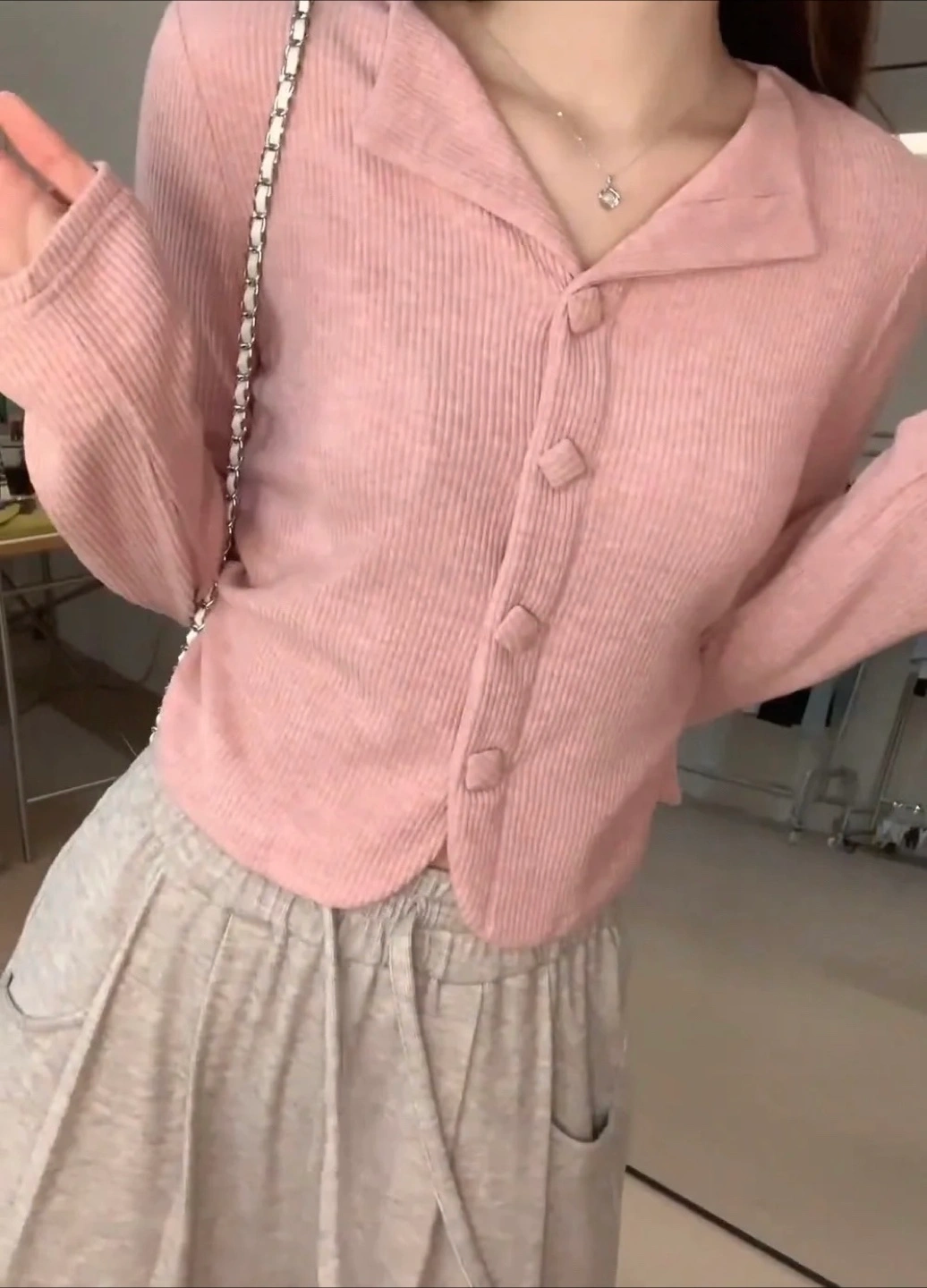 Comfortable two-piece outfit. Features a pink ribbed button-down top and relaxed-fit grey pants, waist 60-100cm. Long sleeves, casual style. Perfect for lounging or running errands. DT pickup only