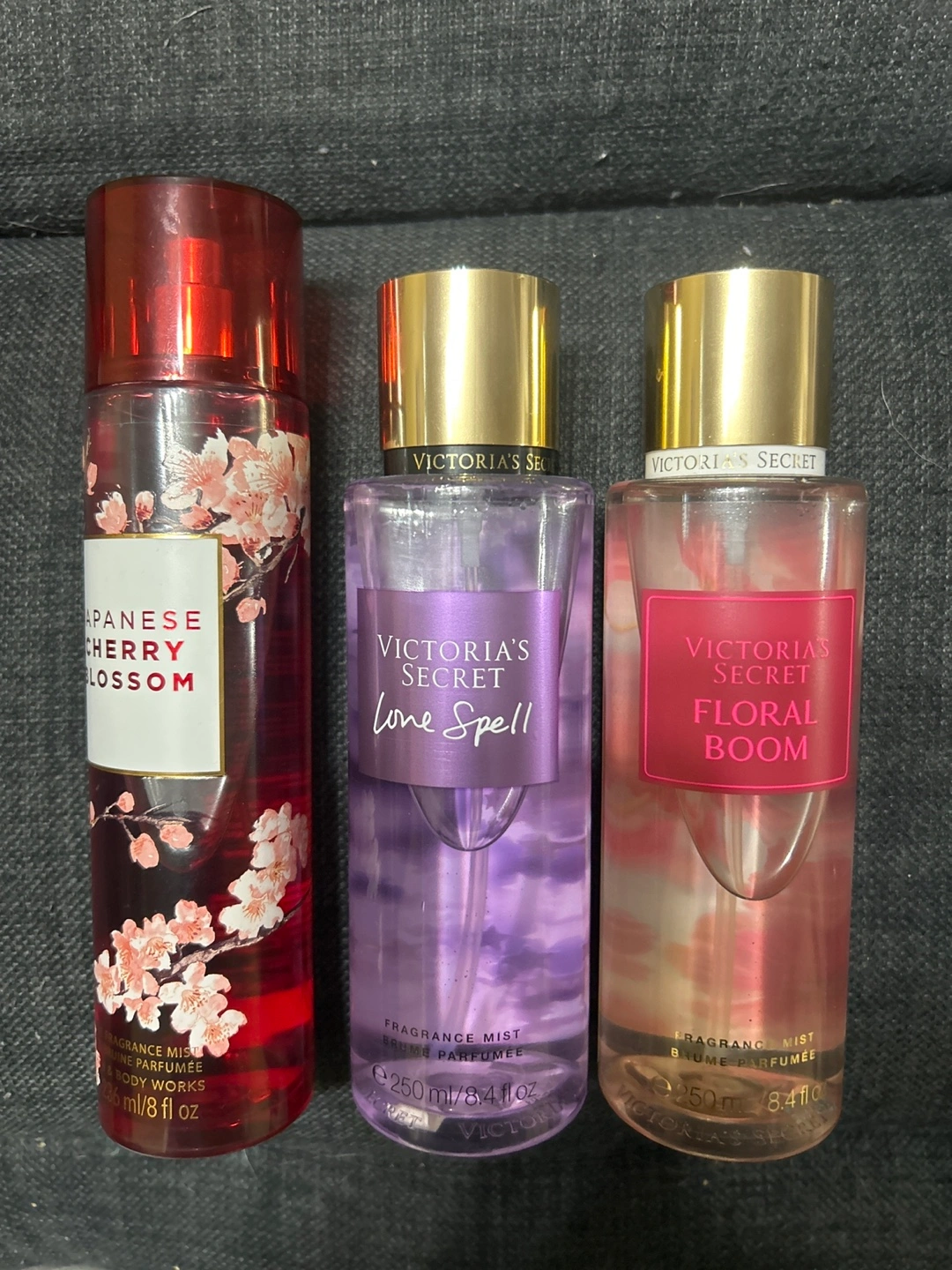 Two Victoria's Secret fragrance mists and one Bath and Body Works. Japanese Cherry Blossom, Love Spell, and Floral Boom. 250 ml each.