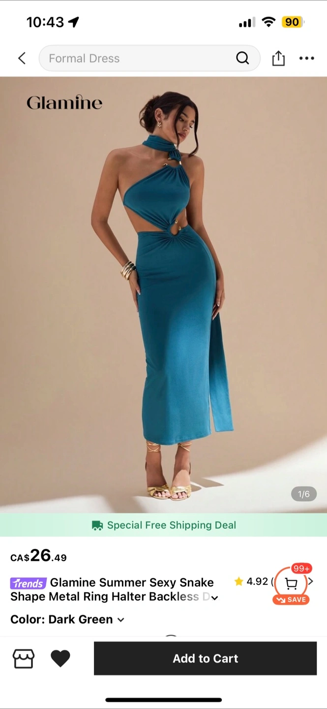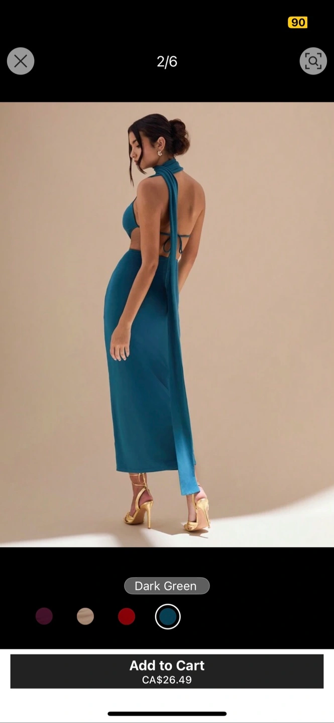 Dark green halter neck midi dress. Cut-out detailing. Metal ring accents. Flowy fabric. Suitable for formal occasions.