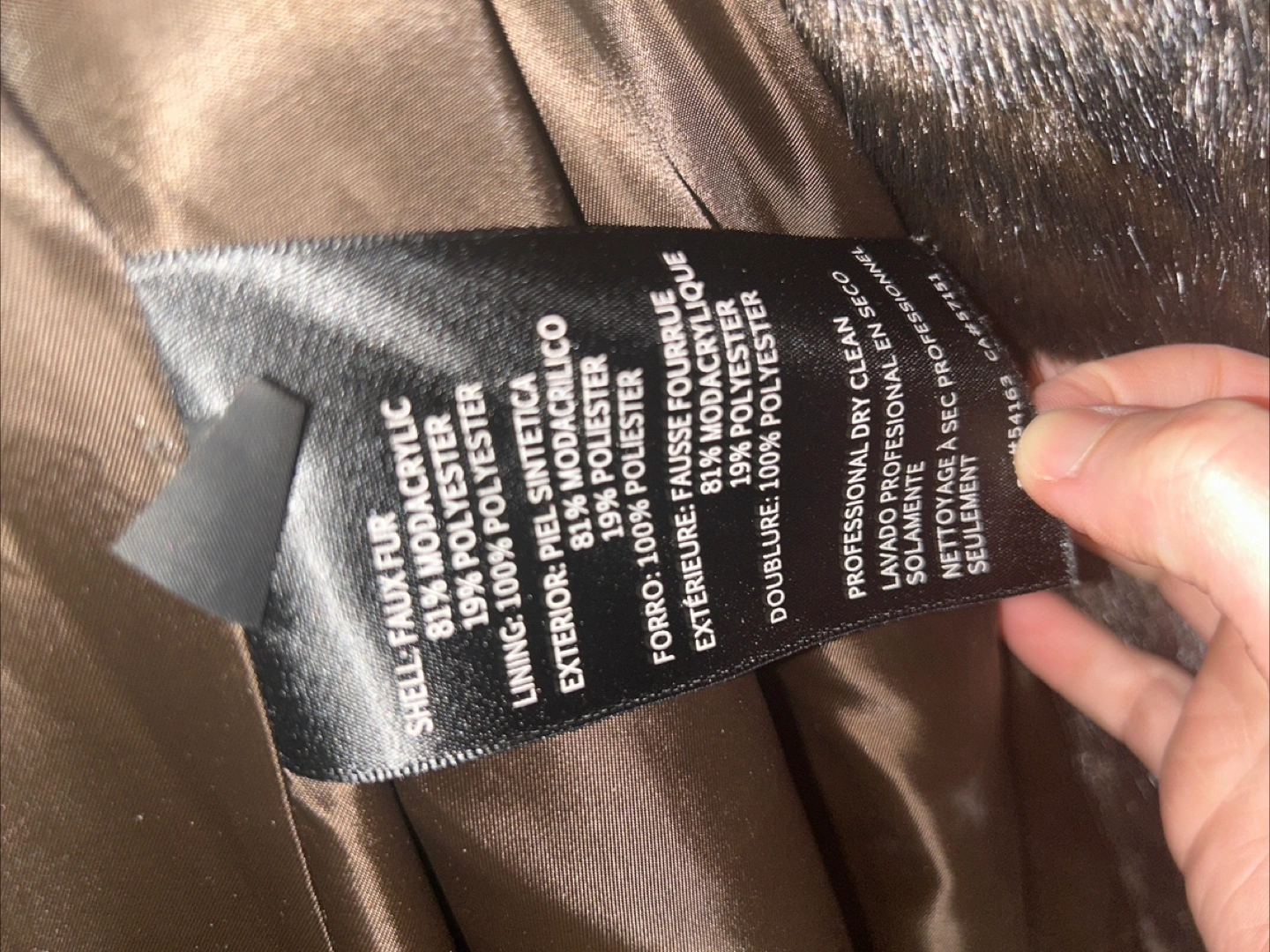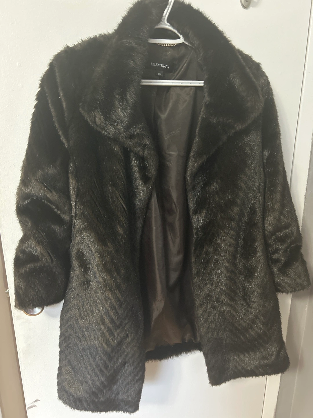 Gorgeous black faux fur coat. Size L/G. Chevron pattern. Long sleeves. Soft and warm. Professional dry clean only.