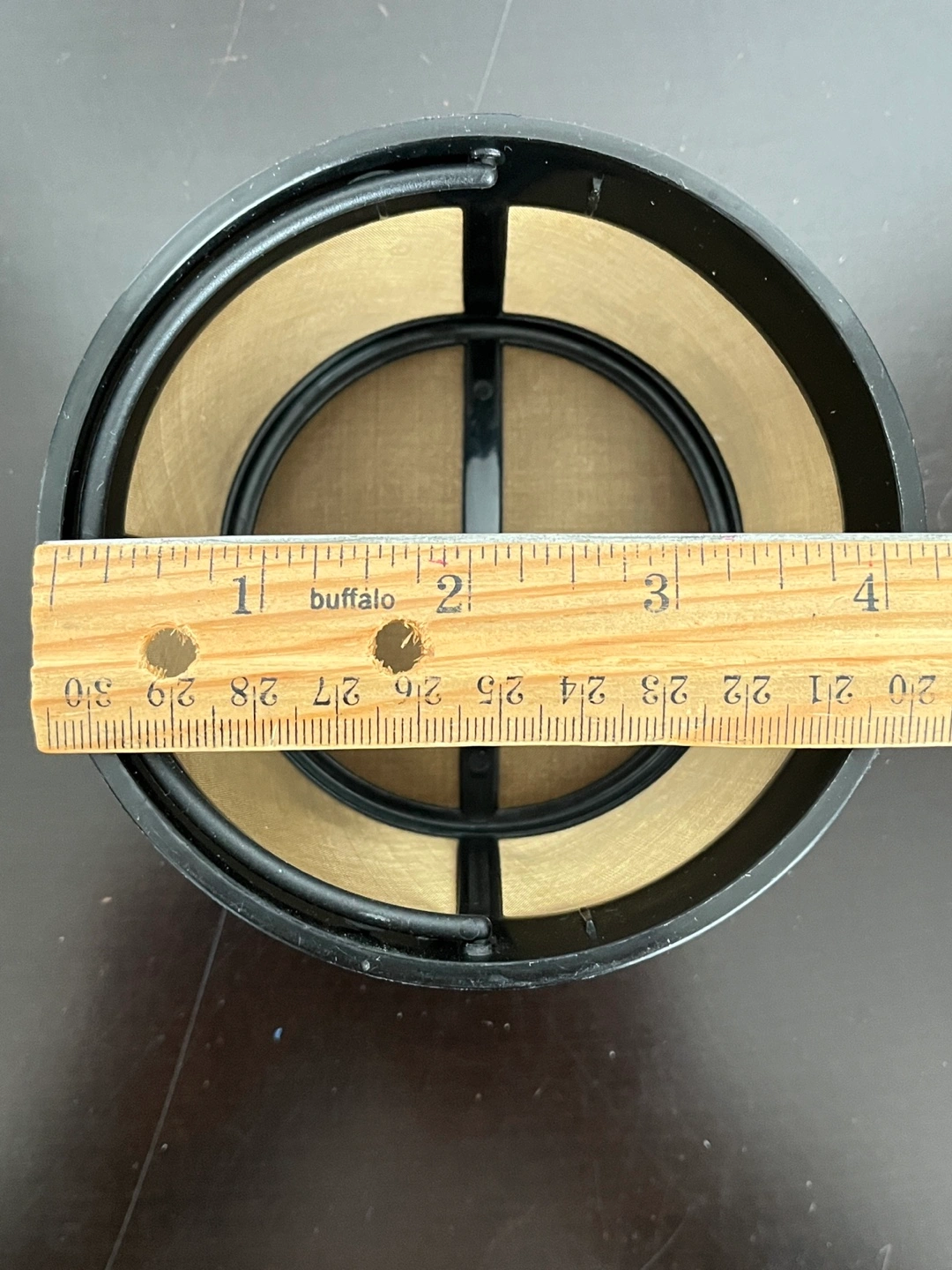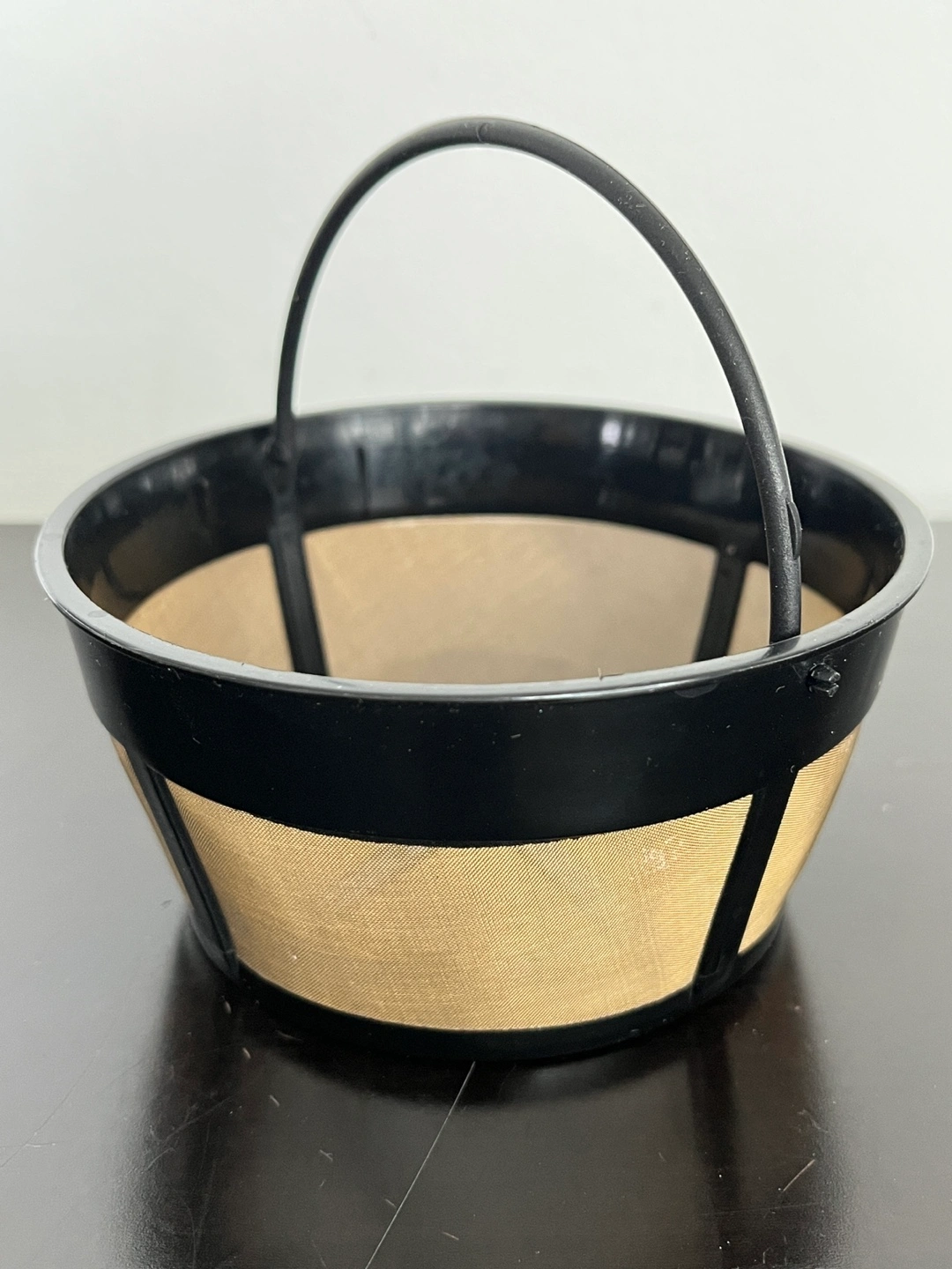 Reusable gilded coffee filter. Approximately 3 inches in diameter.