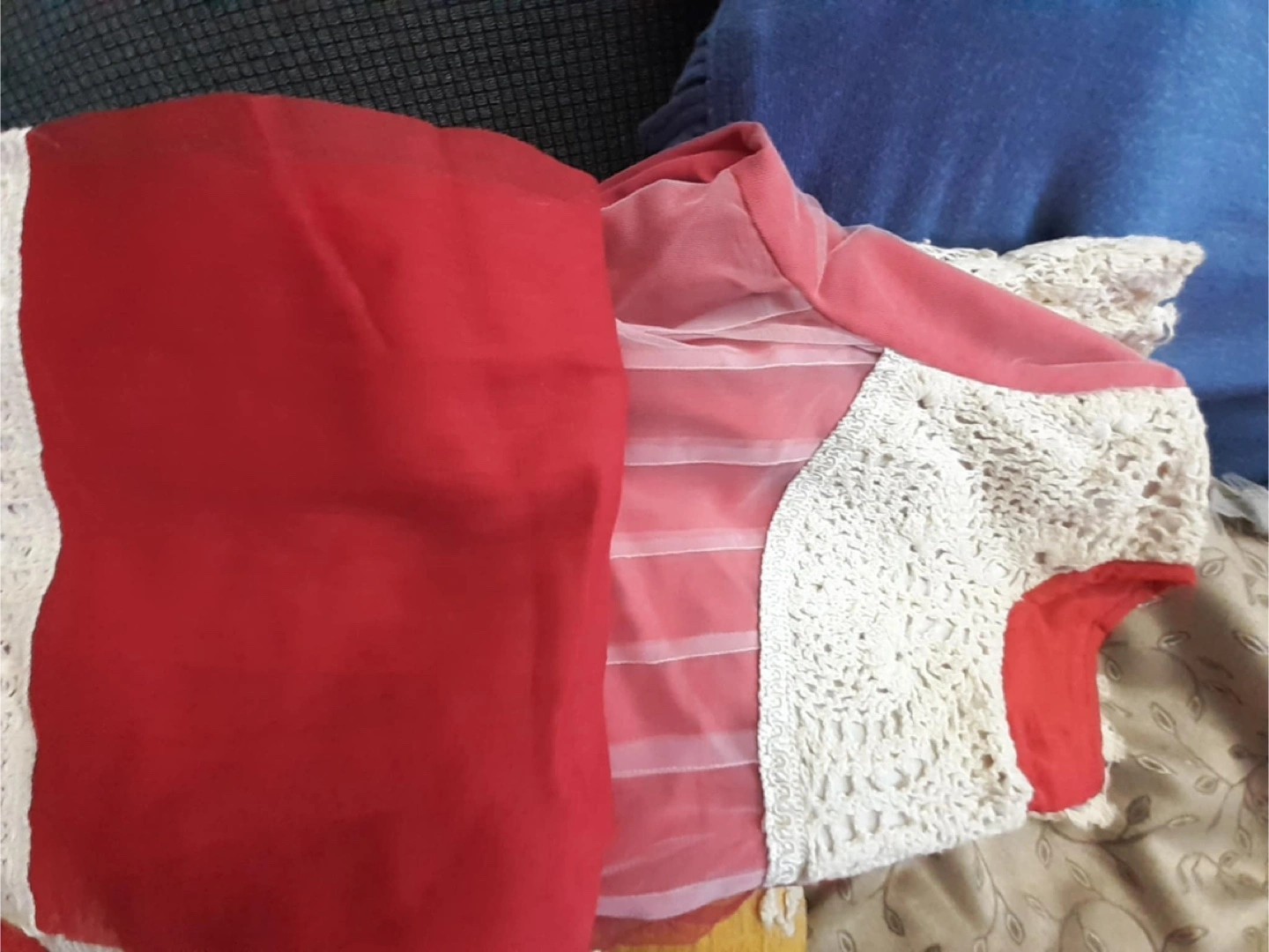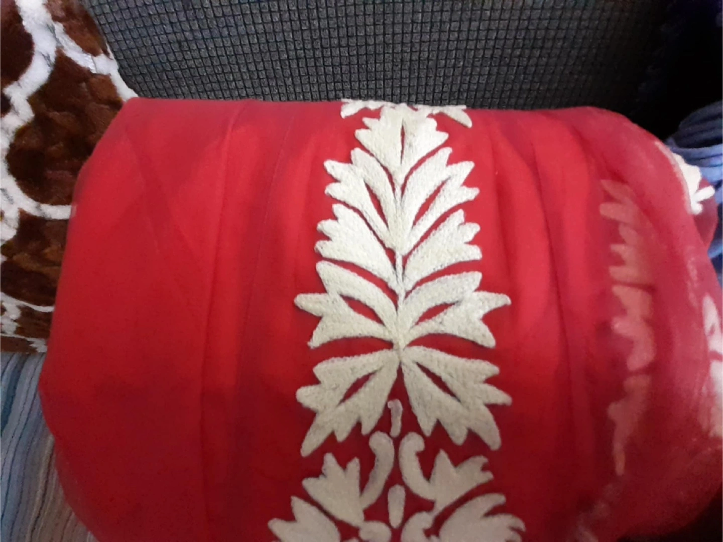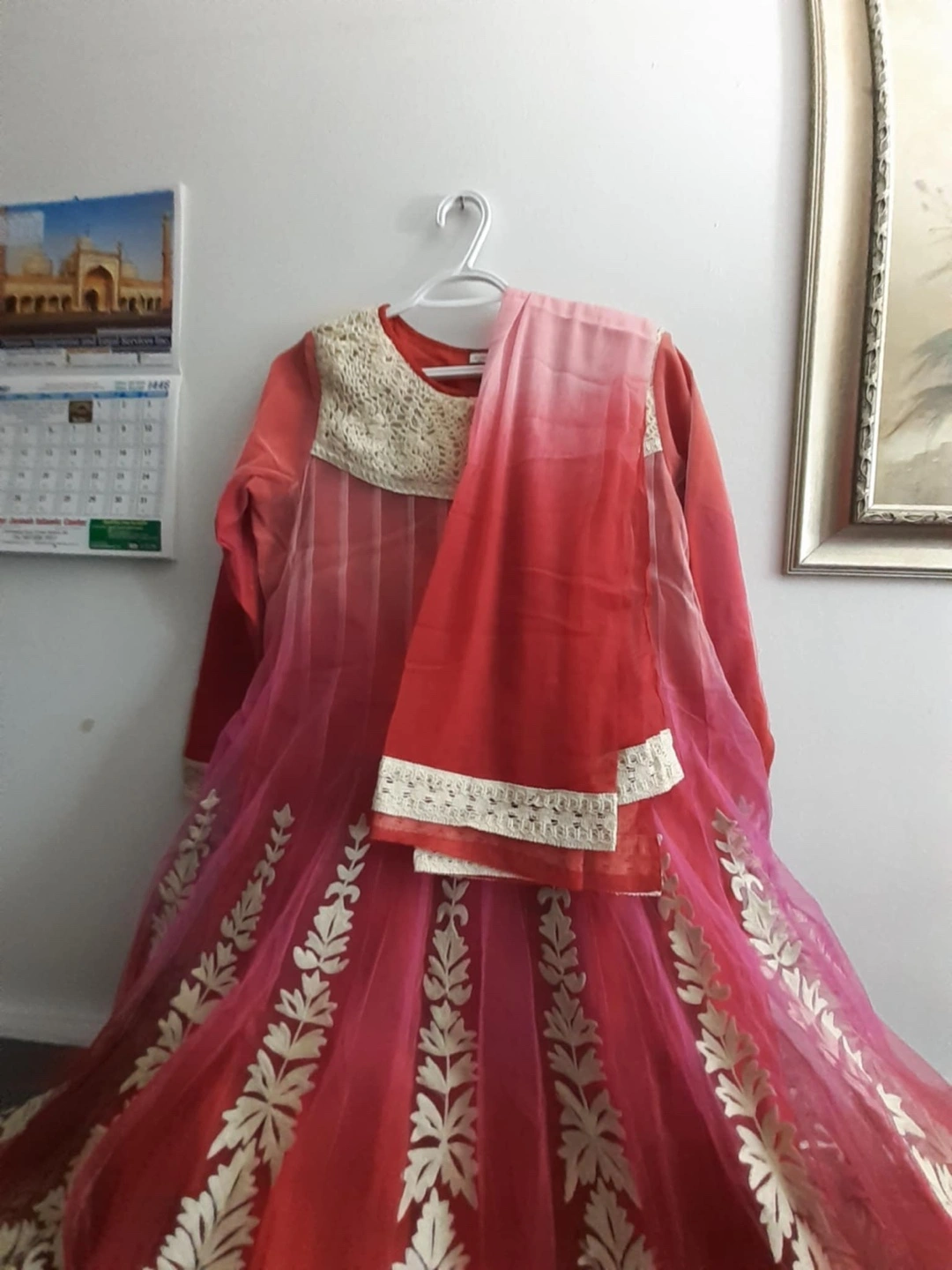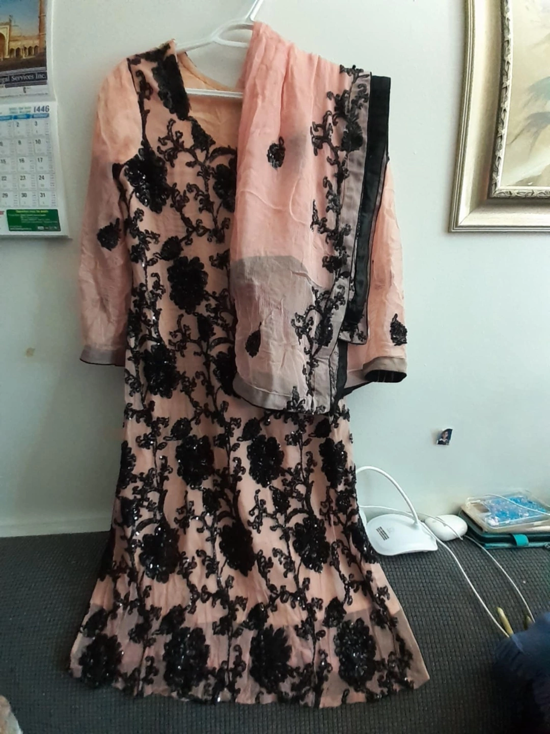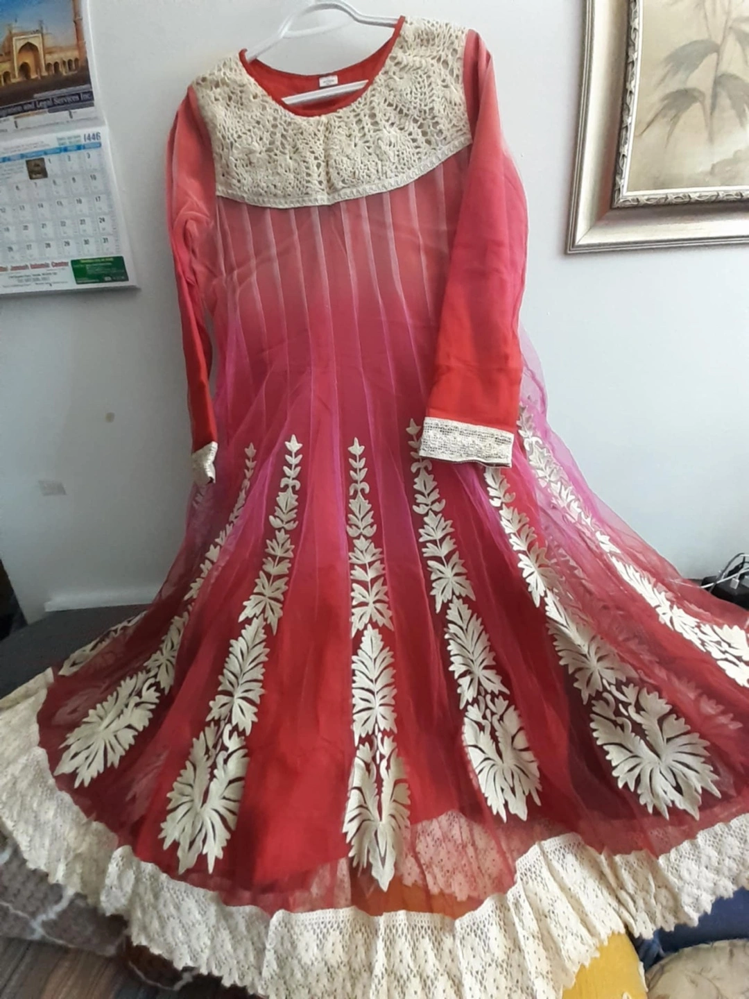 Beautiful red and pink ombre shalwar kameez. Features intricate white embroidery. Long sleeves, floor-length. Includes matching dupatta. Elegant and festive mashakaly embroidery 2 pic $45 peach and black embroidery chiffon material heavy work 2 pic $45 pick up Markham and Lawrence
