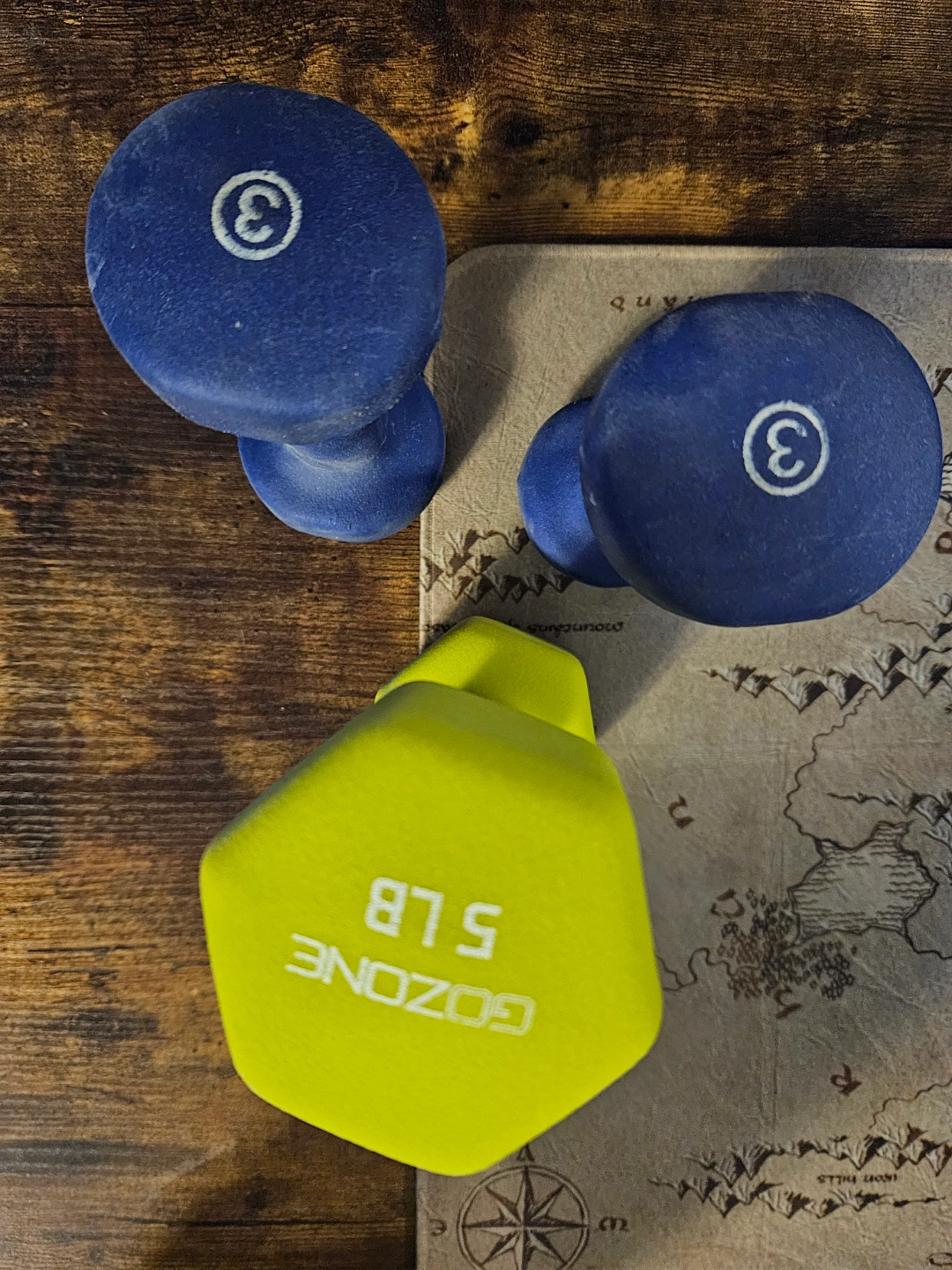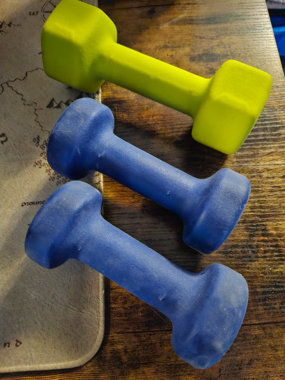 Set of three used dumbbells. Two blue 3lb dumbbells. One yellow 5lb dumbbell. Good for home workouts. Minor wear. Located King St W & Dufferin St area. See my other listings.