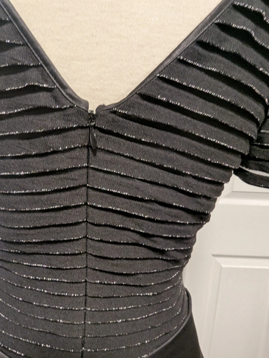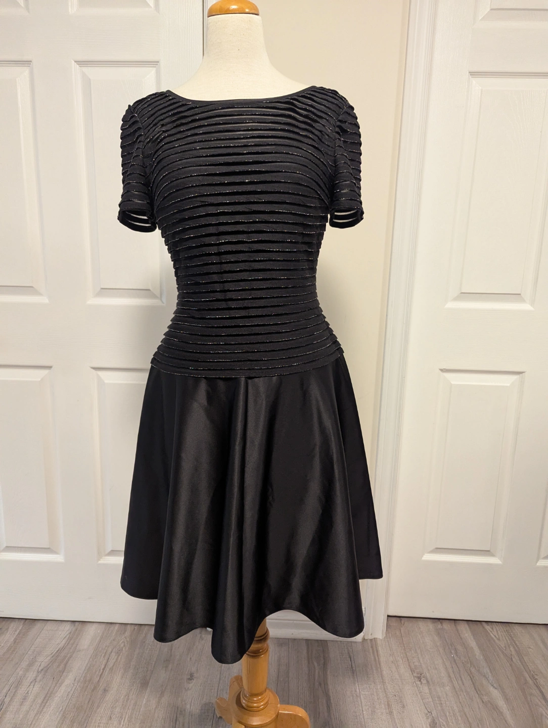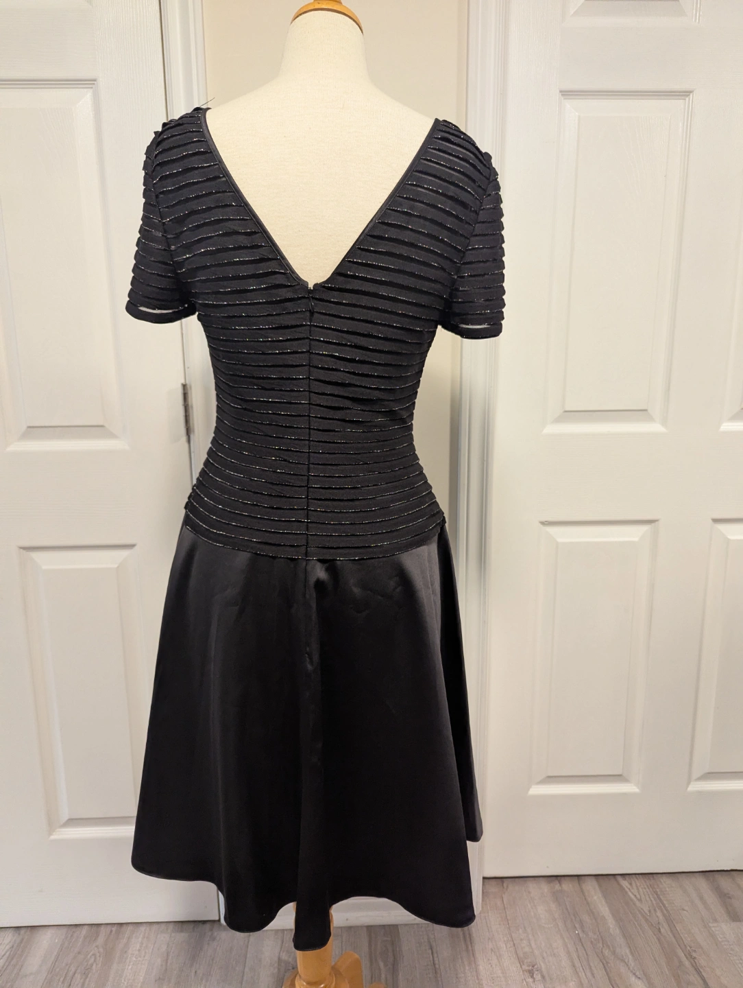 Elegant black cocktail dress. Features a fitted bodice with sequin detail and a flared satin skirt. Short sleeves. Back zipper closure. Perfect for a special occasion. used one time in excellent condition