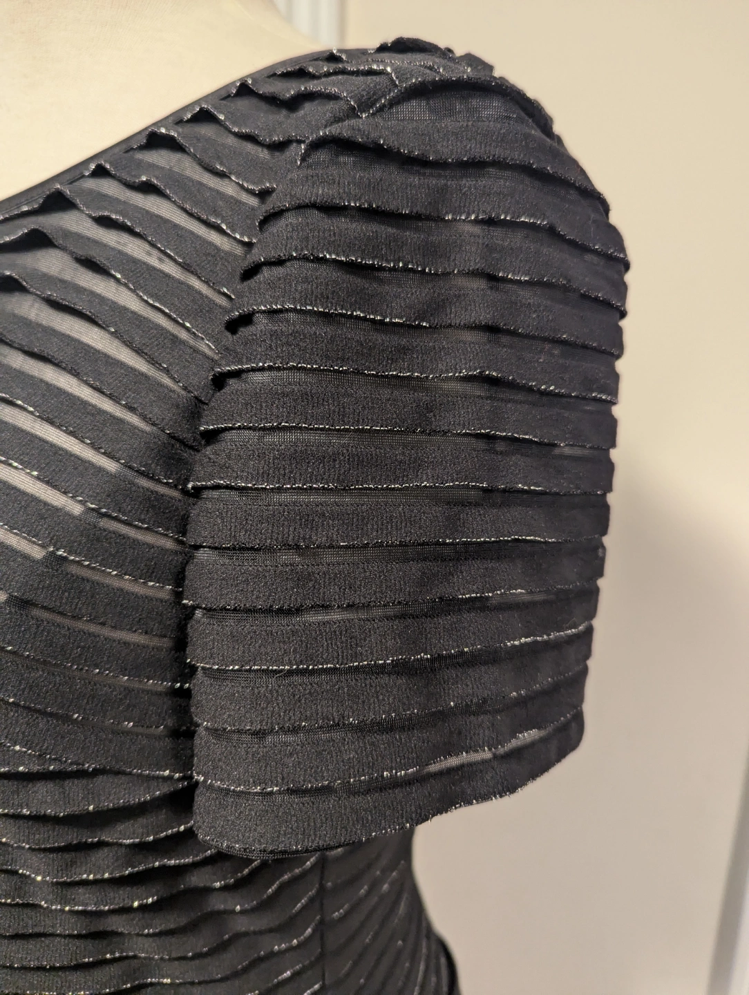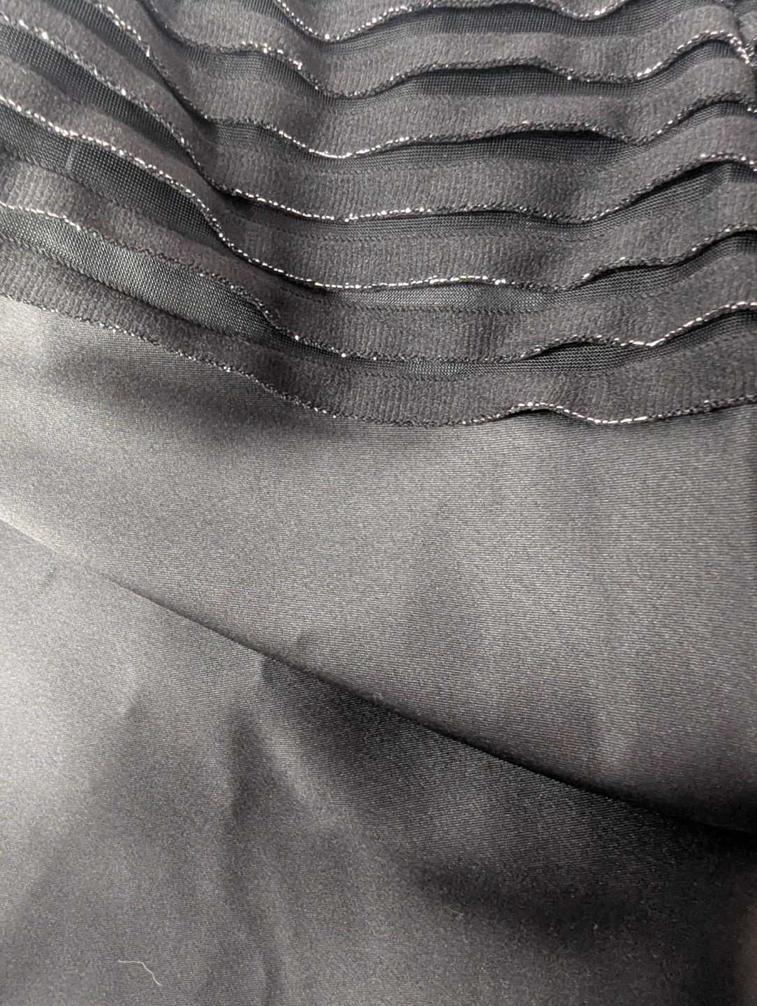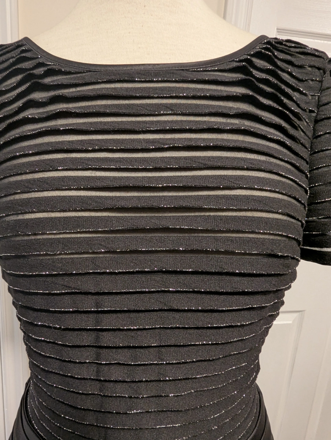Elegant black cocktail dress. Features a fitted bodice with sequin detail and a flared satin skirt. Short sleeves. Back zipper closure. Perfect for a special occasion. used one time in excellent condition