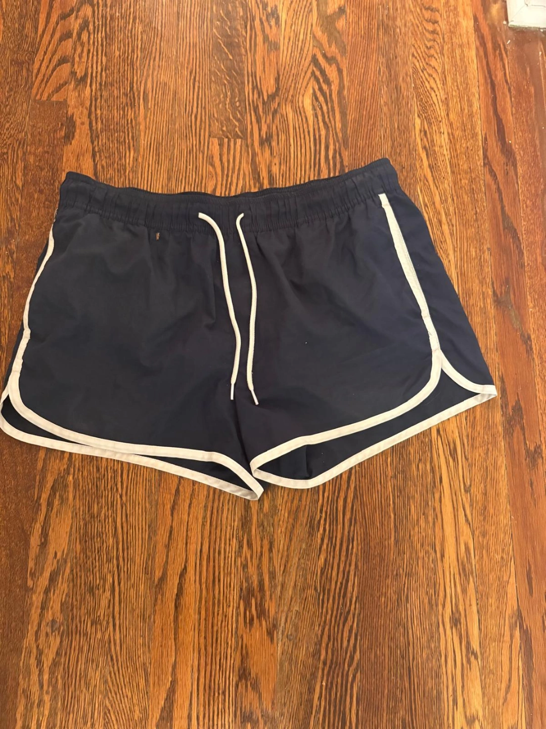 Women's navy blue shorts. Elastic waistband with drawstring. White piping detail. Great for summer.