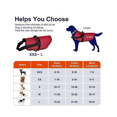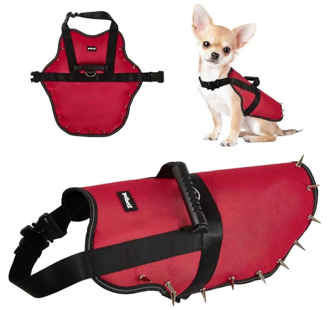 Small red dog harness. Features spikes along the bottom edge. Black straps and handle. Size XSS. Good for small dogs.