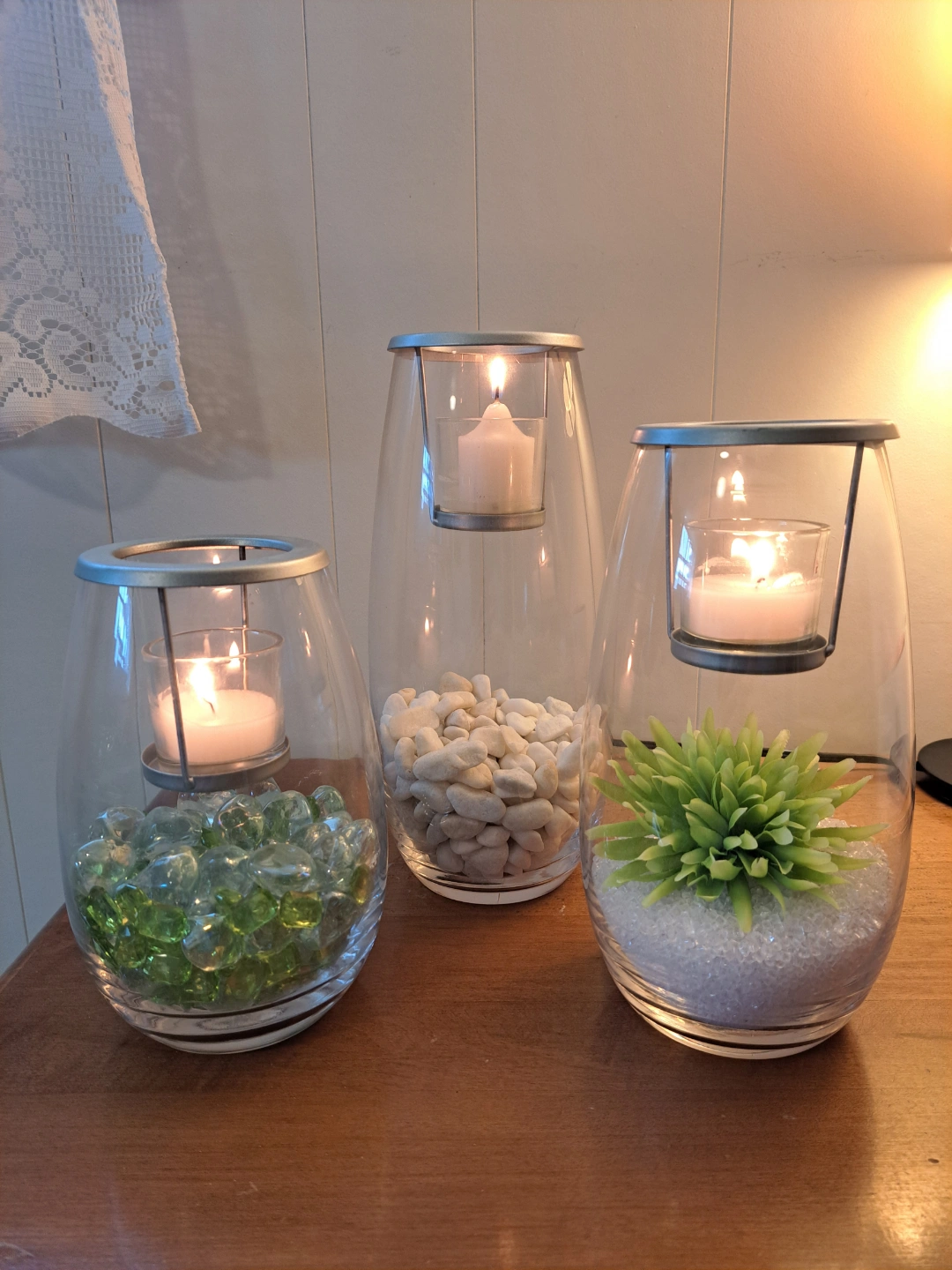 Add a warm, decorative touch to any room with this set of three PartyLite glass candle holders/ vases, perfect for creating a cozy and inviting ambiance. These decorative pieces feature glass vases with metal accents and come complete with decorative stones, glass beads, and an artificial succulent. They are in good condition and ready to enhance your home Non smoking home Cash only