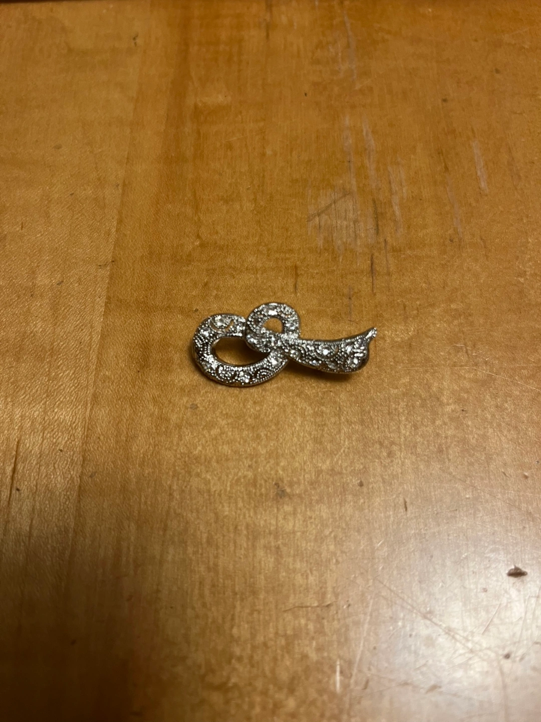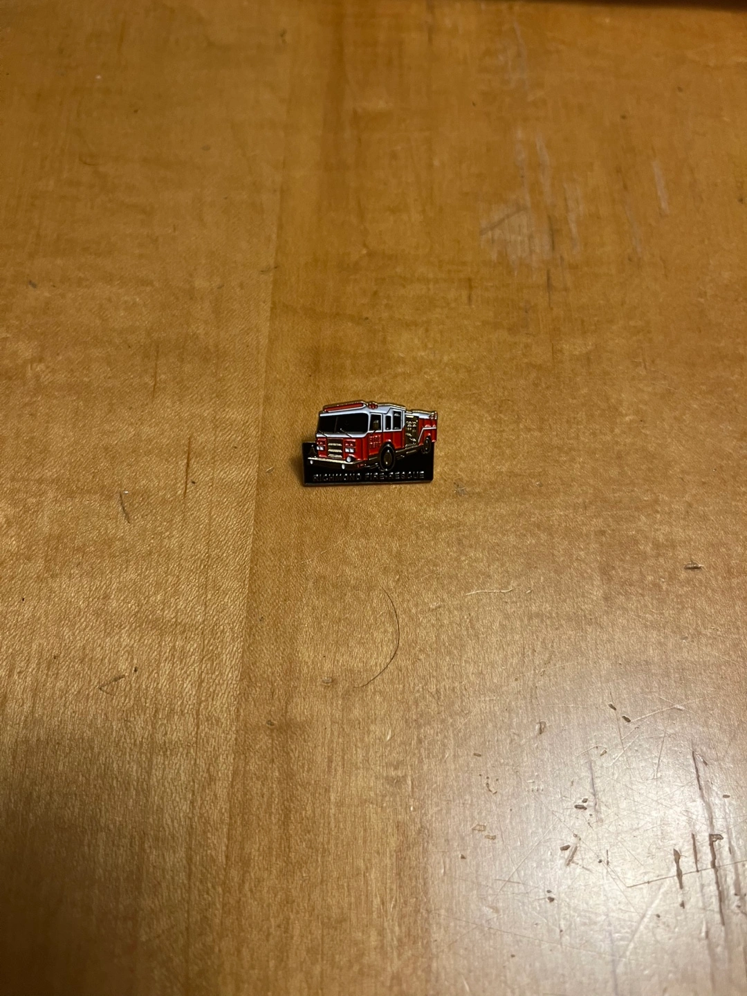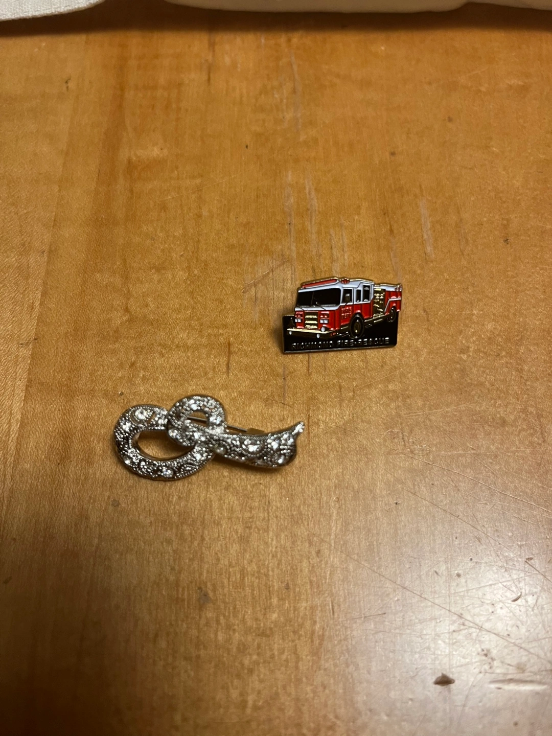 Set of two lapel pins. One features a firetruck graphic, the other a rhinestone ribbon design. Collectible or decorative.