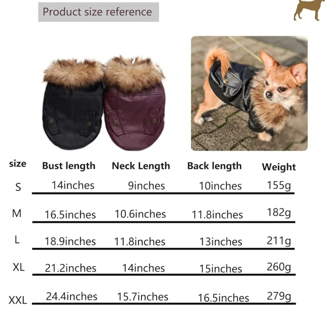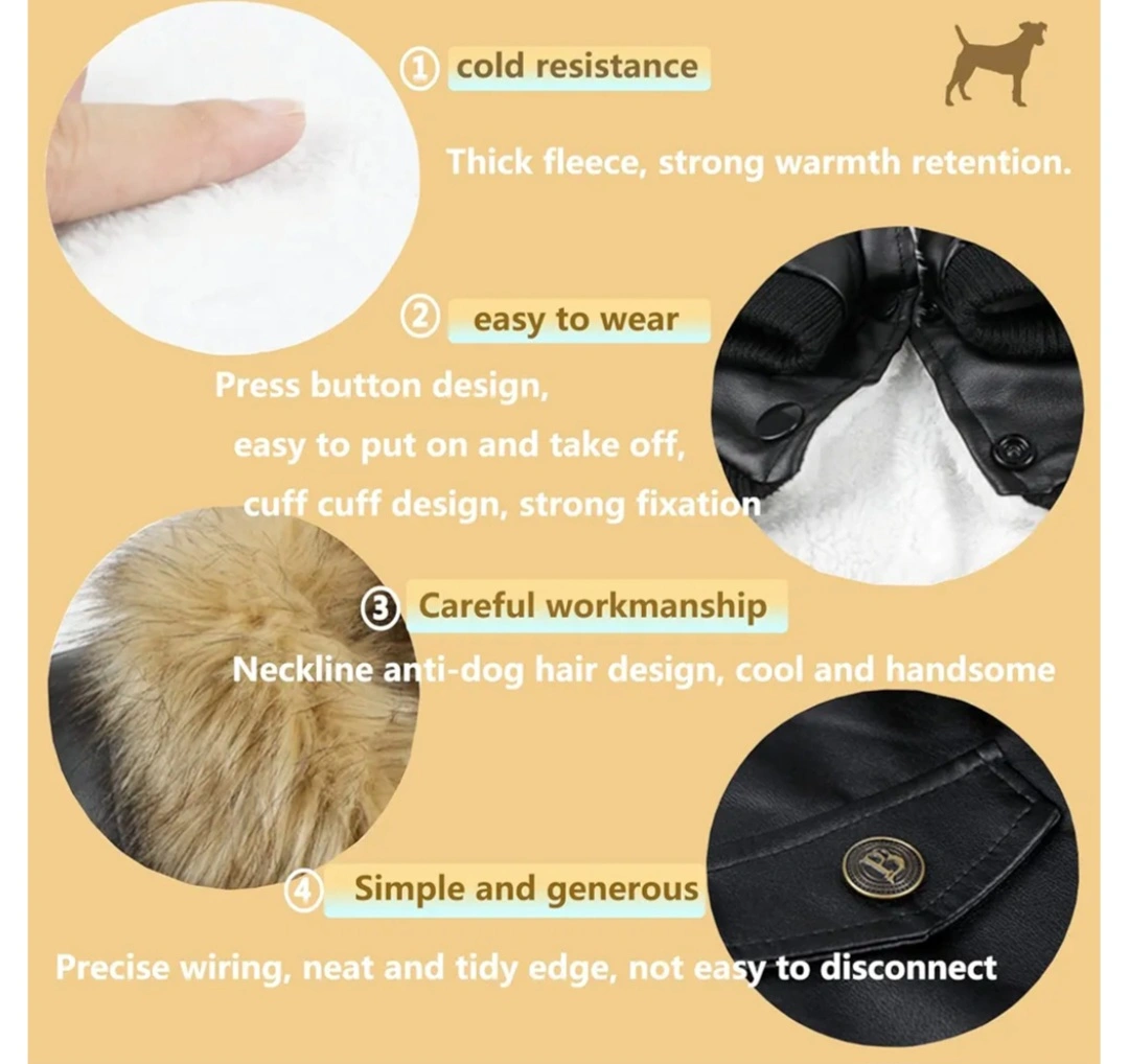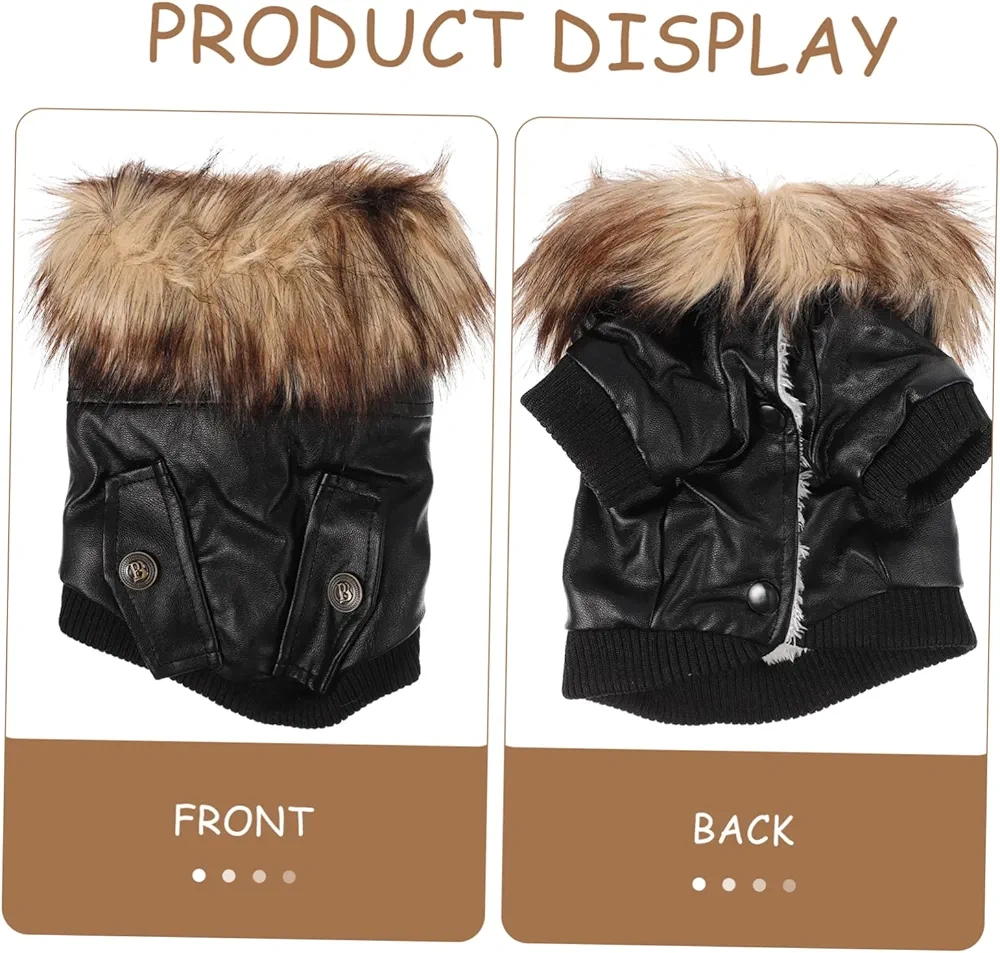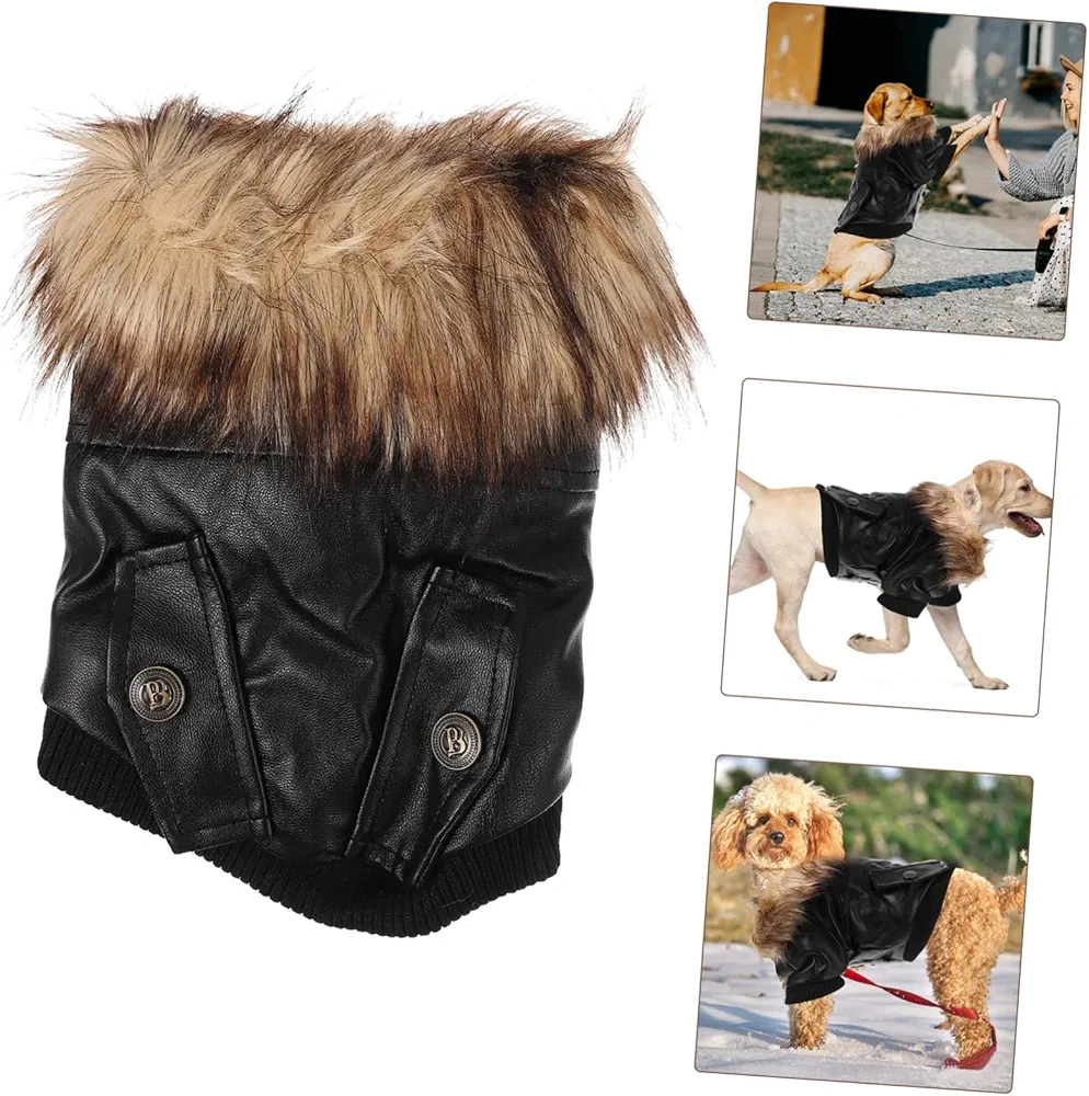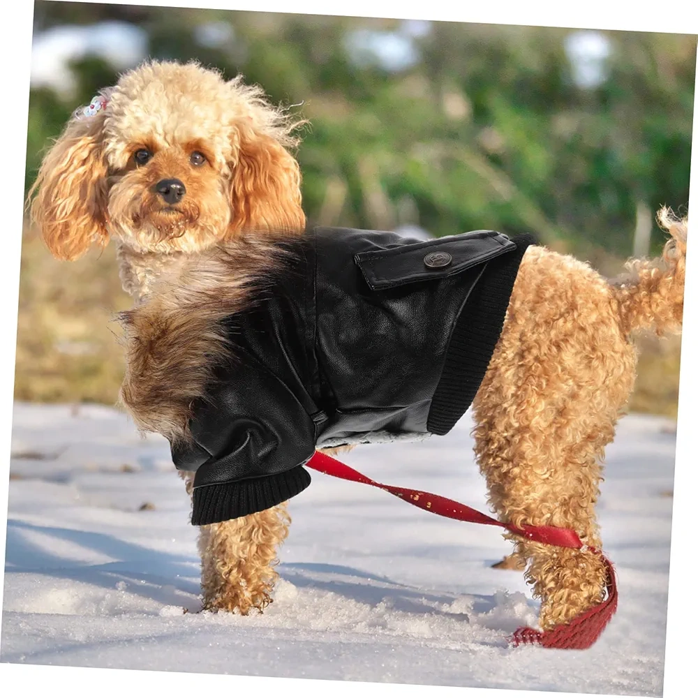 Adorable dog coat. Features faux leather exterior, plush fleece lining, and a warm fur collar. Snap button closure. Perfect for keeping your furry friend warm in cooler weather.