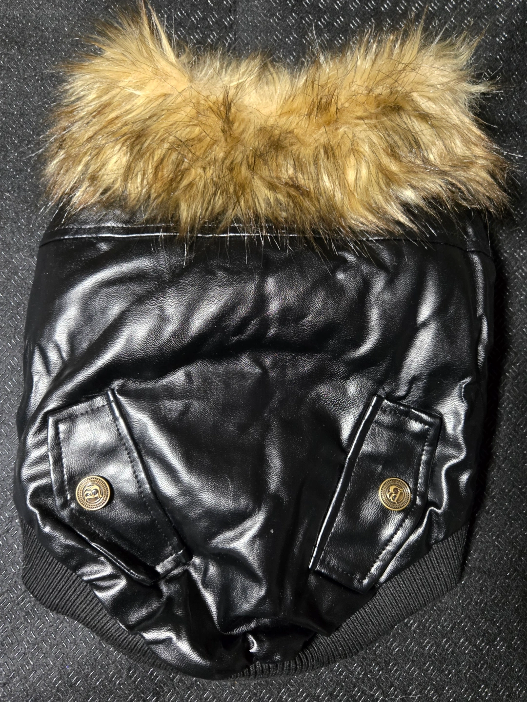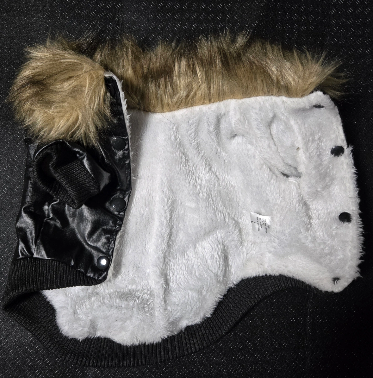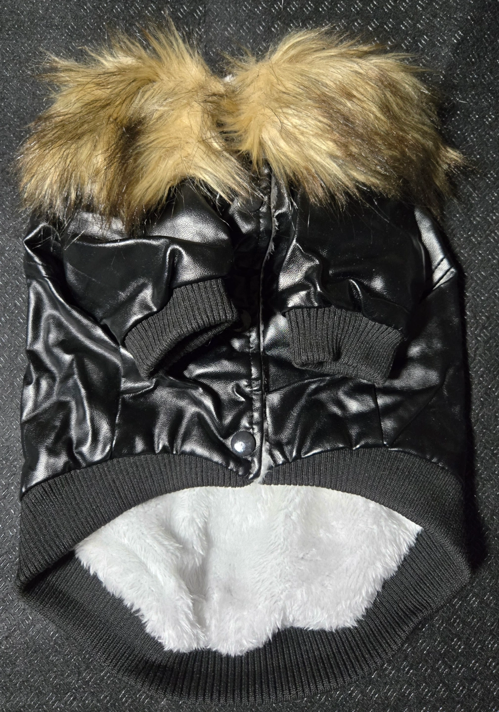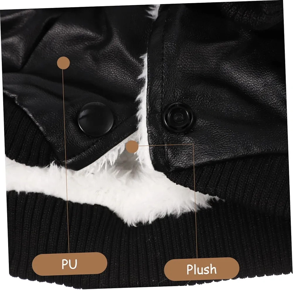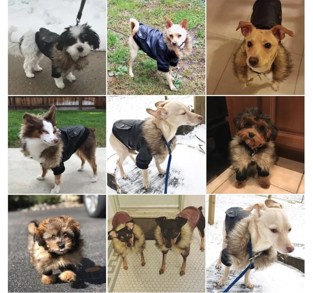 Adorable dog coat. Features faux leather exterior, plush fleece lining, and a warm fur collar. Snap button closure. Perfect for keeping your furry friend warm in cooler weather.