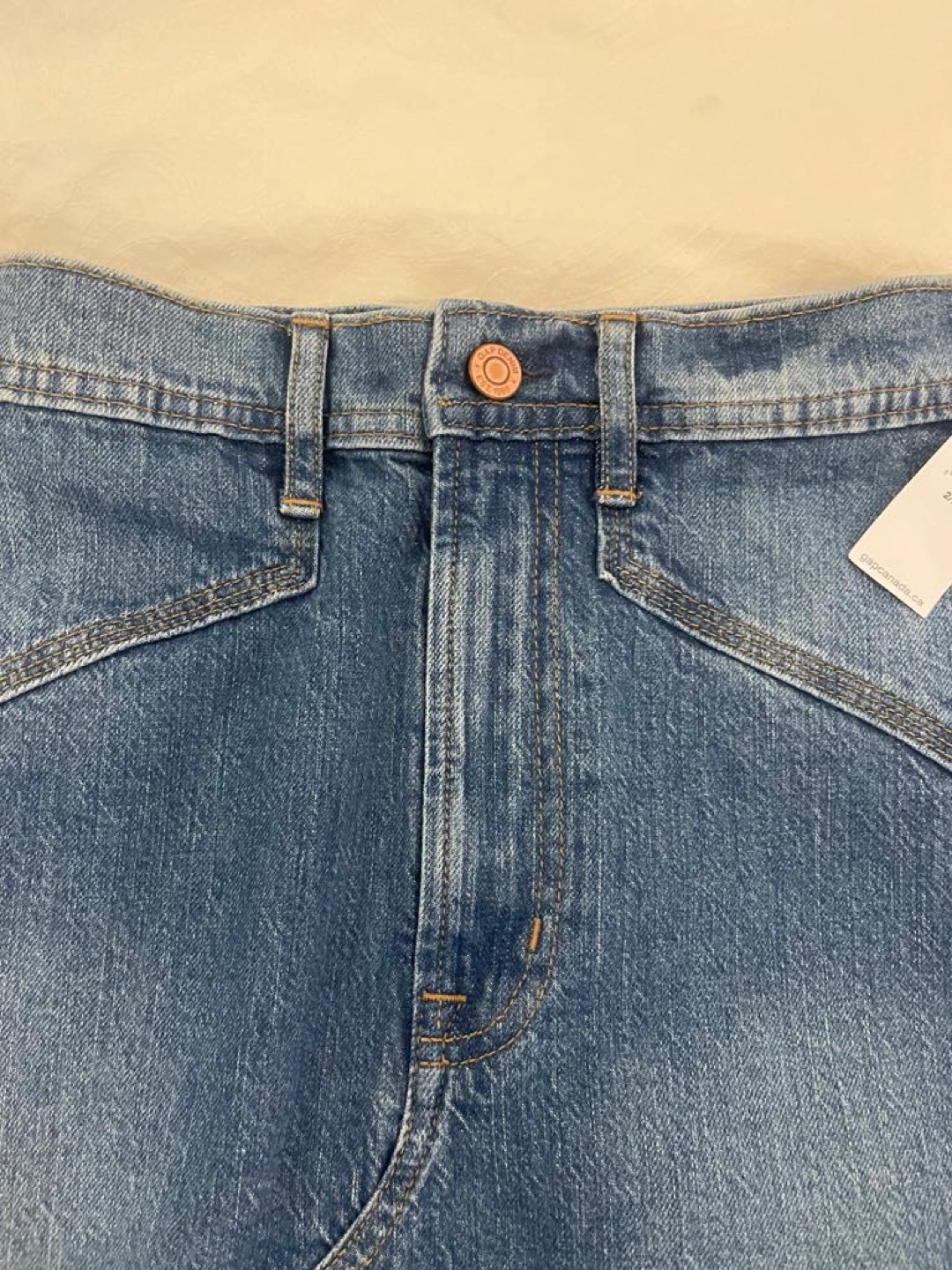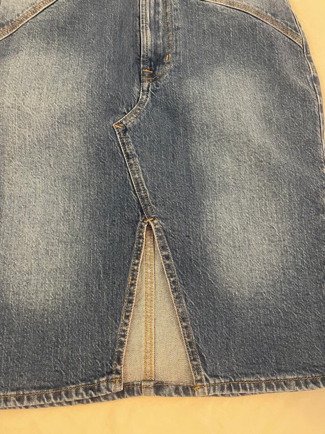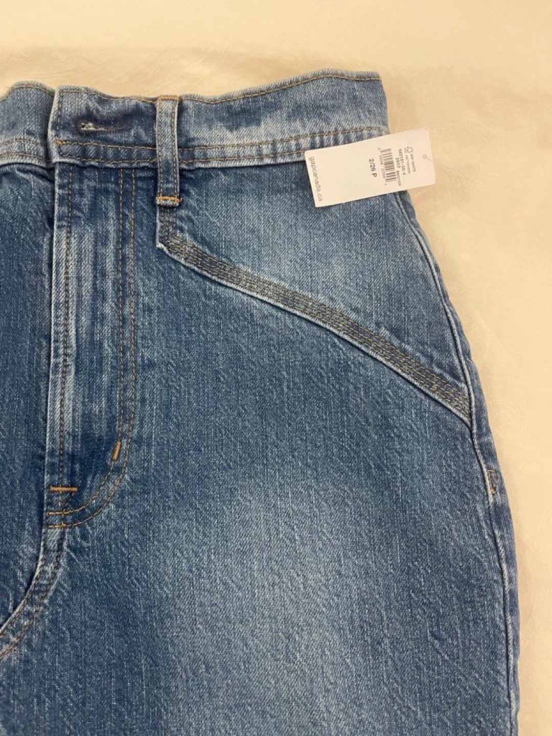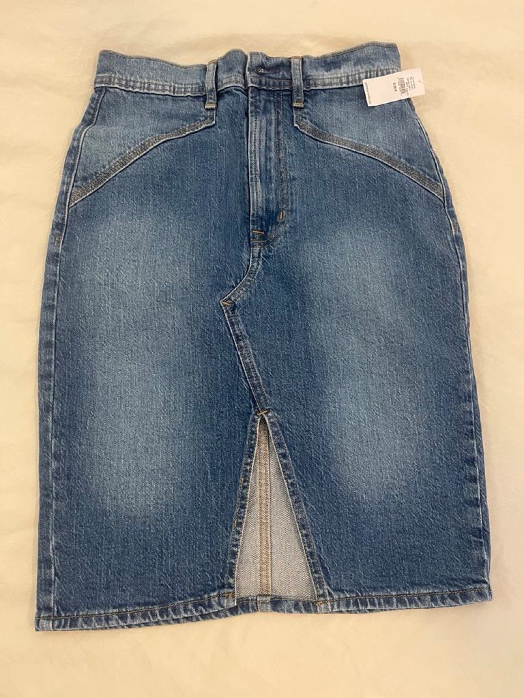 Gap Blue denim mini skirt. Features a front slit and unique stitching detail. Size 26P. New with tags.