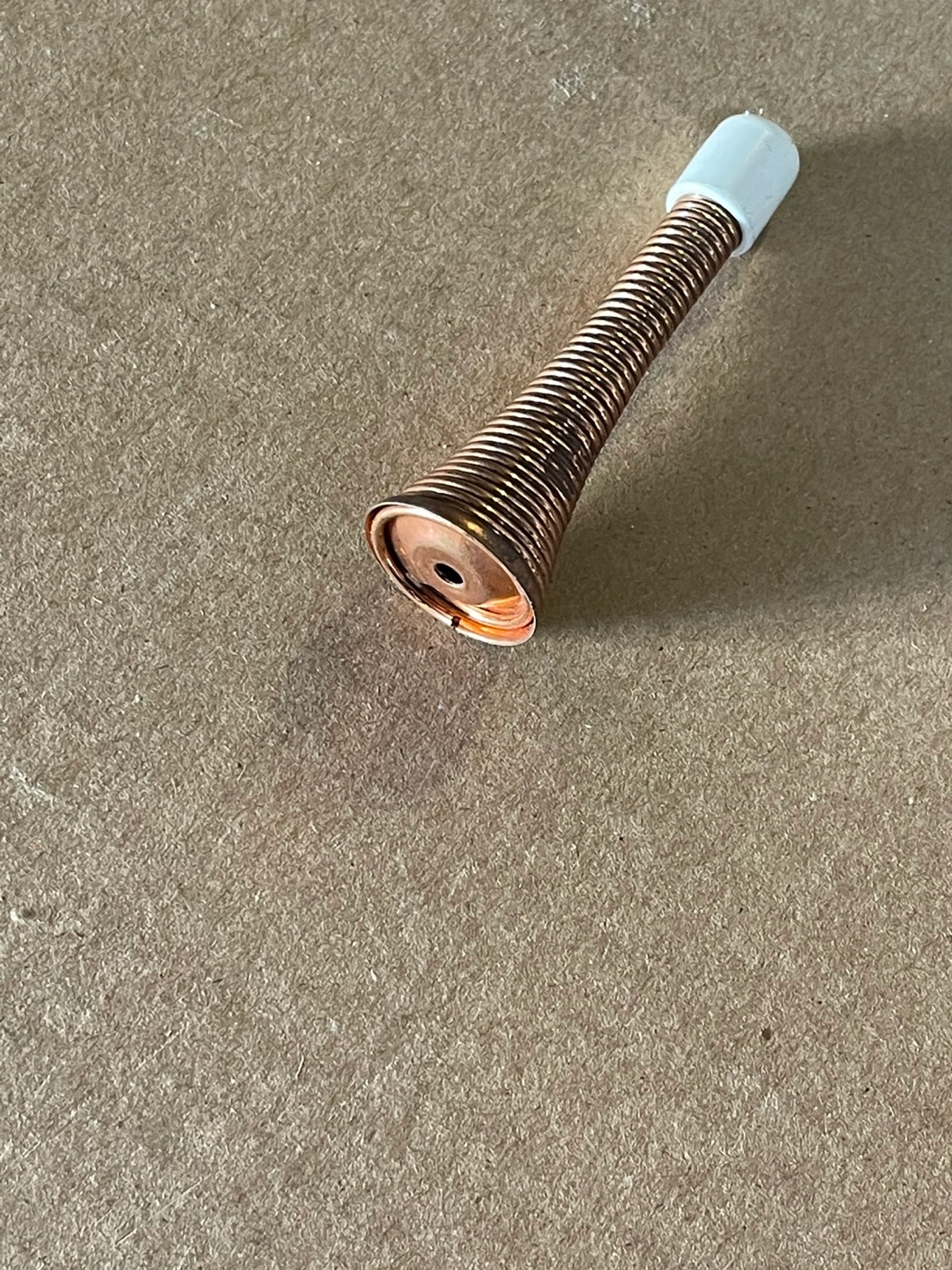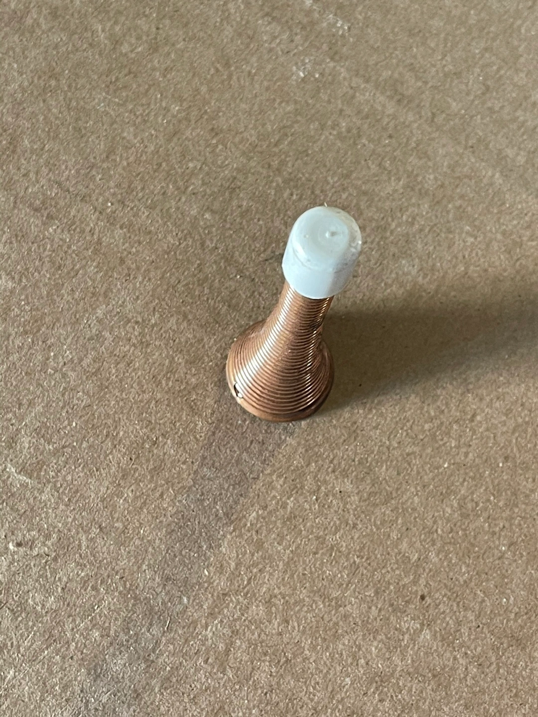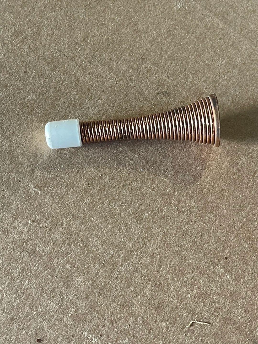 Unique copper coloured spring door stop. Features a white plastic top. Small and discreet.