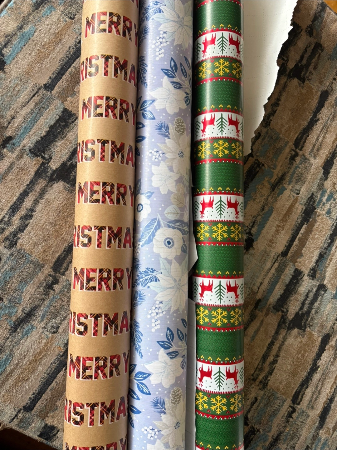 Three rolls of festive wrapping paper. One features a kraft paper background with red plaid "Merry Christmas" text. Another has a light blue floral design. The last roll showcases a green and red Fair Isle pattern with reindeer and snowflakes.
