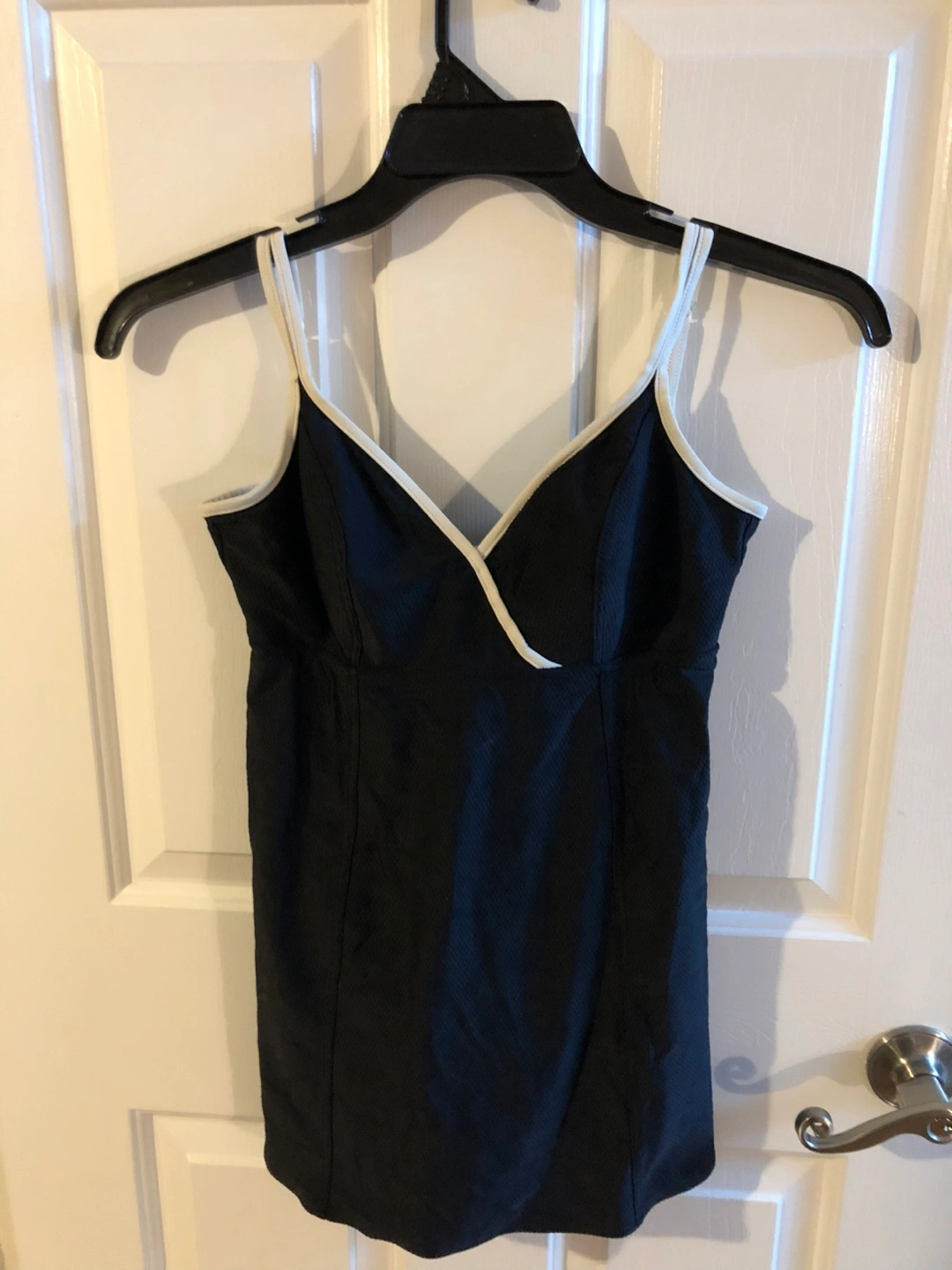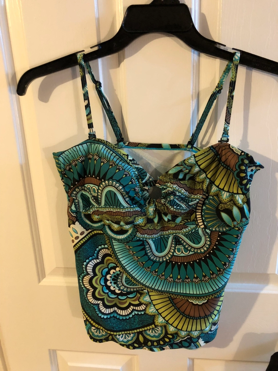 Assorted women's swimwear. Includes a black and white tie-dye one-piece swimsuit, a light purple bikini top, and a multicoloured tankini. Various styles and sizes. Pre-owned. Please ask for different prices