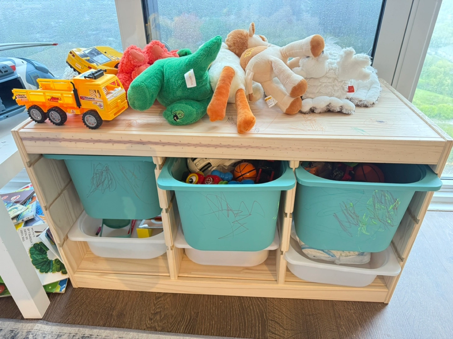 Wooden toy organizer, four storage bins, various toys included. There is color painting can clean it. Scarborough pick up. I will give some toys for presents.