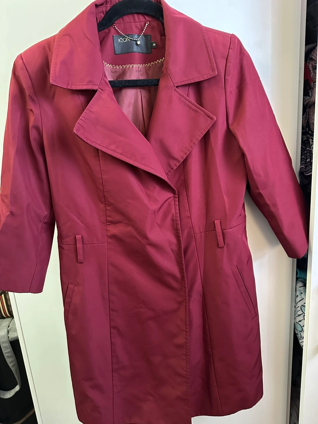 Women's burgundy trench coat. Size 10. Three-quarter sleeves. Two pockets. Lightweight material. Classic style. Pay by cash please