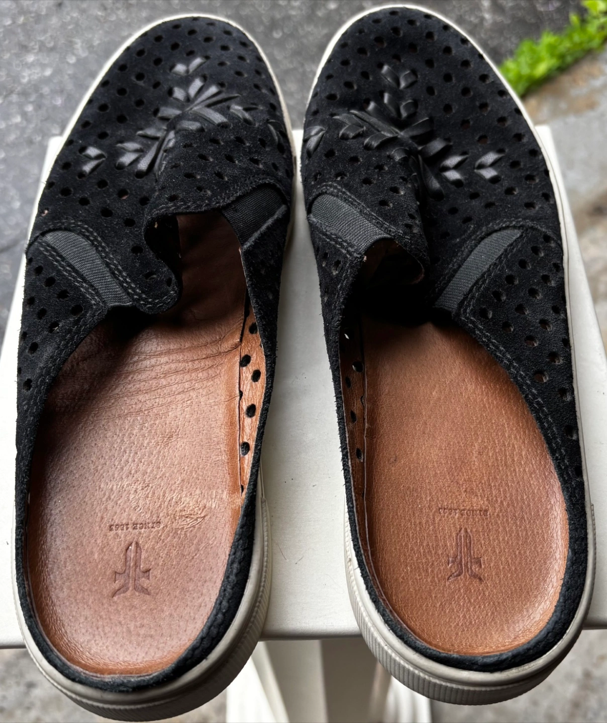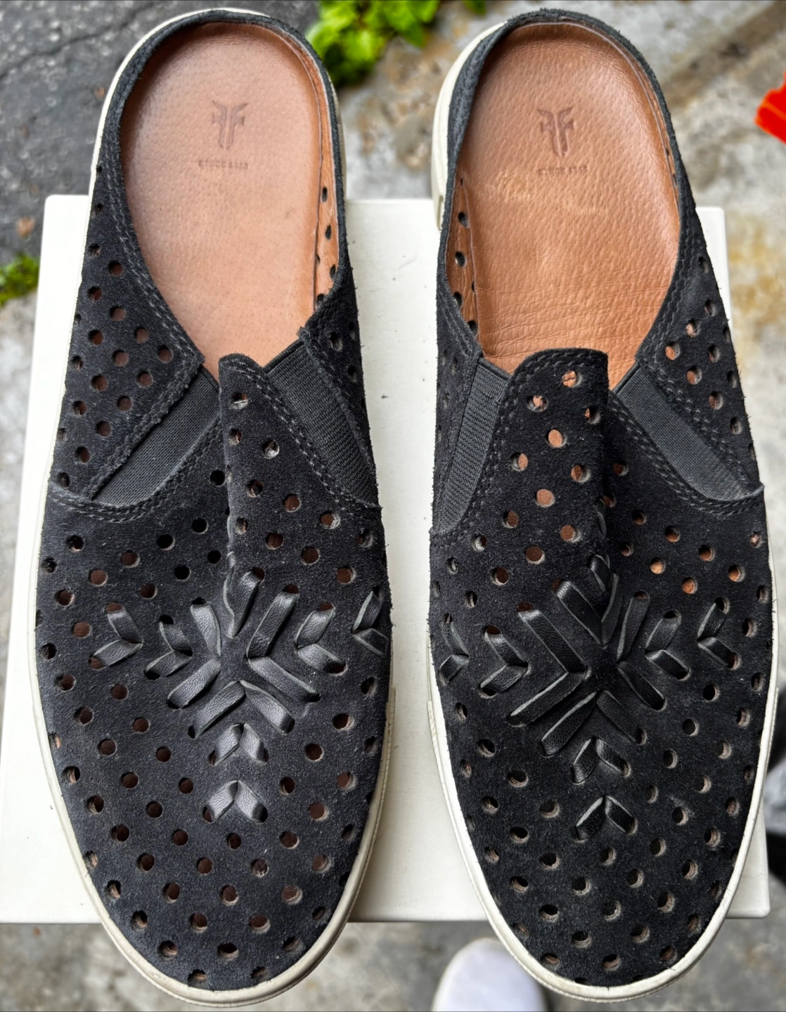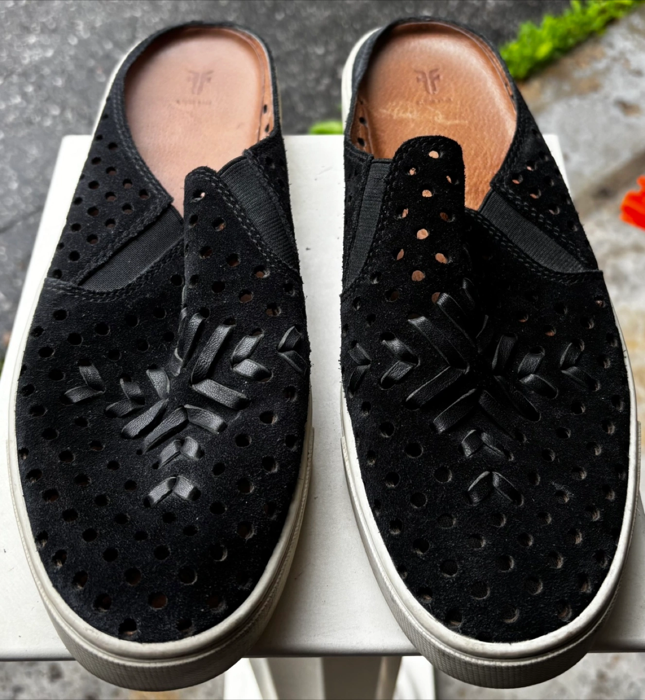 Black suede mules. Perforated design with woven detailing. White rubber sole. Slip-on style. FRYE Sandals Womens Size 9.5 Black Perforated Leather Slides Slip On - Gorgeous Pickup in Richmond Hill. Thanks for checking out our listing, we have over 200 items for sale so don’t forget to look at those and we can offer deal packages on multiple items.